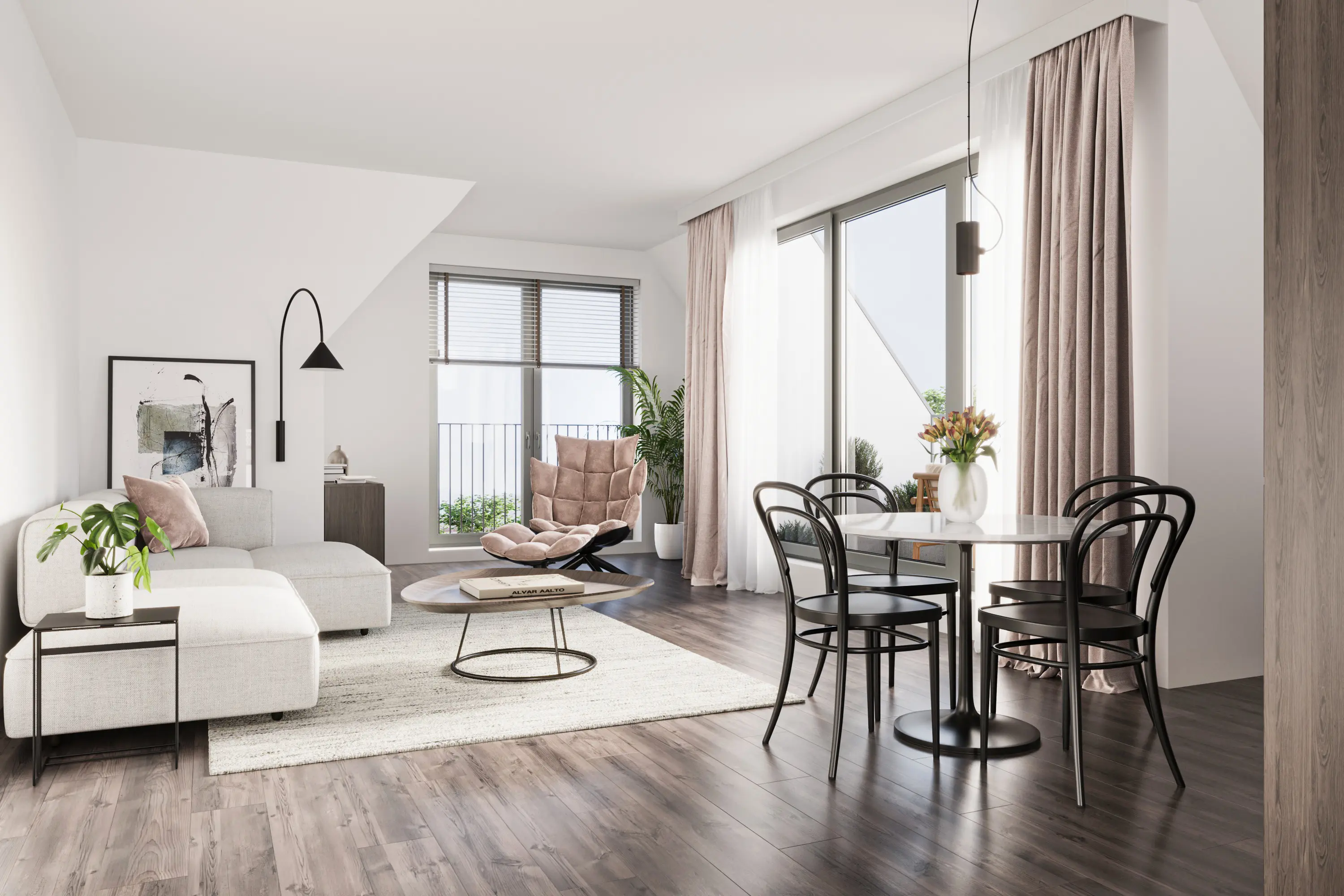 De lichte woonkamer vormt het hart van het appartement en staat in directe verbinding met de loggia, waar je in alle rust kunt genieten van de frisse lucht en het uitzicht. Dankzij de hoekligging valt het daglicht van twee kanten naar binnen, wat zorgt voor een aangename, open sfeer.