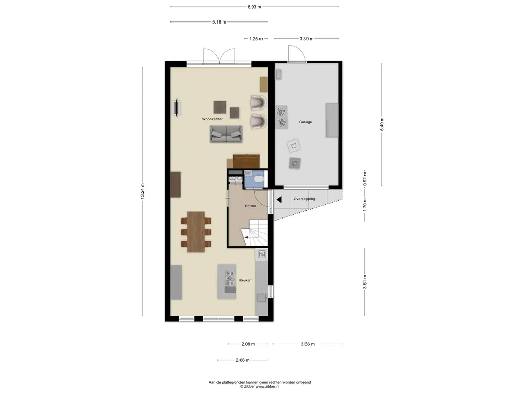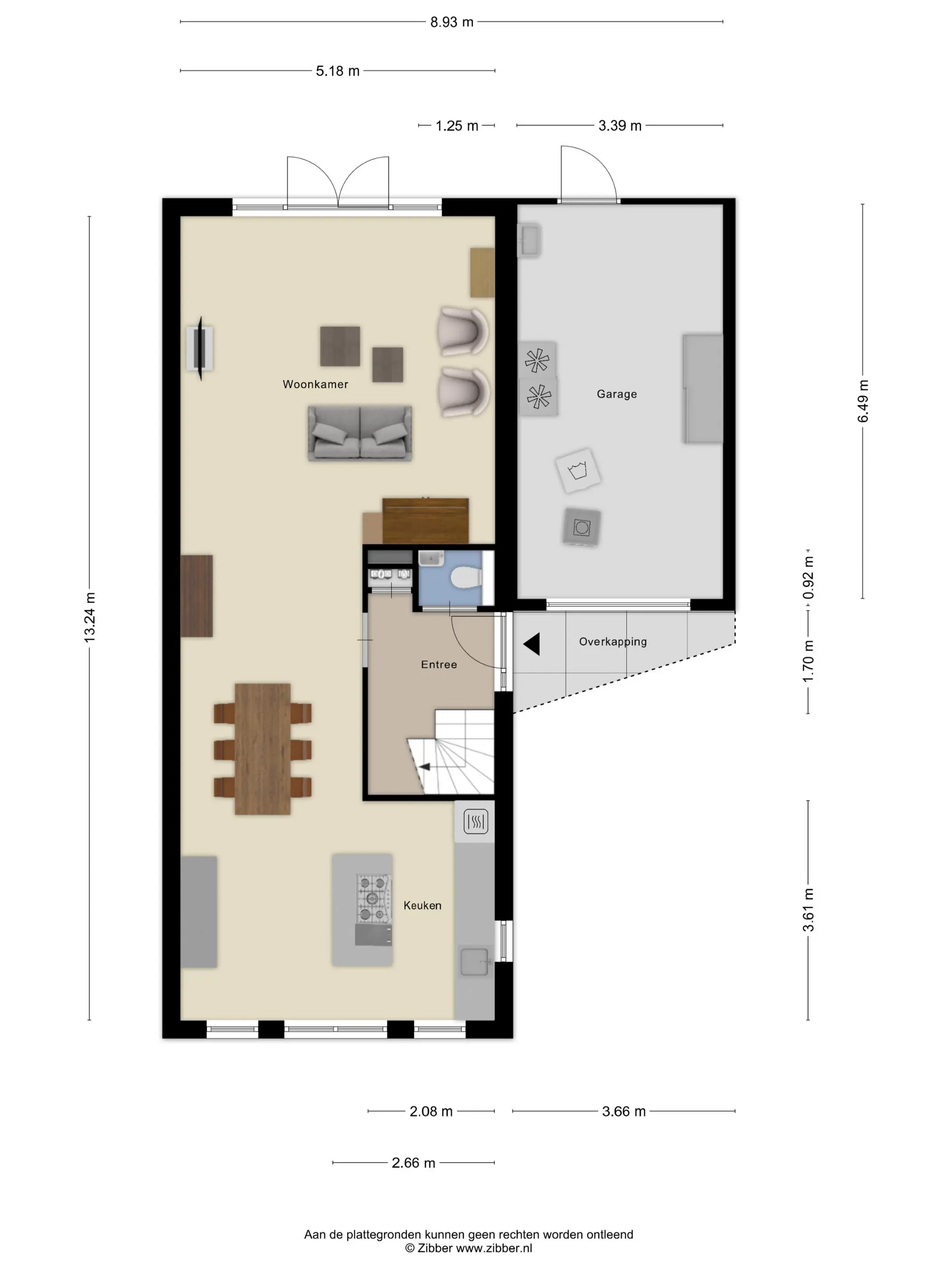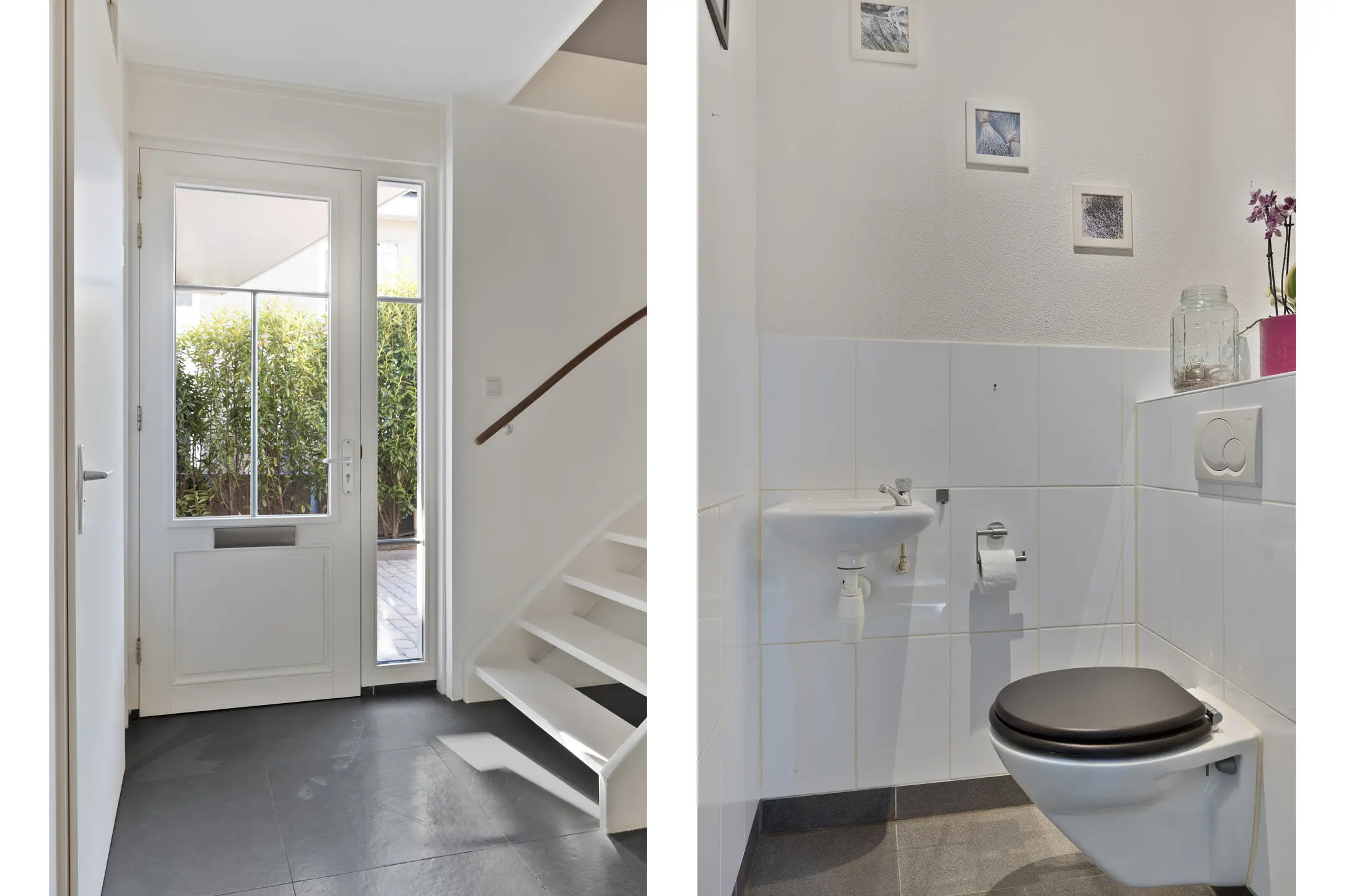 De voordeur bevindt zich praktisch onder een overstek, wel zo prettig bij binnenkomst. In de hal vind je de meterkast, het moderne hangtoilet met fonteintje, de trapopgang naar de eerste verdieping en de toegang tot de leefruimte.