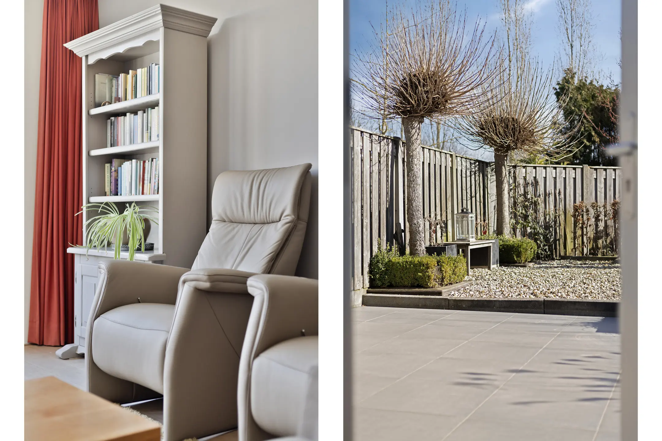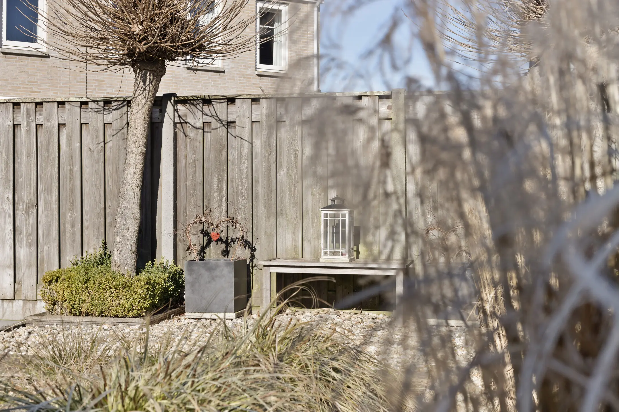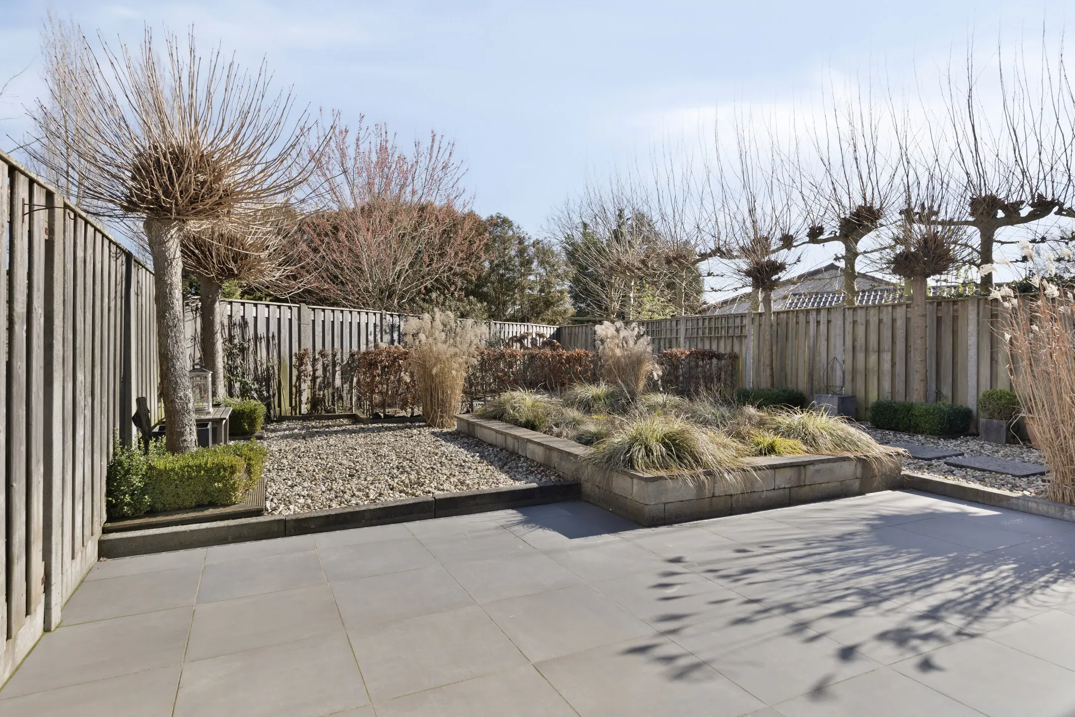 De achtertuin is eveneens netjes en onderhoudsvriendelijk ingericht. Direct aan de achtergevel, bij de openslaande tuindeuren, ligt een heerlijk terras waar je in alle rust kunt zitten. Dankzij de gunstige ligging en inrichting geniet je hier van bijzonder veel privacy.