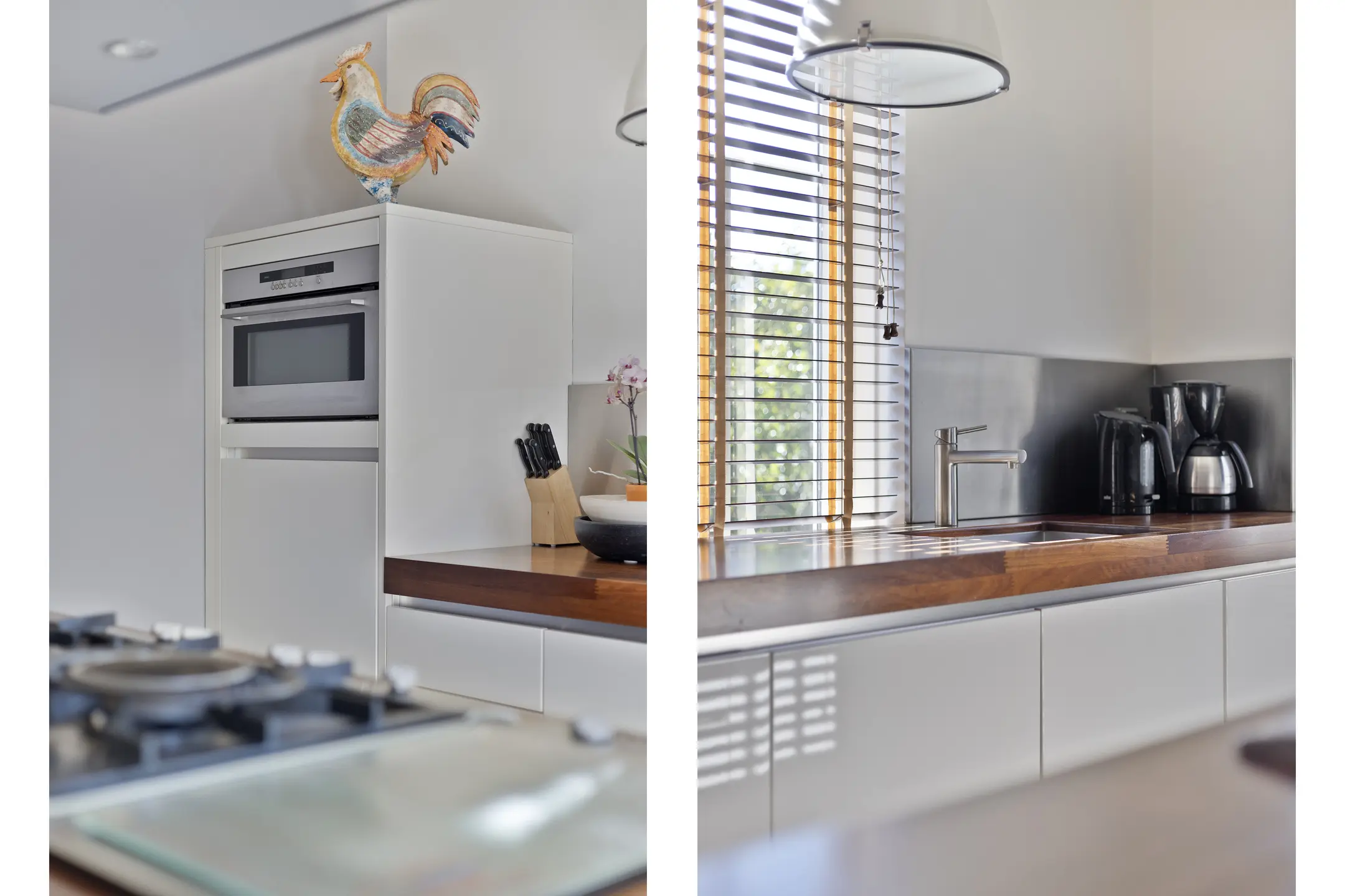 De open keuken is uitgevoerd met een leistenen vloer en heeft een strakke, moderne uitstraling. De rechte opstelling biedt volop werk- en bergruimte en is voorzien van een vaatwasser, koelkast en combi-oven. In het kookeiland bevindt zich het 5-pits gasfornuis met afzuigkap en zelfs een grillplaat, ideaal voor de kookliefhebber. Daarnaast is er aan de andere zijde nog een praktische kastenwand met extra opbergruimte.