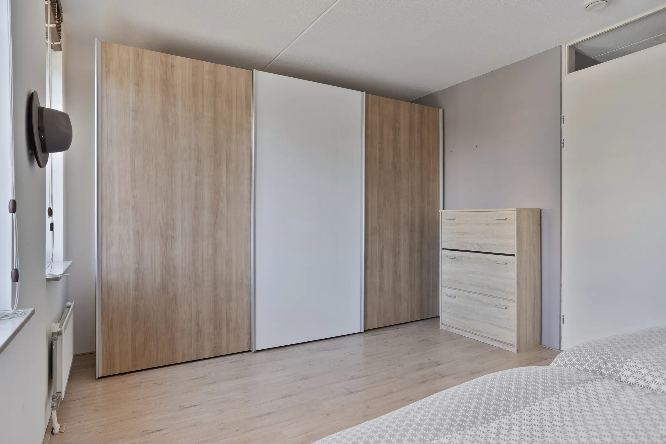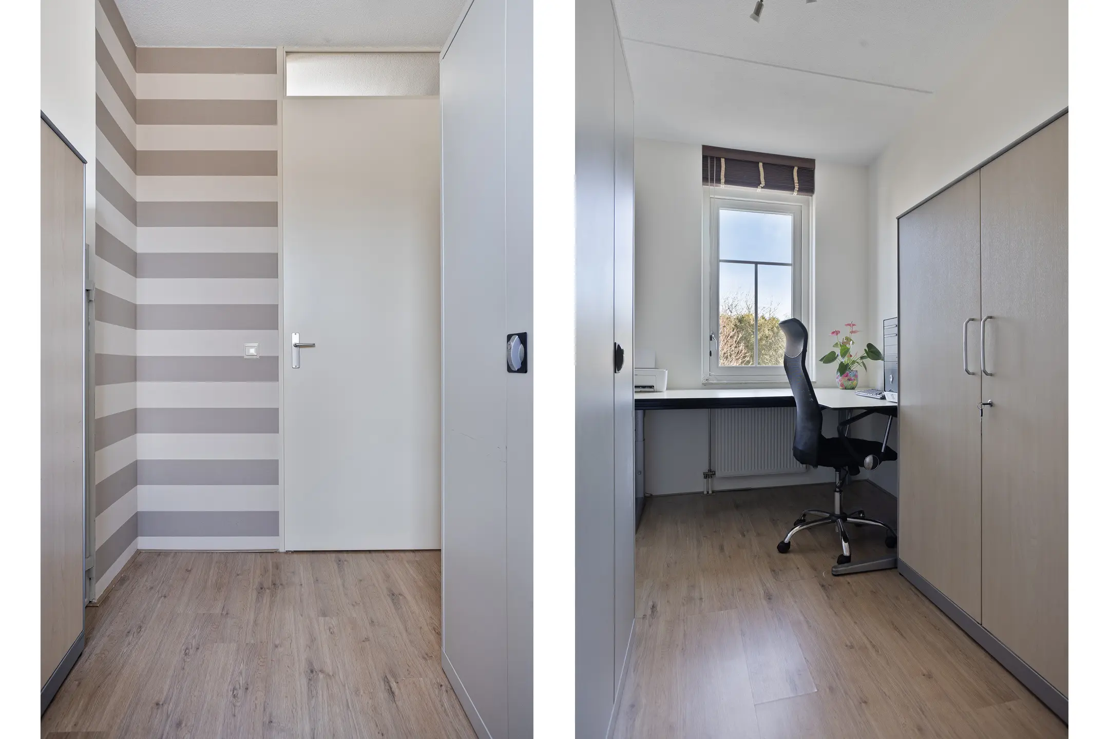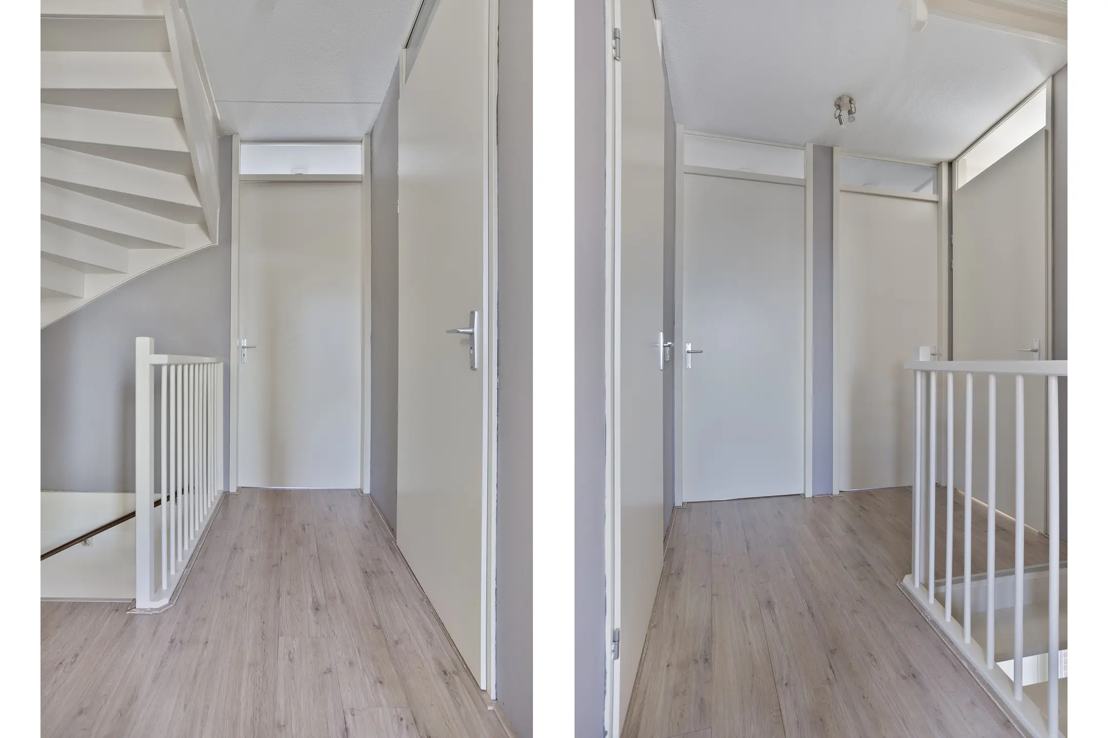 Op de eerste verdieping bevinden zich drie slaapkamers en de badkamer. Alle slaapkamers zijn afgewerkt met een nette, neutrale laminaatvloer en profiteren van een fijne lichtinval door de aanwezige raampartijen. De kamers zijn stuk voor stuk praktisch van formaat en flexibel in te delen.