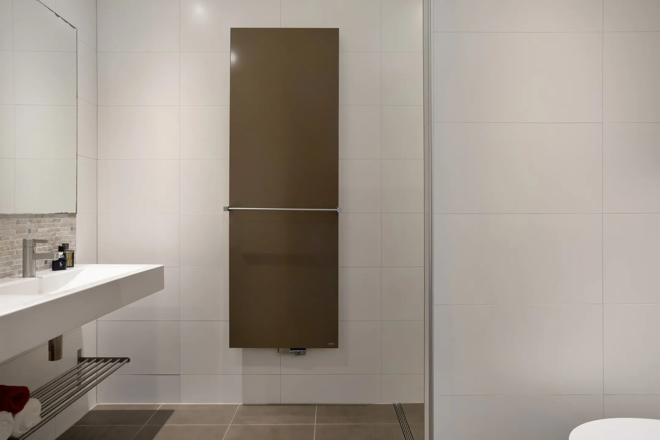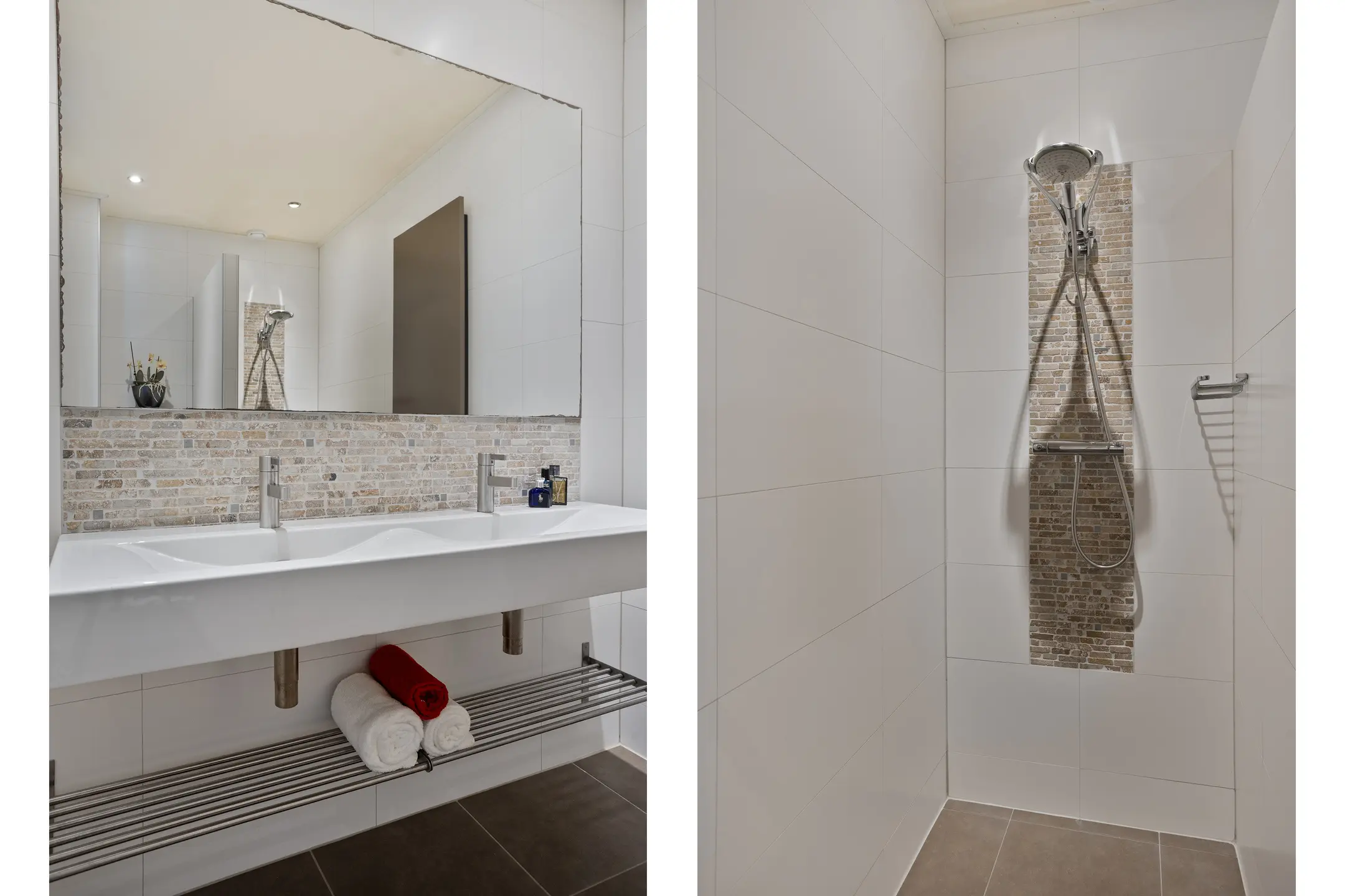 De badkamer is modern en voelt ruim en comfortabel aan. Deze is ingericht met een hangtoilet, inloopdouche, dubbele wastafel, designradiator en mechanische ventilatie.