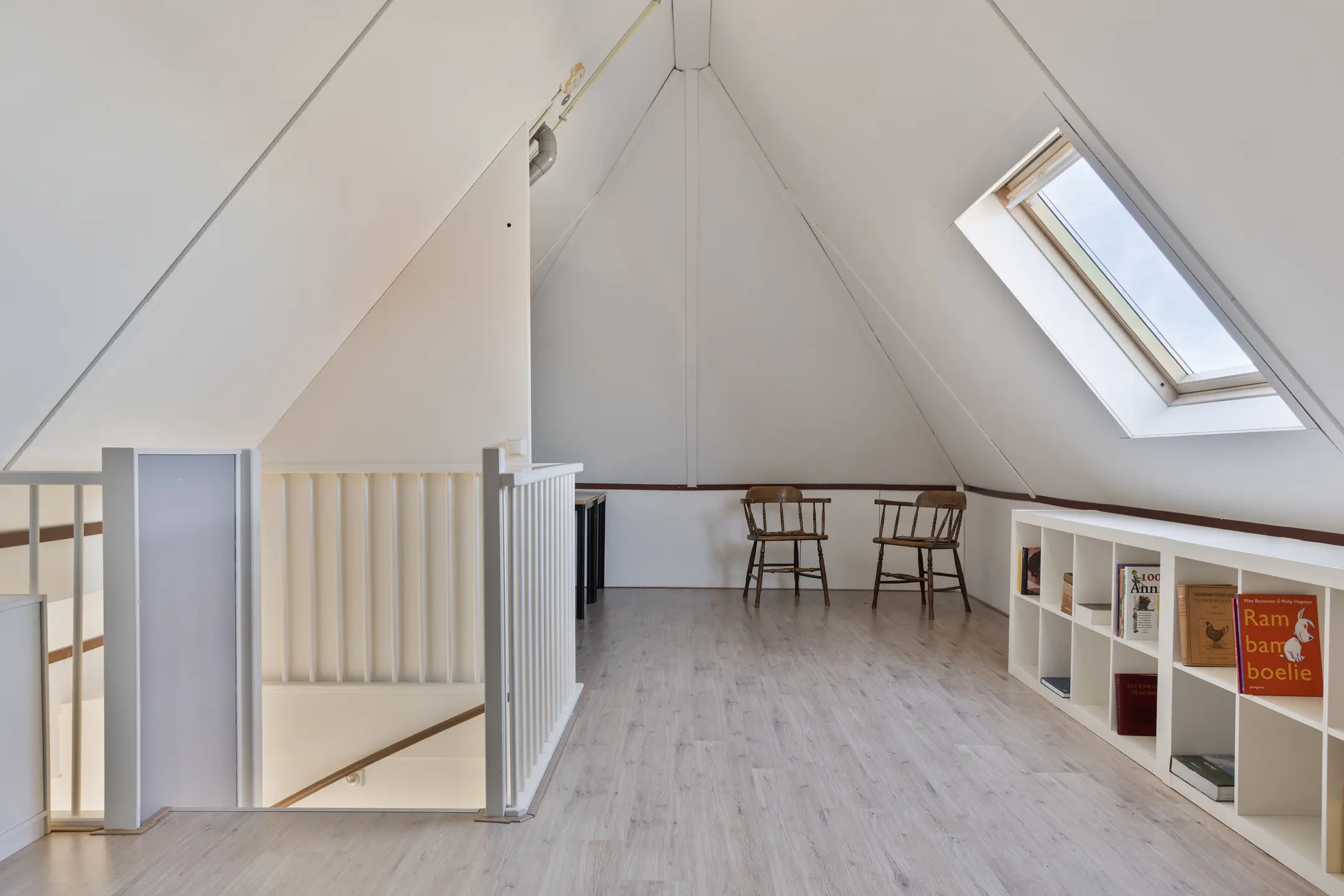 Via een vaste trap bereik je de tweede verdieping. Dit is momenteel één grote open ruimte met volop mogelijkheden. Denk aan een werkplek, hobbyruimte, extra slaapkamers of gewoon een ideale bergzolder. Hier bevinden zich ook de CV-ketel (2018) en de warmte-terugwininstallatie. Het Velux dakraam zorgt voor prettig daglicht, waardoor het een aangename en bruikbare verdieping is.