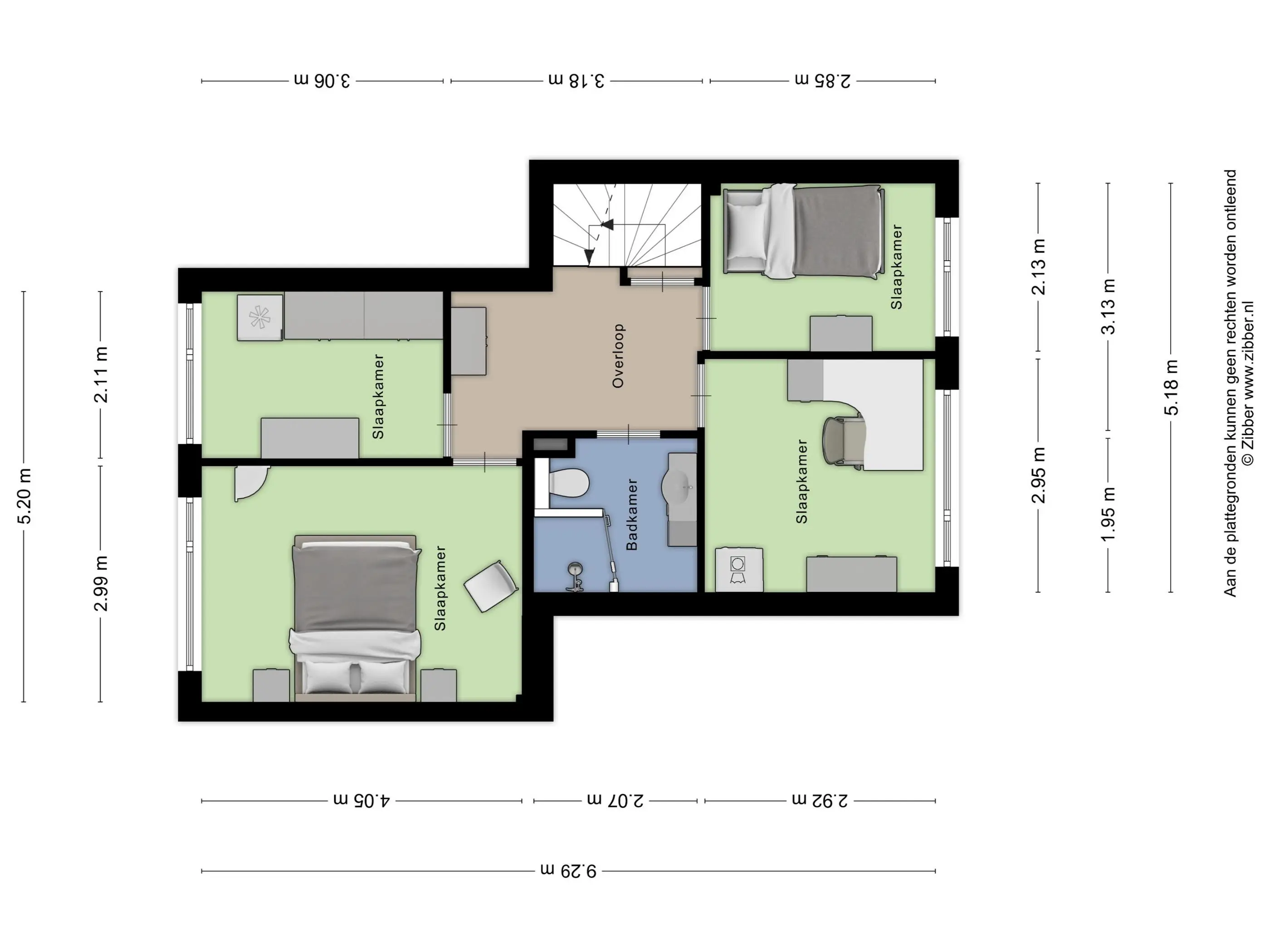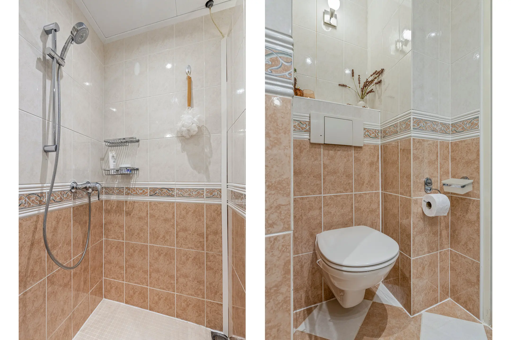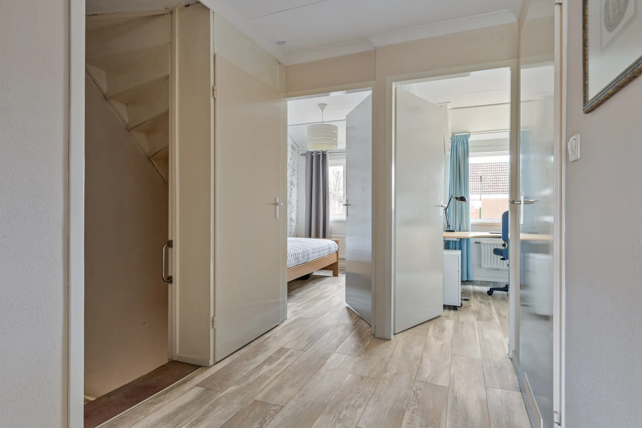 De royale overloop geeft toegang tot vier slaapkamers, geschikt voor slaap-, werk- of hobbyruimtes. De comfortabele badkamer (2006) is voorzien van een douche, toilet en badmeubel. Via de overloop bereik je de vaste trap naar de zolder. De huidige wasmachine- en drogeraansluiting bevindt zich in de slaapkamer aan de voorzijde, maar kan desgewenst worden verplaatst naar de zolder.
