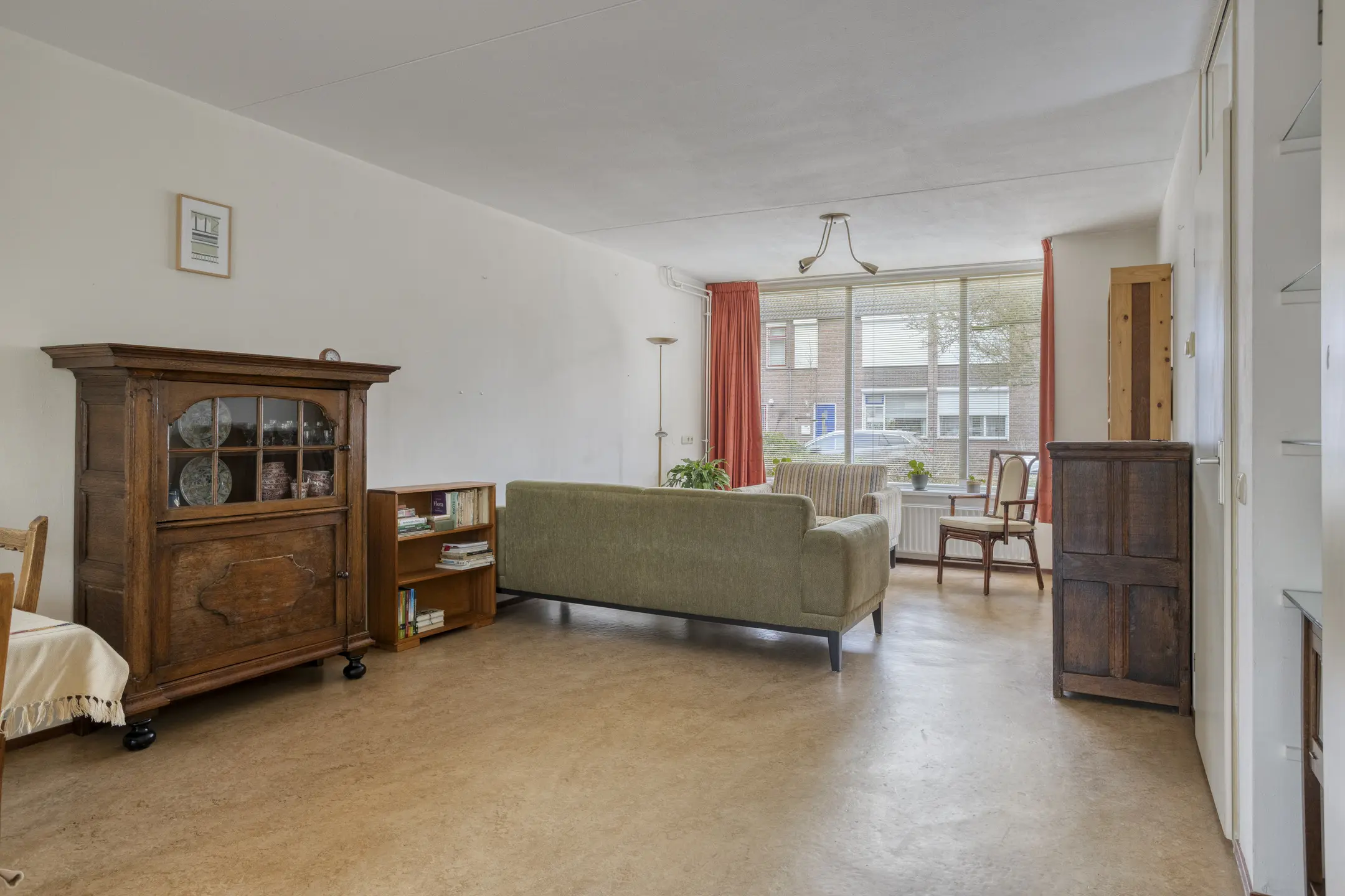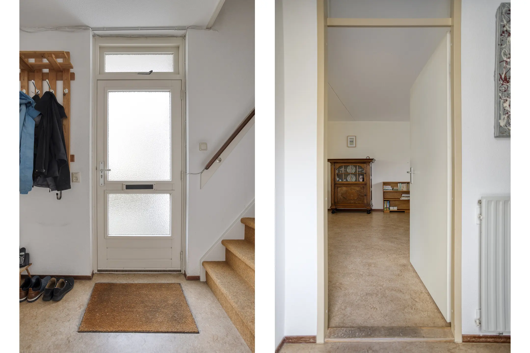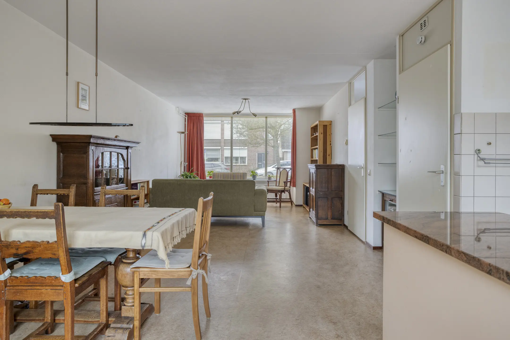 Via de lichte entree met meterkast, toiletruimte en trapopgang bereiken we de woonkamer. De doorzonwoonkamer is een prettige en lichte leefruimte. Aan de voorzijde bevindt zich de zithoek met groot raam en vrij uitzicht dankzij de diepe voortuin – heerlijk uit het zicht van voorbijgangers.