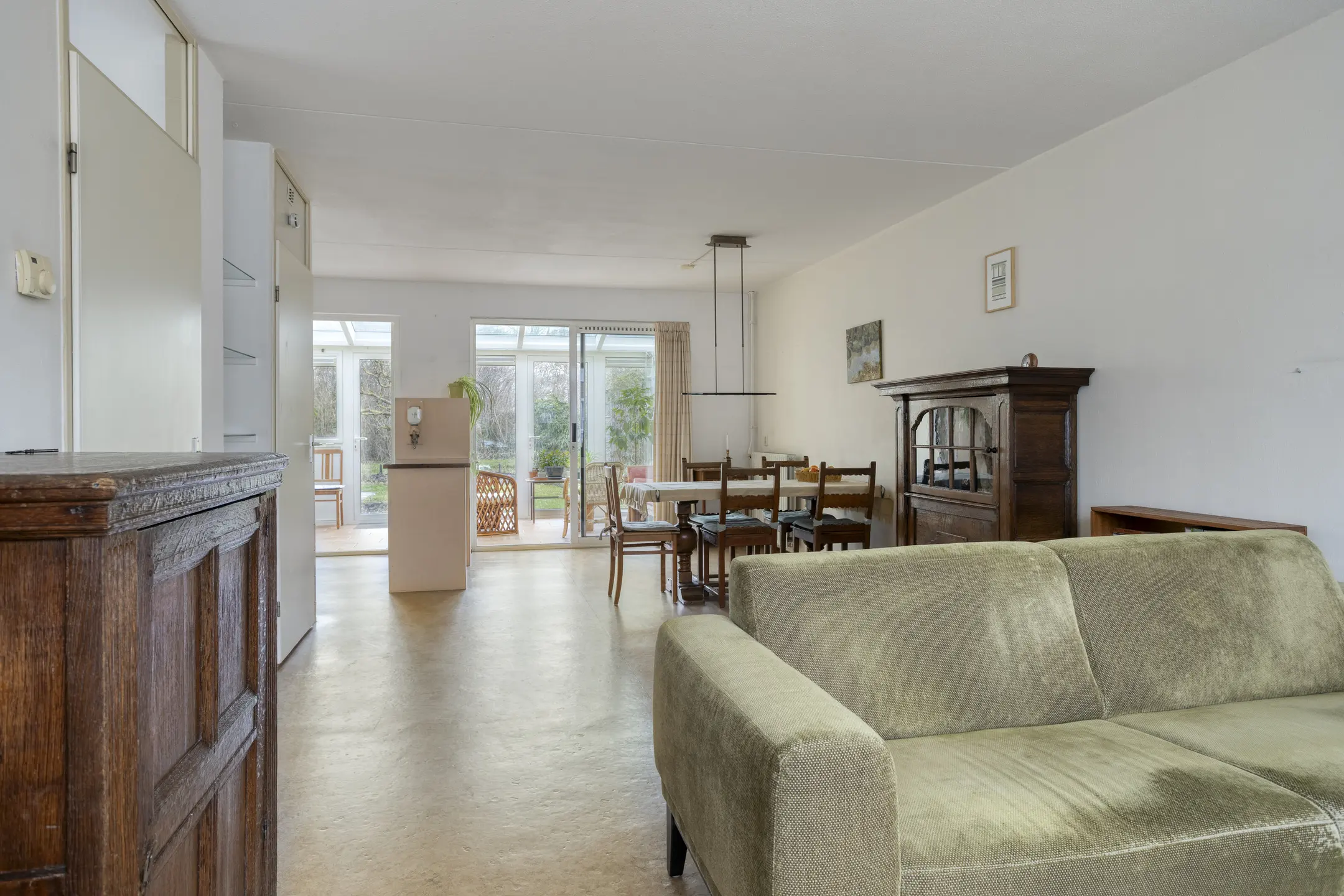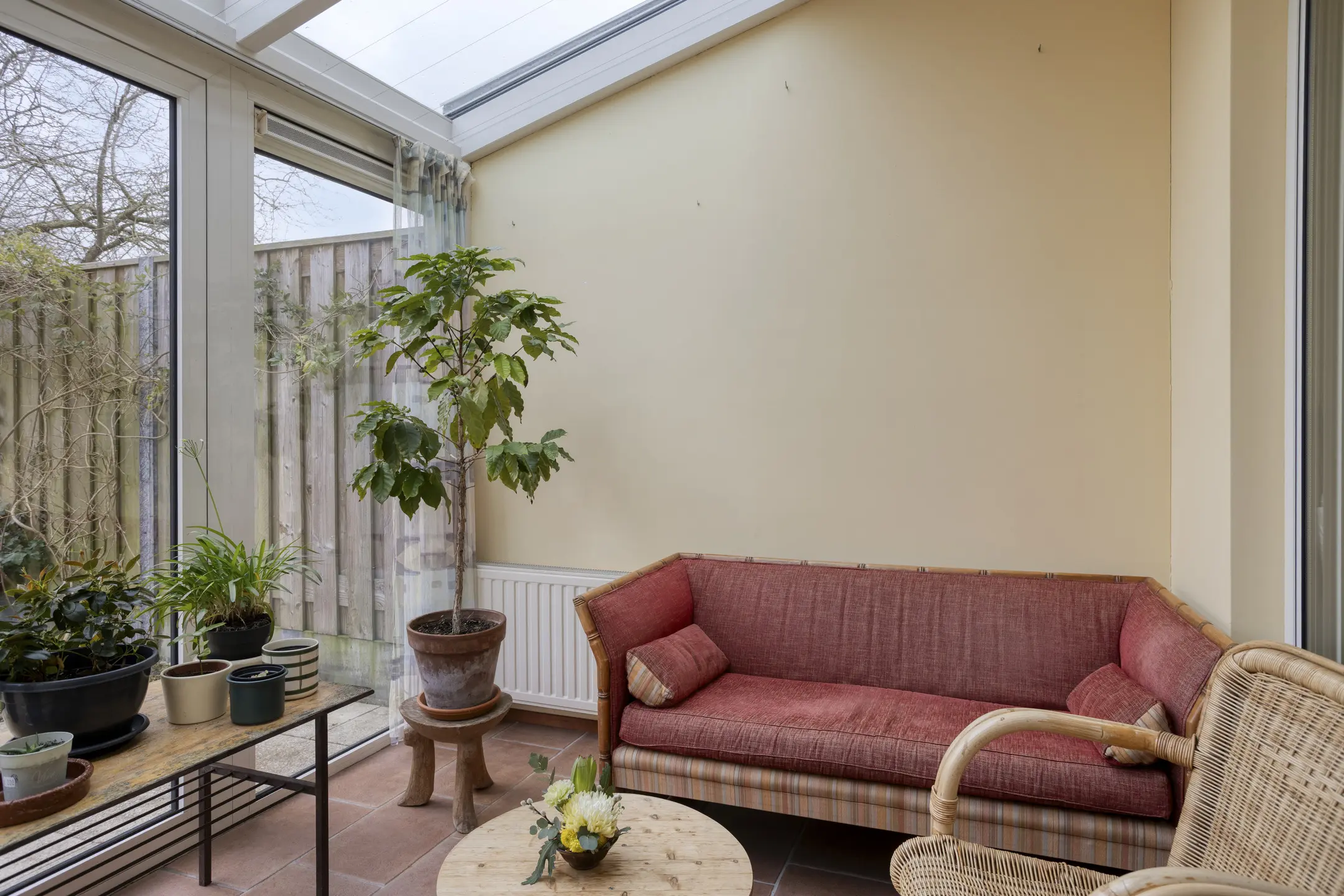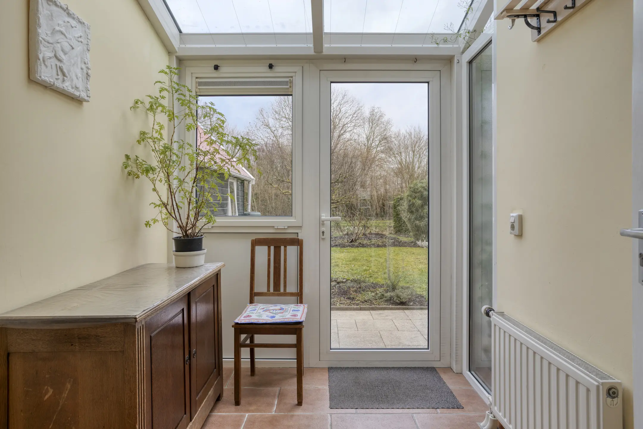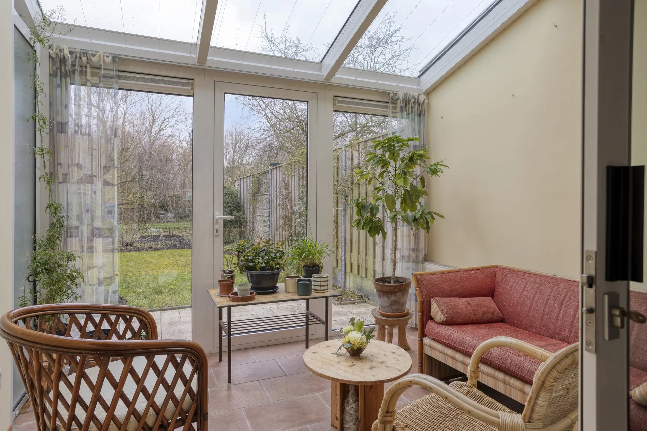 Aan de achterzijde is een serre aangebouwd, bereikbaar via een aluminium schuifpui. De serre vormt een mooie verlenging van de woonkamer en heeft dankzij de grote raampartijen en loopdeur naar de tuin een eigen, lichte sfeer. Een fijne plek om al vroeg in het voorjaar van het buitenleven te genieten.