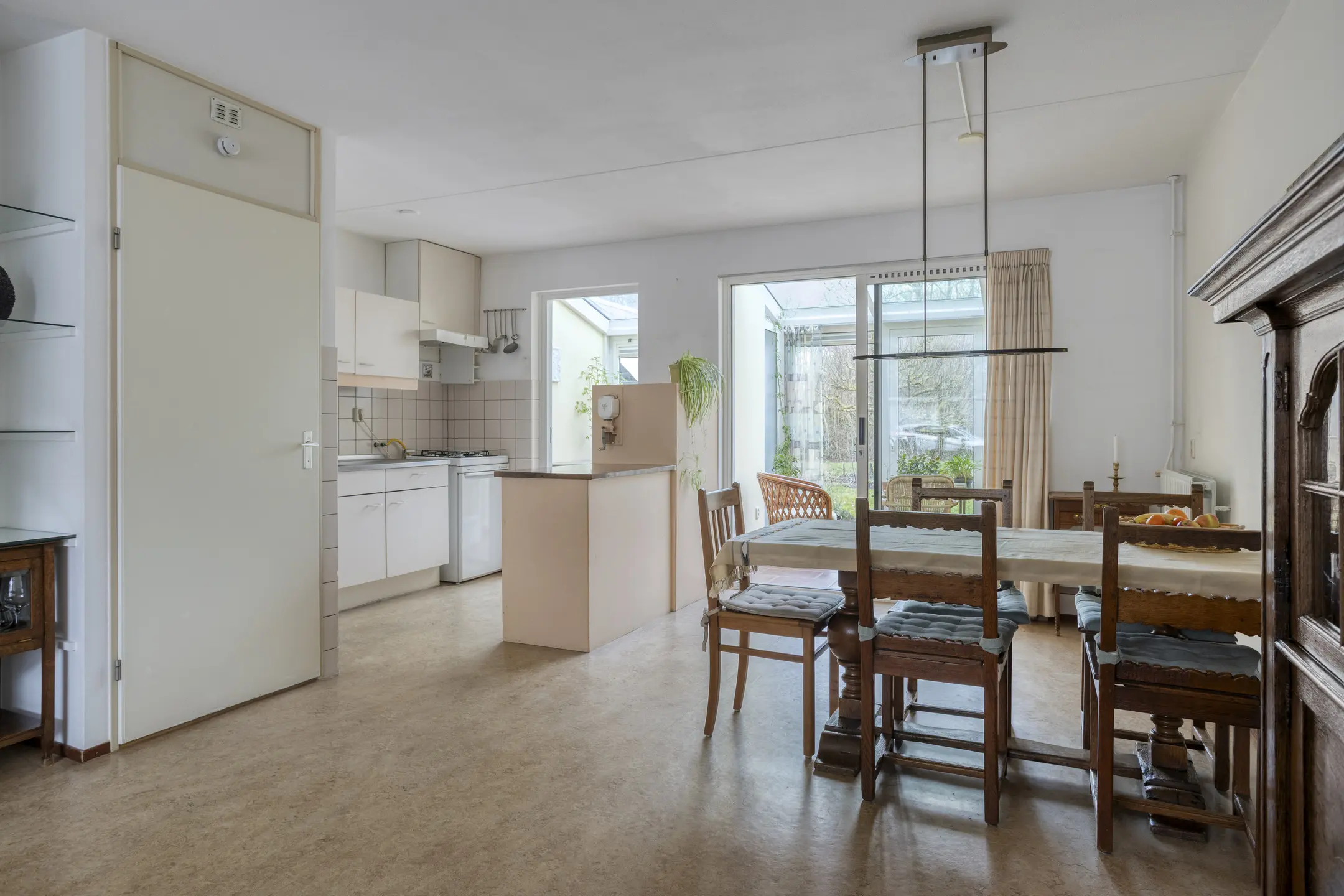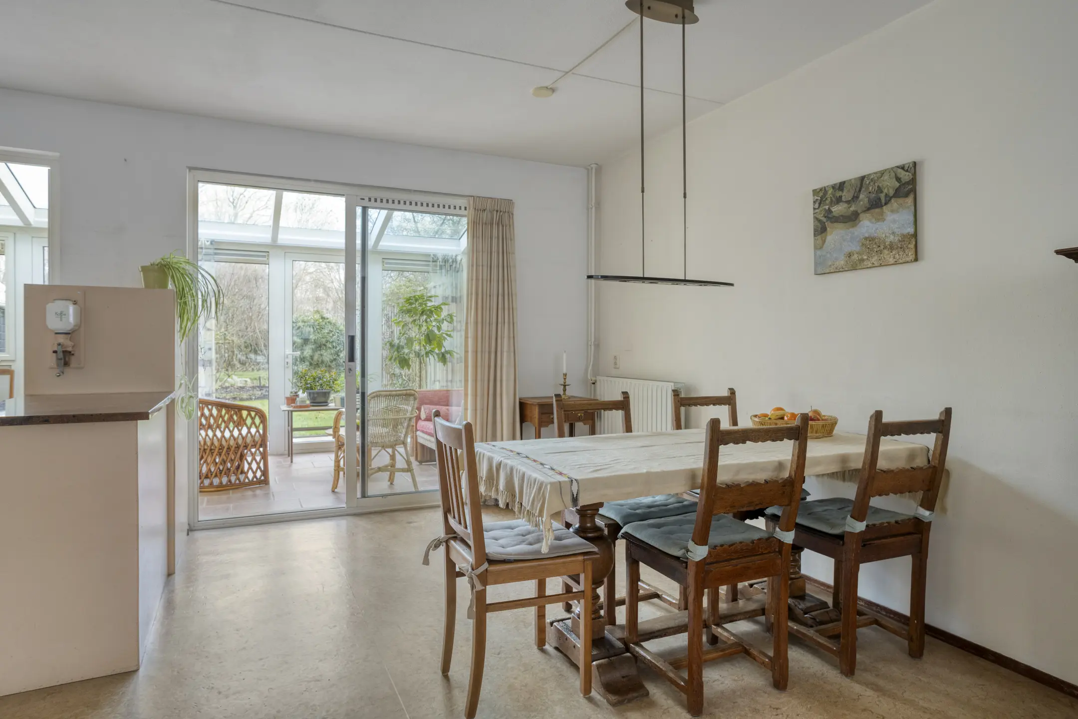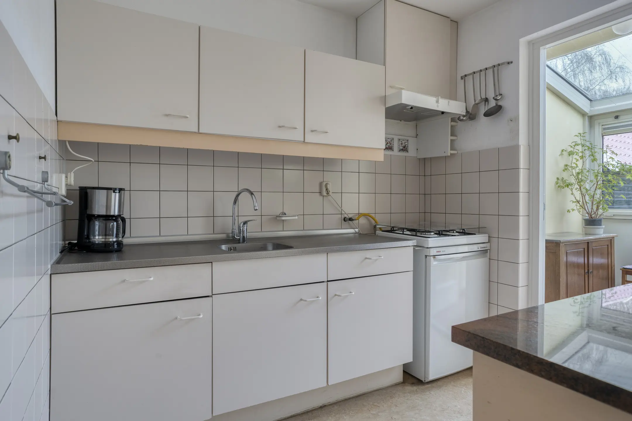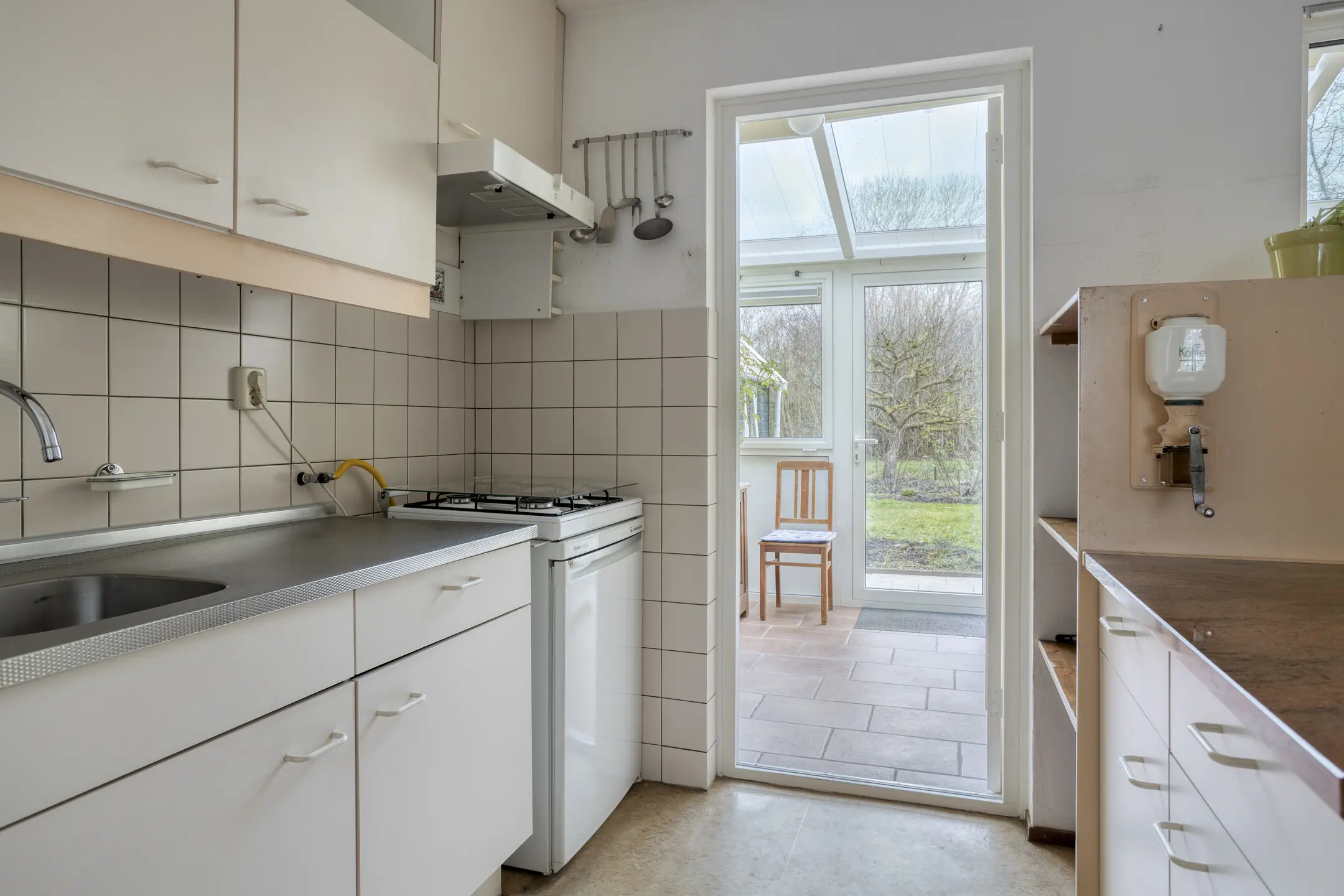 De open keuken ligt eveneens aan de achterzijde en is voorzien van een koelkast, 4-pits gasfornuis met afzuigkap en een 10 liter close-in boiler. Aansluitend is in de serre een praktische bijkeuken gerealiseerd met toegang tot de tuin en een directe doorgang naar de garage.