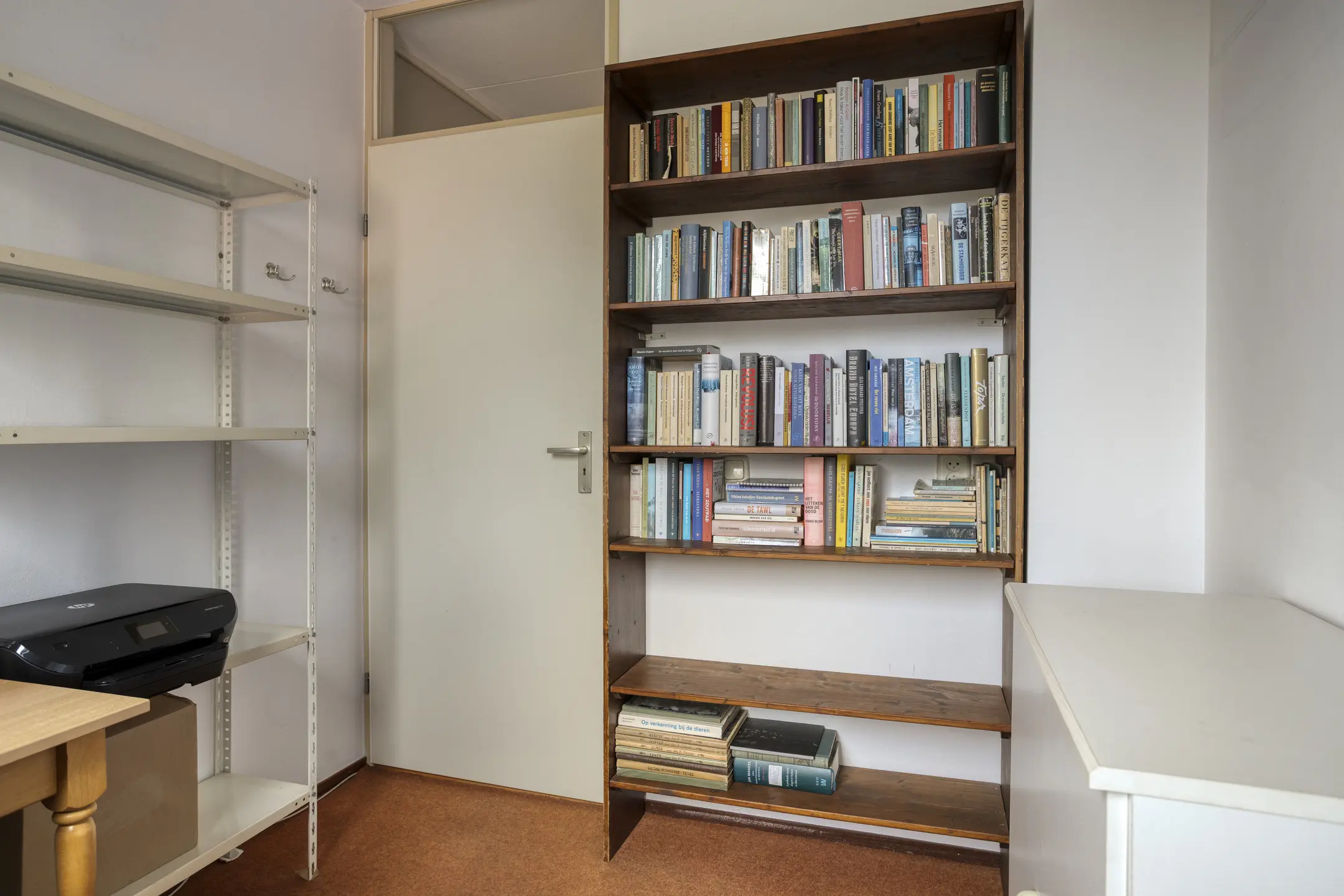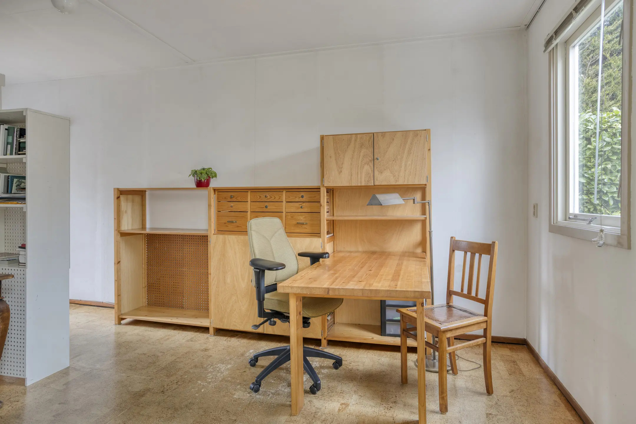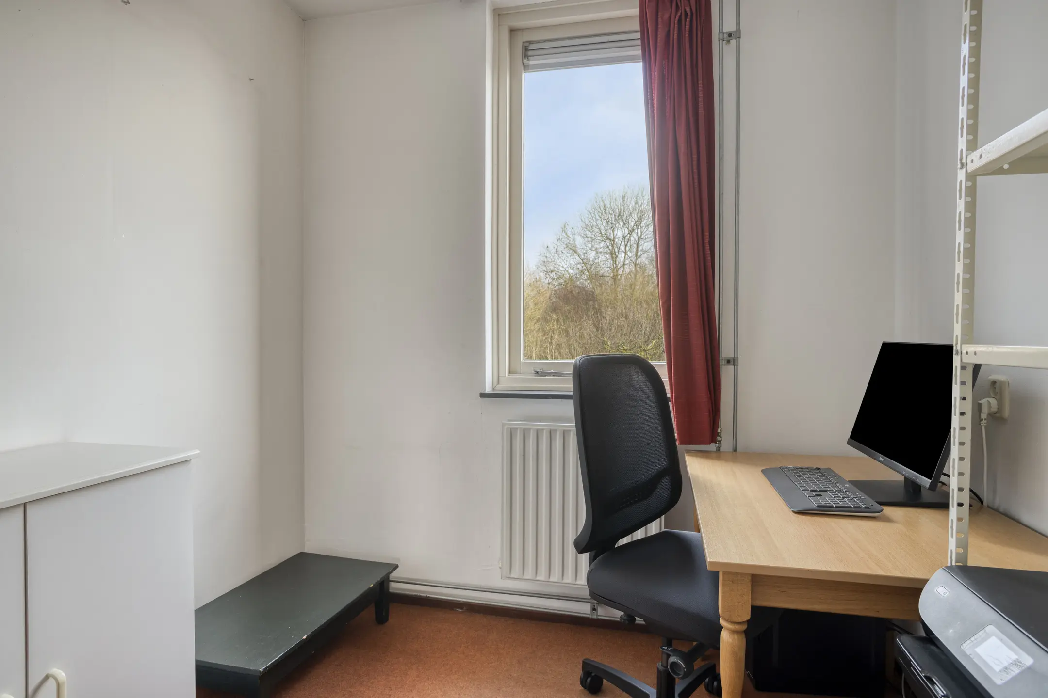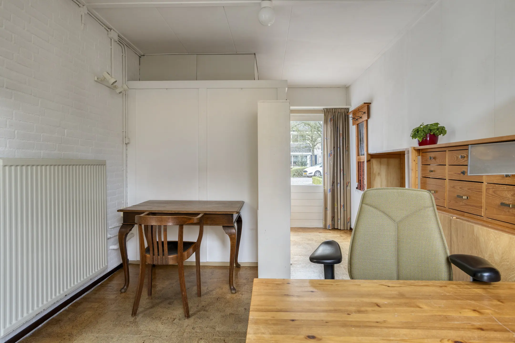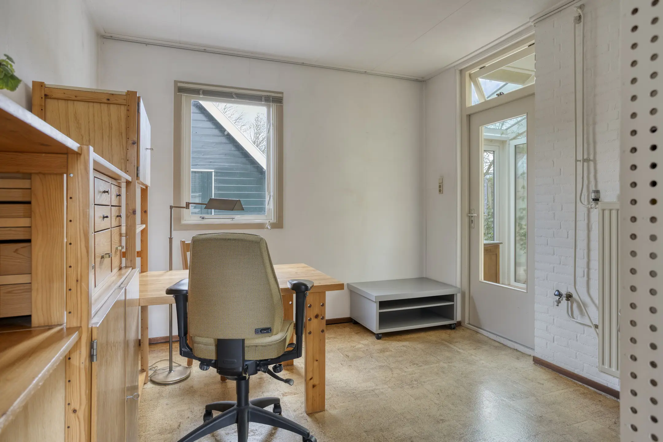 De garage is momenteel ingericht als kantoorruimte, maar kan eenvoudig worden gebruikt als berging, hobbyruimte of praktijkruimte aan huis.