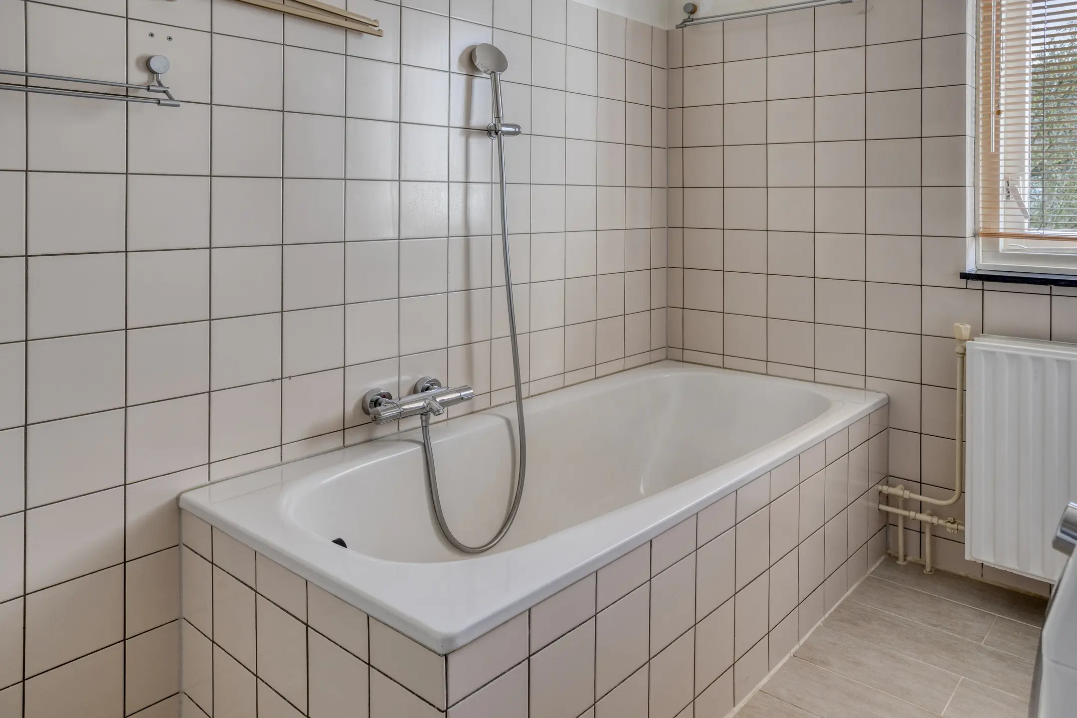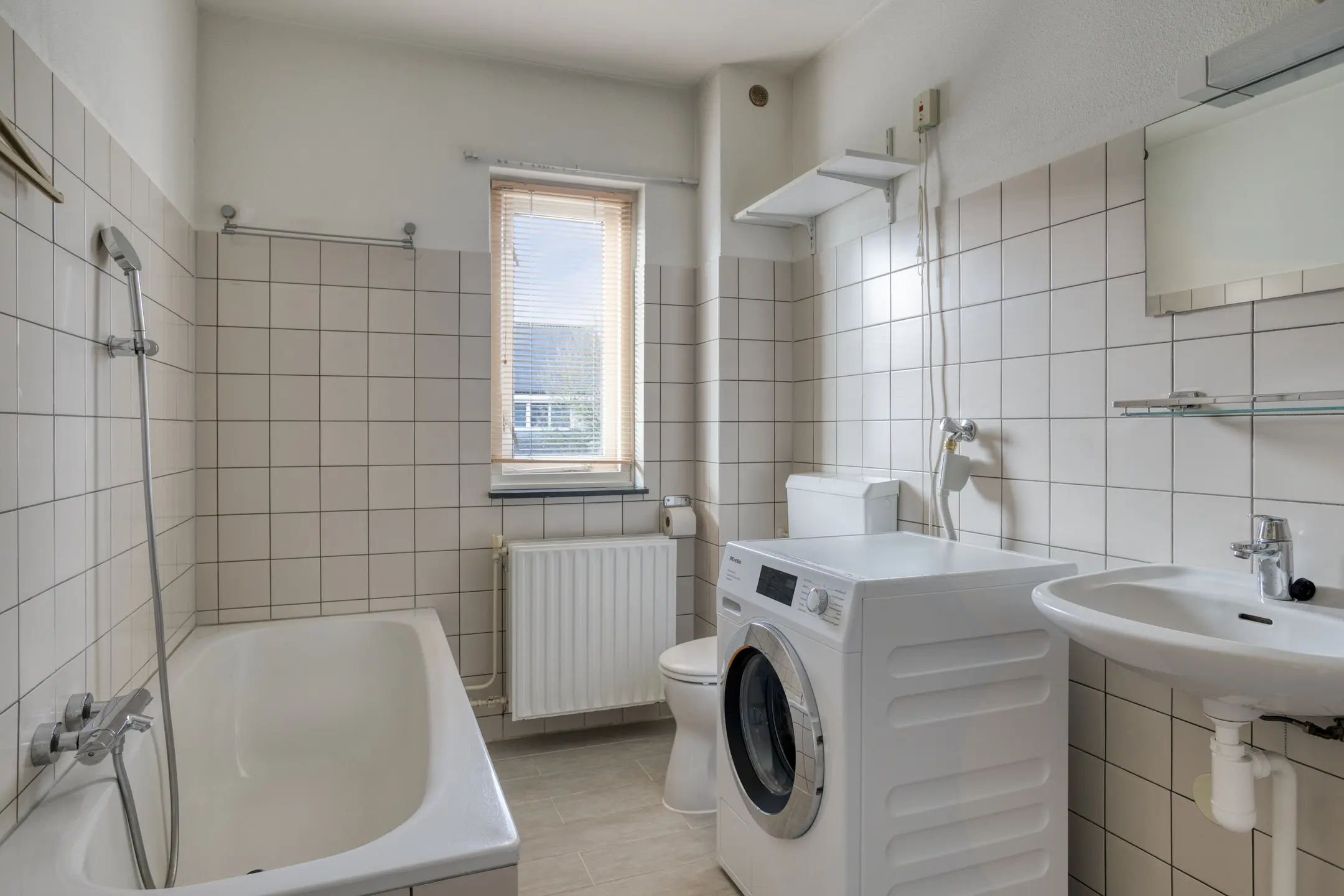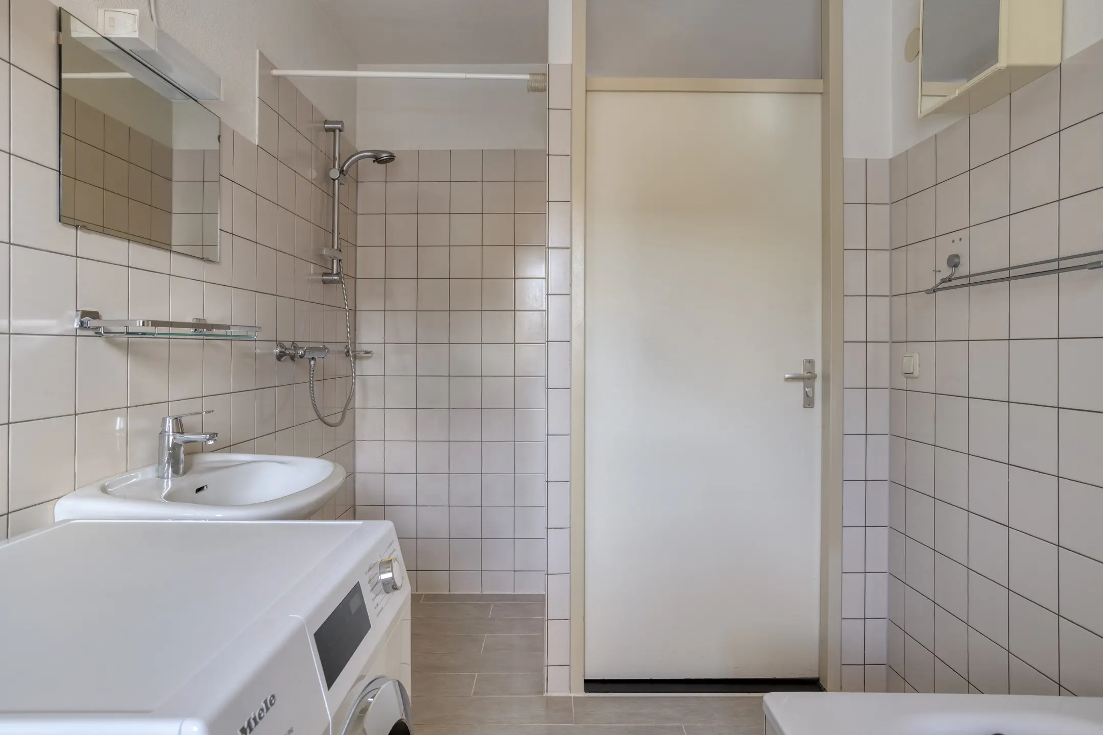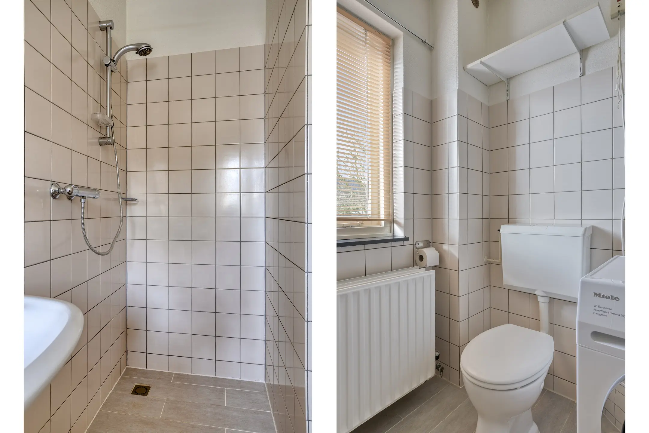 De badkamer is licht en functioneel ingericht met een inloopdouche, ligbad, toilet, wastafel en wasmachineaansluiting. Ook hier is een uitstekende basis aanwezig voor modernisering naar eigen wens.
