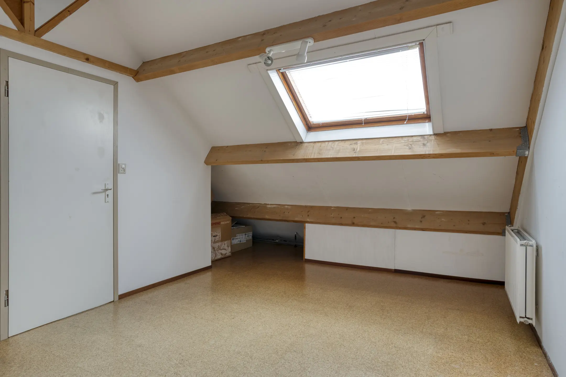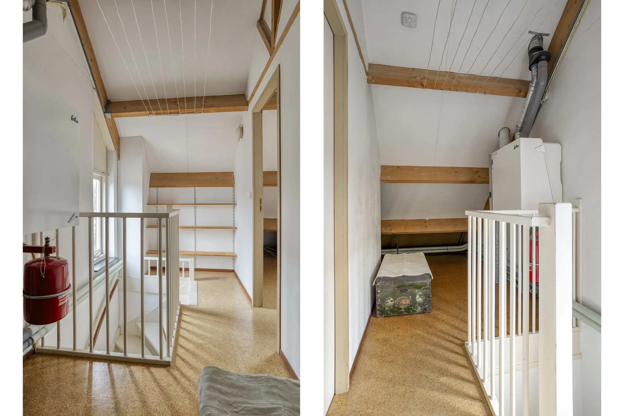 Via de vaste trap bereiken we de ruime tweede verdieping. De overloop biedt veel bergruimte en daglicht dankzij het aanwezige raam. Hier bevindt zich tevens de CV-ketel.