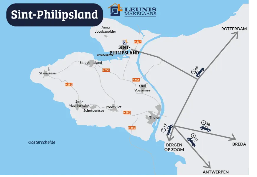 Sint Philipsland is een rustig dorp op het gelijknamige schiereiland, waar de natuur en de nabijheid van water centraal staan. Je vindt er volop ruimte voor watersportactiviteiten zoals zeilen en duiken. De ligging biedt goede verbindingen naar de omliggende steden, zoals Bergen op Zoom en Rotterdam, maar biedt tegelijkertijd de rust en ruimte die Zeeland kenmerkt.