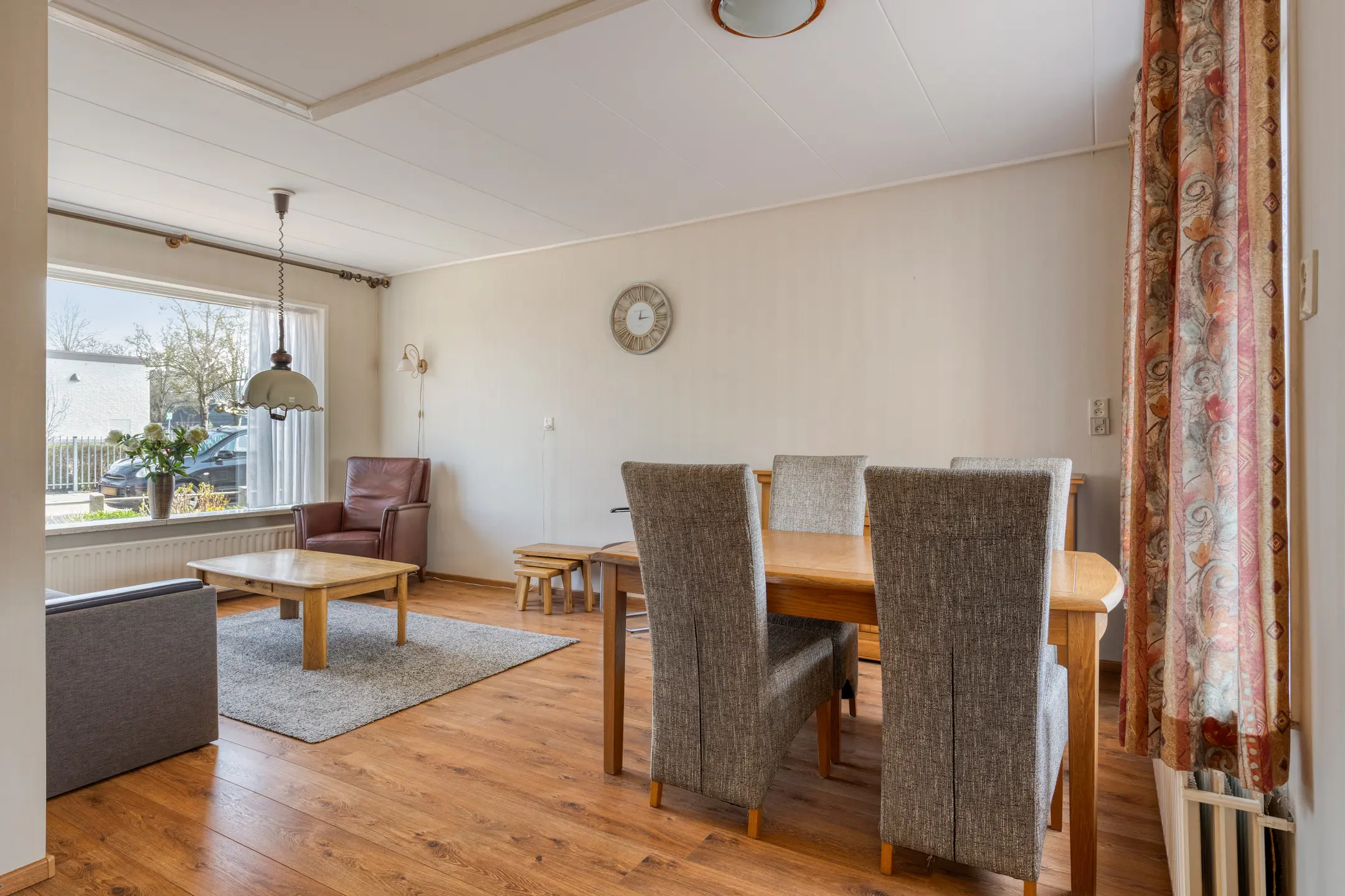 De L-vormige woonkamer is een fijne en lichte leefruimte. Aan de voorzijde geniet je van een leuk uitzicht op het speelplein van de basisschool. Zowel aan de voor- als achterzijde zijn rolluiken aanwezig; aan de voorzijde elektrisch bedienbaar en aan de achterzijde handmatig.