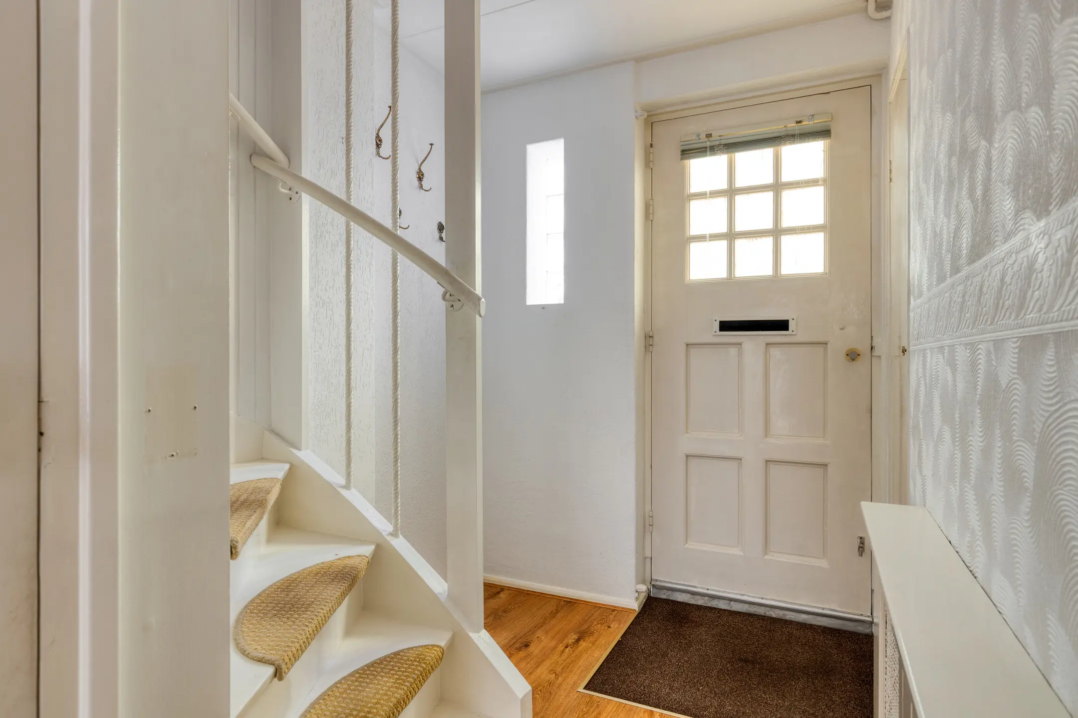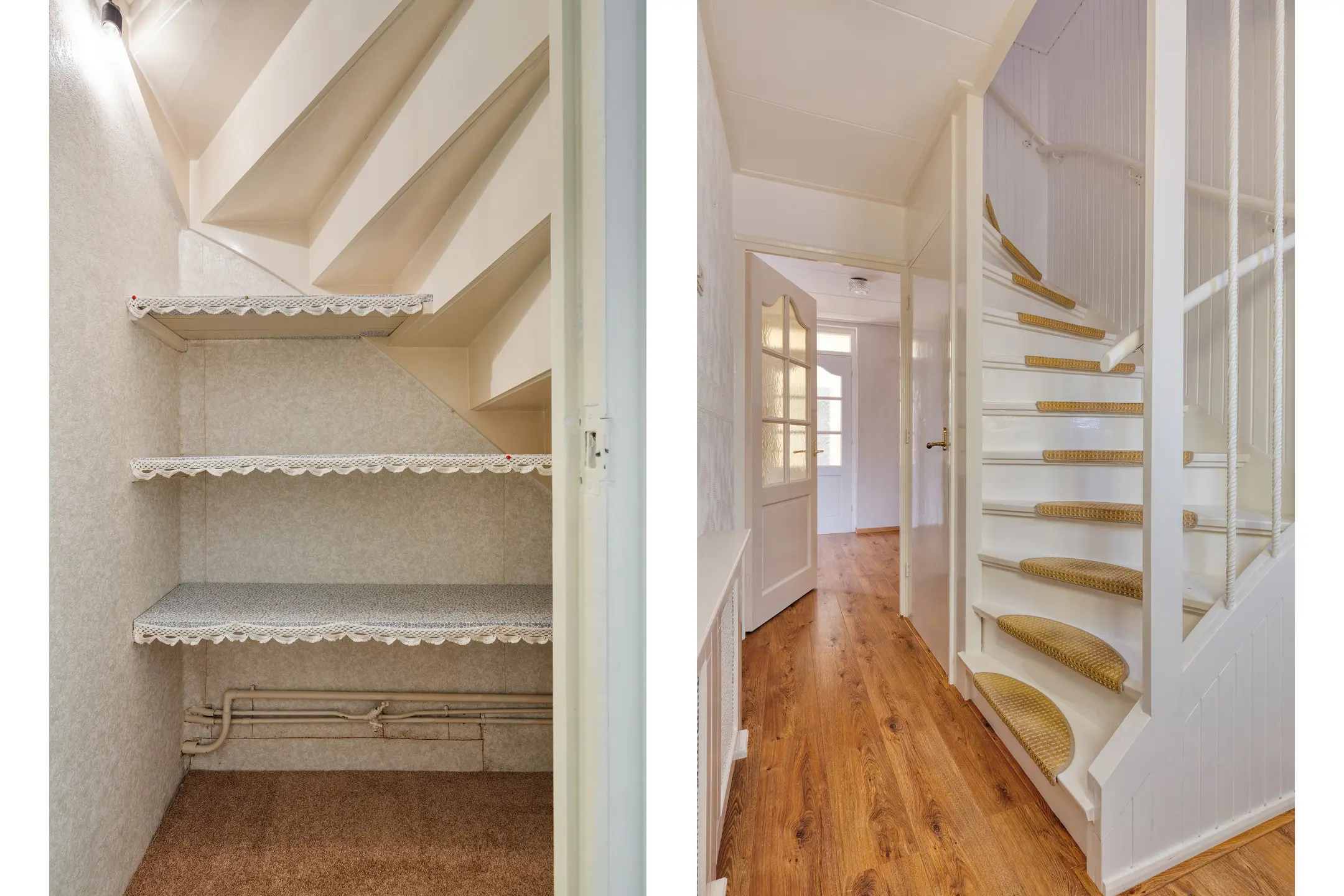 We stappen de woning binnen via de lichte hal, waar zich de meterkast bevindt en de trapopgang naar de eerste verdieping. Onder de trap is een praktische trapkast aanwezig. Vanuit de hal lopen we door naar de woonkamer.
