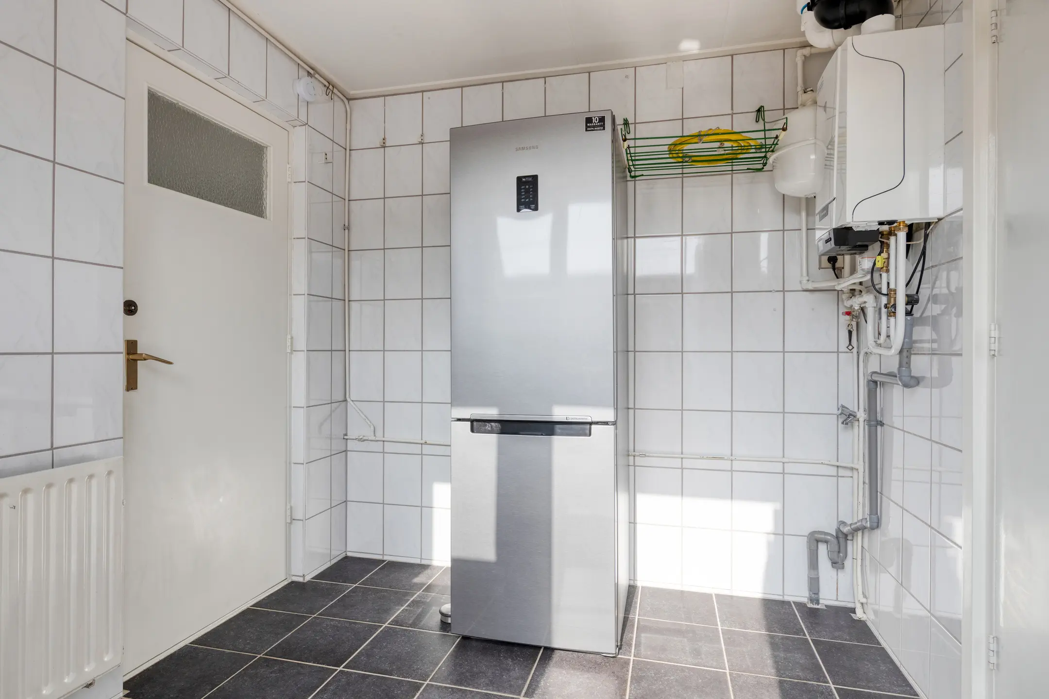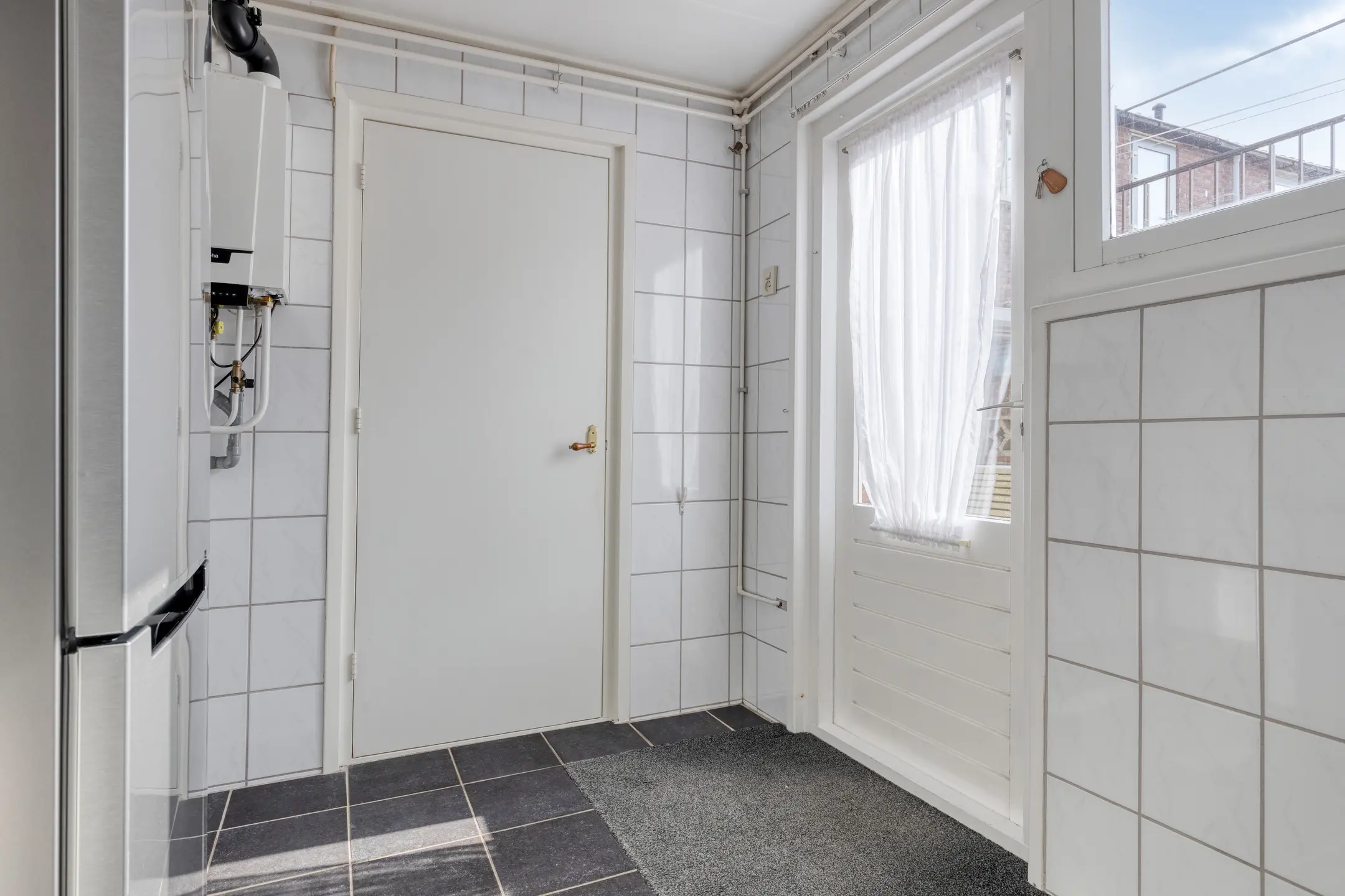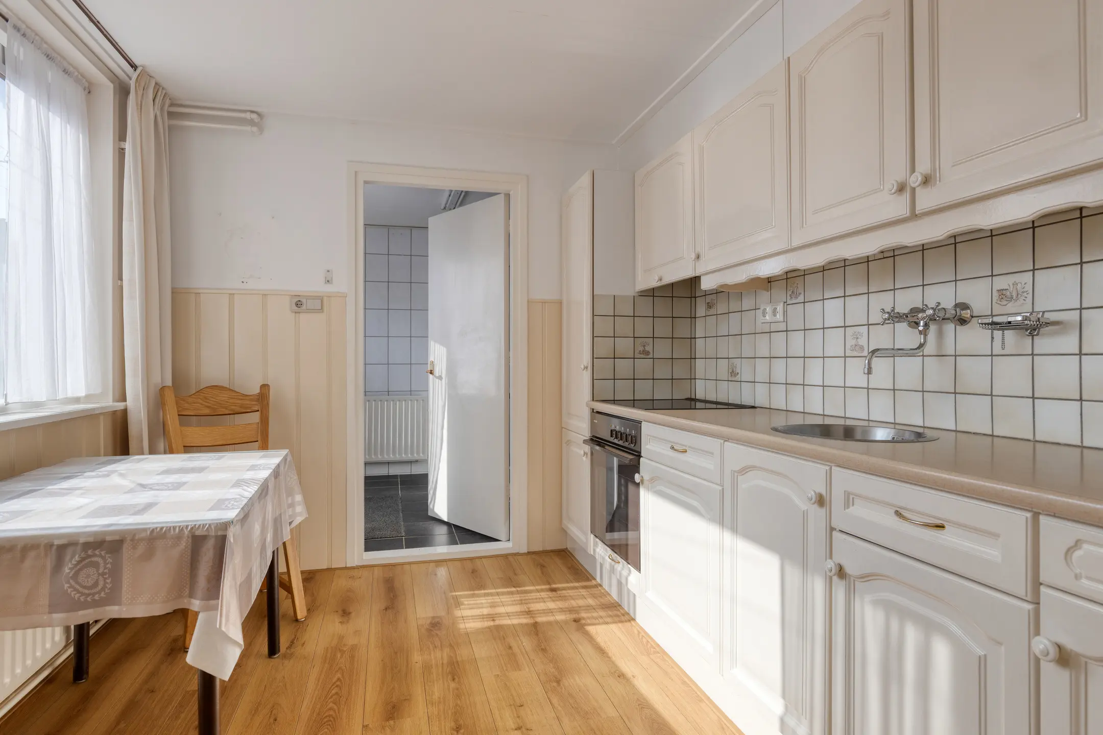 Aan de achterzijde van de woning bevindt zich ook de keuken. Deze is opgesteld in een rechte opstelling en voorzien van een 4-pits keramische kookplaat, afzuigkap en een oven. Dankzij het grote raam is het hier een aangenaam lichte ruimte. Ook hier is een elektrisch bedienbaar rolluik aanwezig. Aansluitend vinden we de praktische bijkeuken. Hier bevinden zich de wasmachineaansluiting, cv ketel (2020), de toegang tot het toilet en de deur naar de achtertuin. Het toilet is ruim en voorzien van een wastafel.