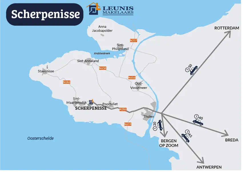 Scherpenisse, gelegen op het eiland Tholen, staat bekend om zijn rust, natuur en rijke historie. Het dorp ligt aan natuurgebied de Pluimpot, een voormalig getijdengebied dat nu een paradijs is voor wandelaars, fietsers en vogelliefhebbers. Hier geniet je dagelijks van ruimte, natuur en een ontspannen woonomgeving.