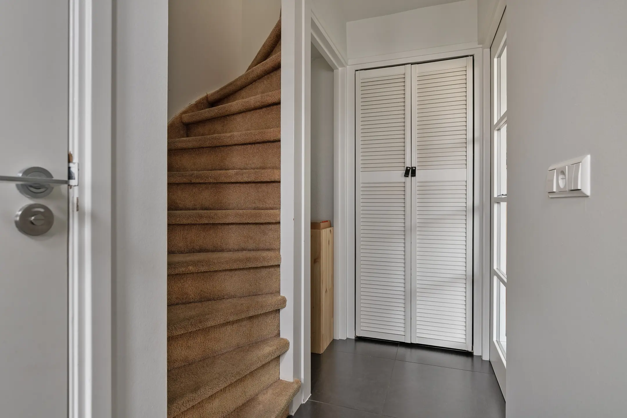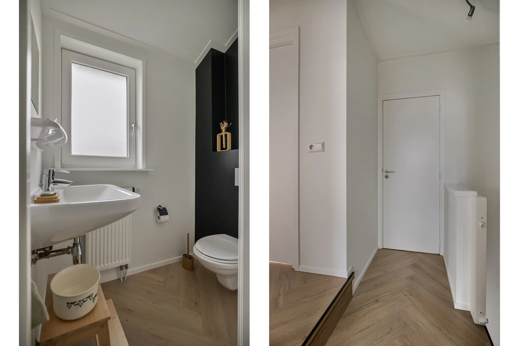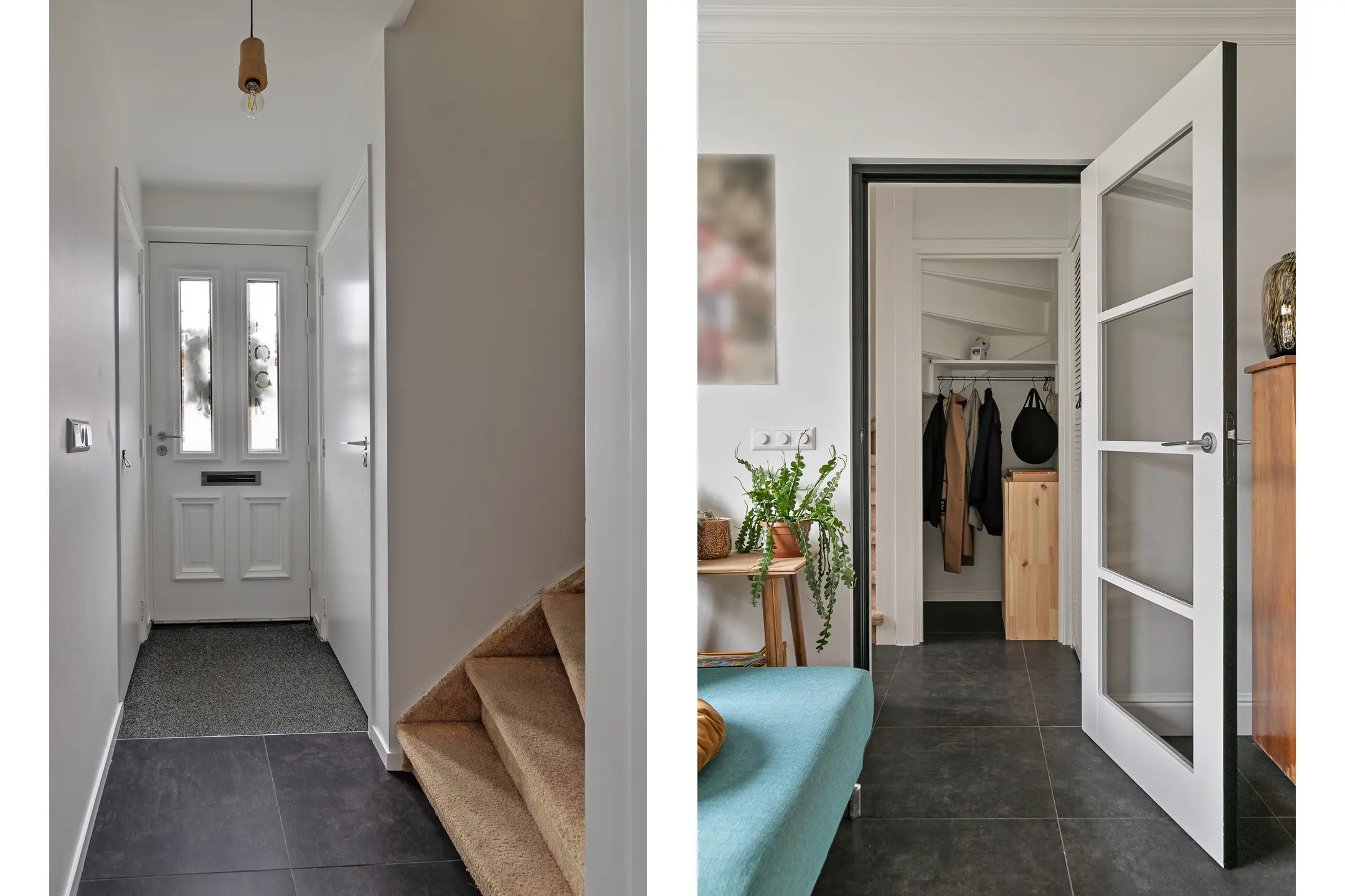 Bij binnenkomst valt direct de nette en verzorgde afwerking op. De hal biedt toegang tot de meterkast, het toilet, de trapopgang en de woonkamer. Onder de trap is een praktische garderobe gerealiseerd en achter stijlvolle deuren bevindt zich de ruime badkamer.