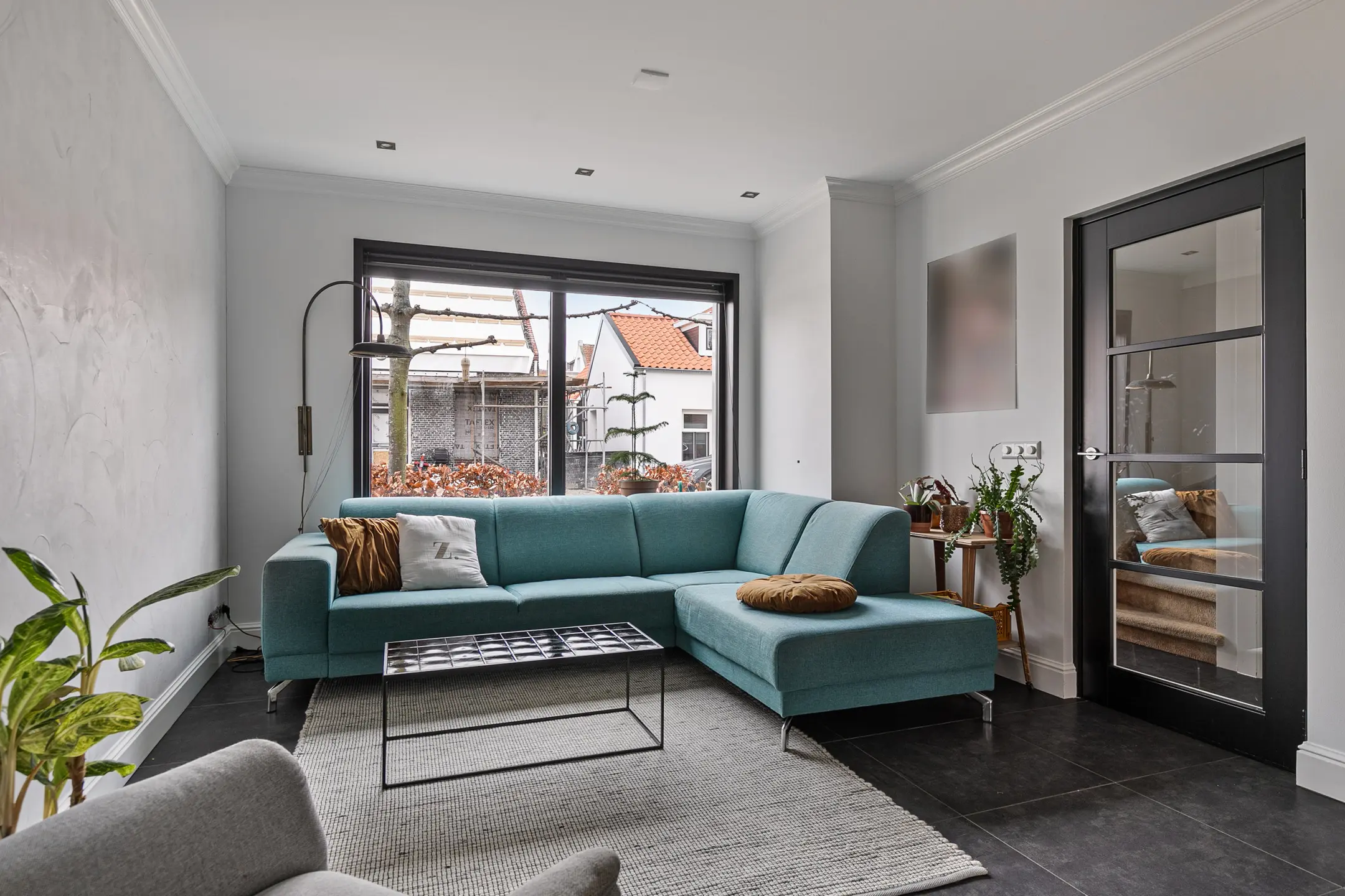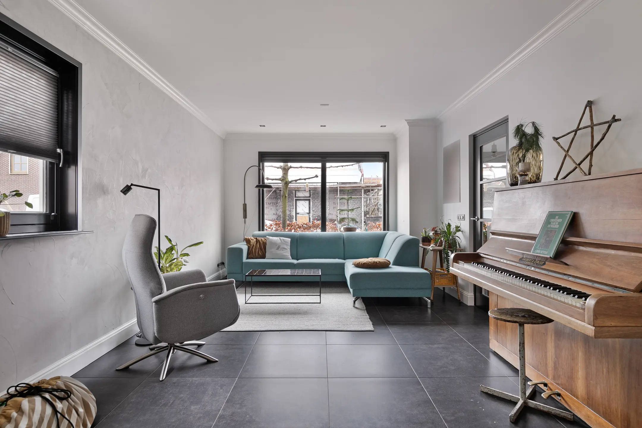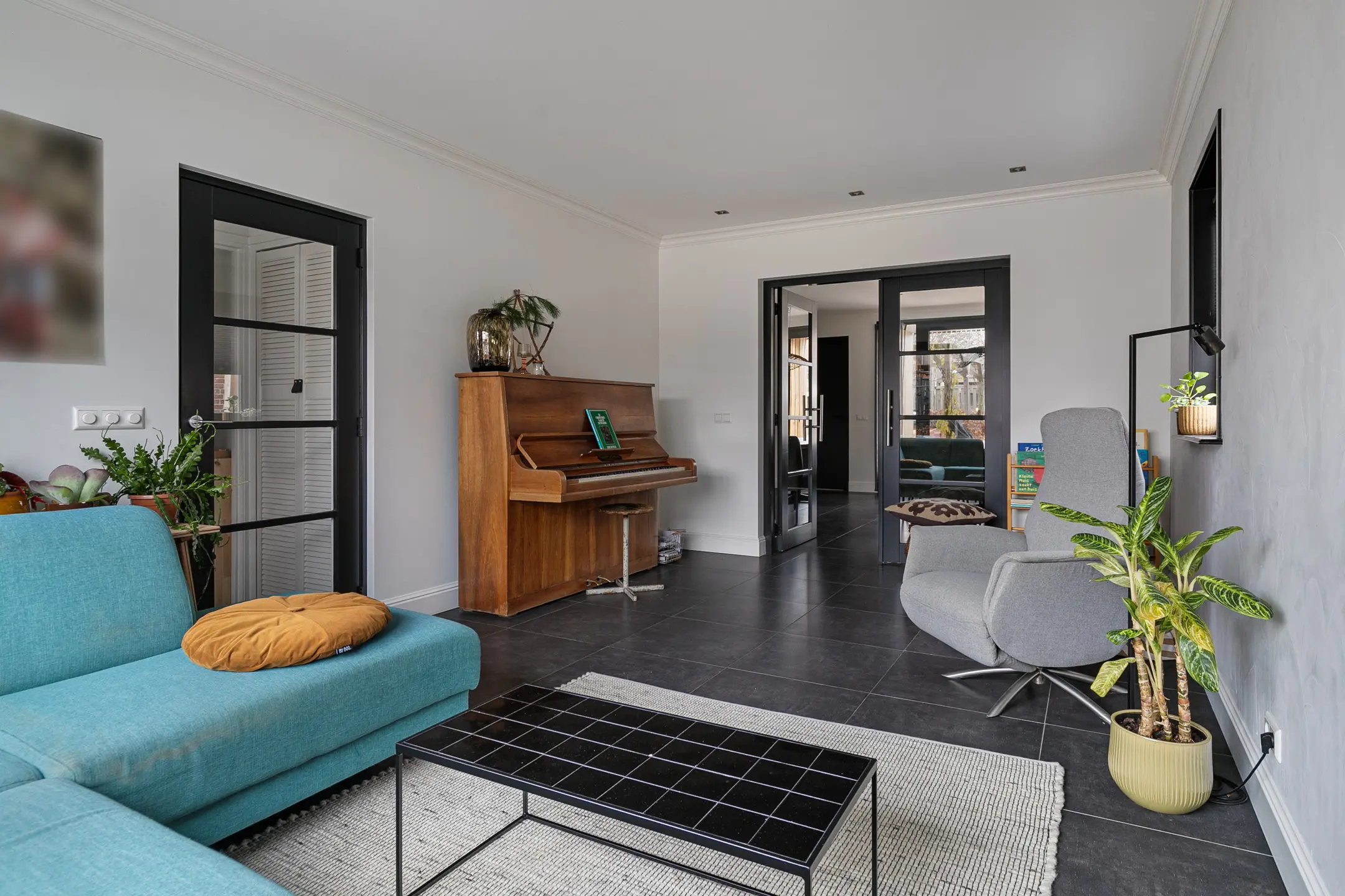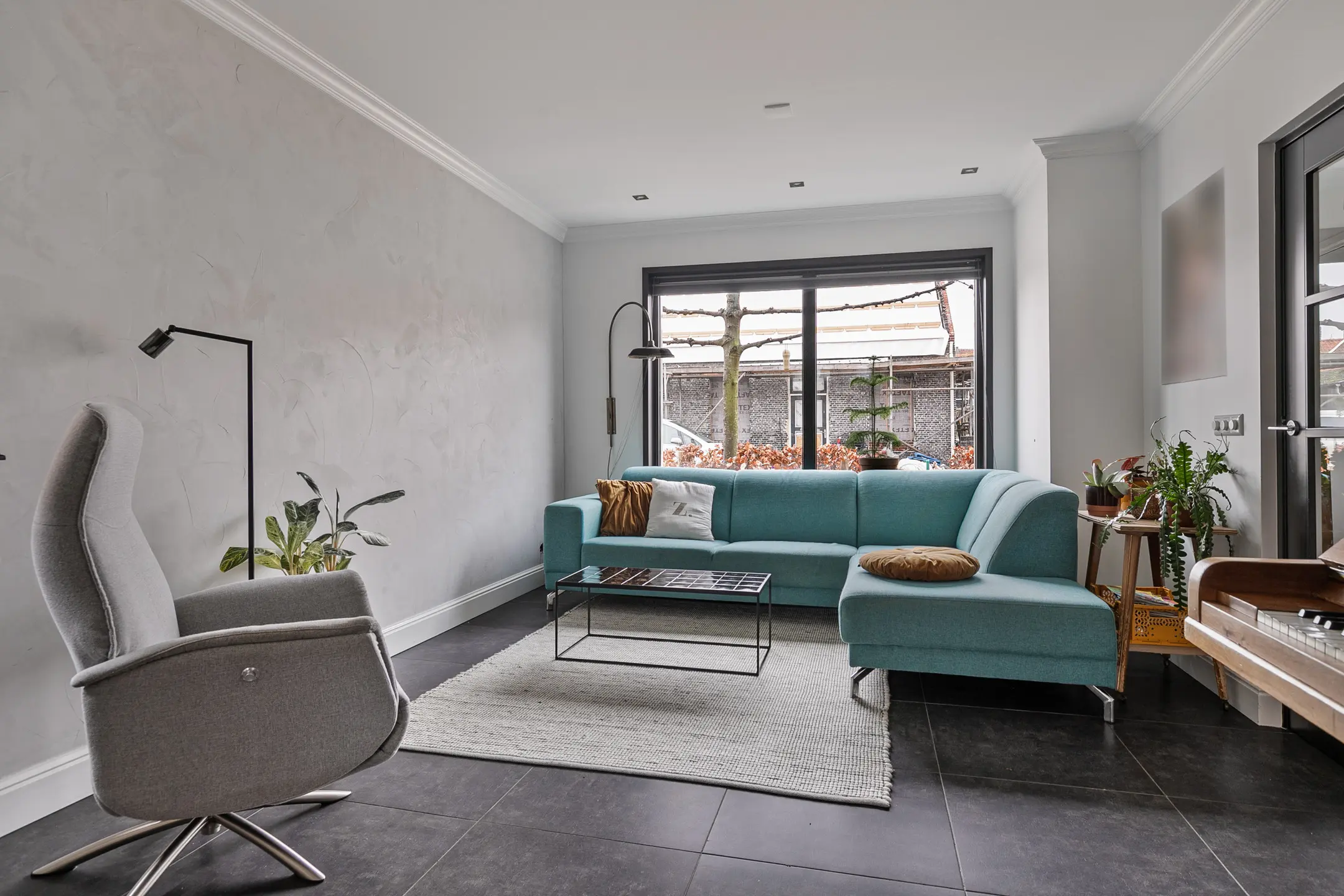 De begane grond is voorzien van vloerverwarming en afgewerkt met fraaie plavuizen die doorlopen in de woonkamer en keuken, wat zorgt voor een rustige en ruimtelijke uitstraling. De woonkamer is aangenaam licht dankzij het grote raam aan de voorzijde.