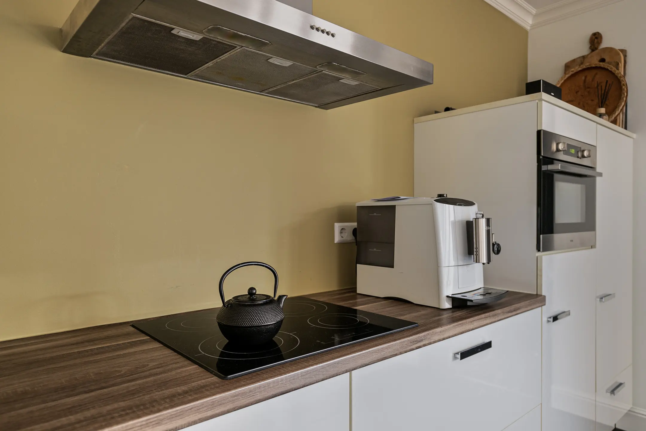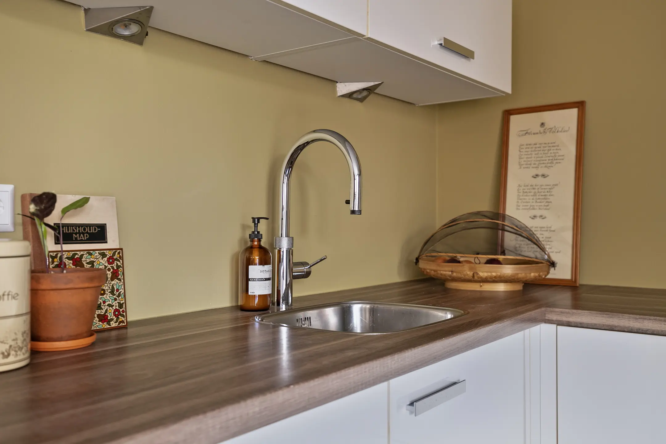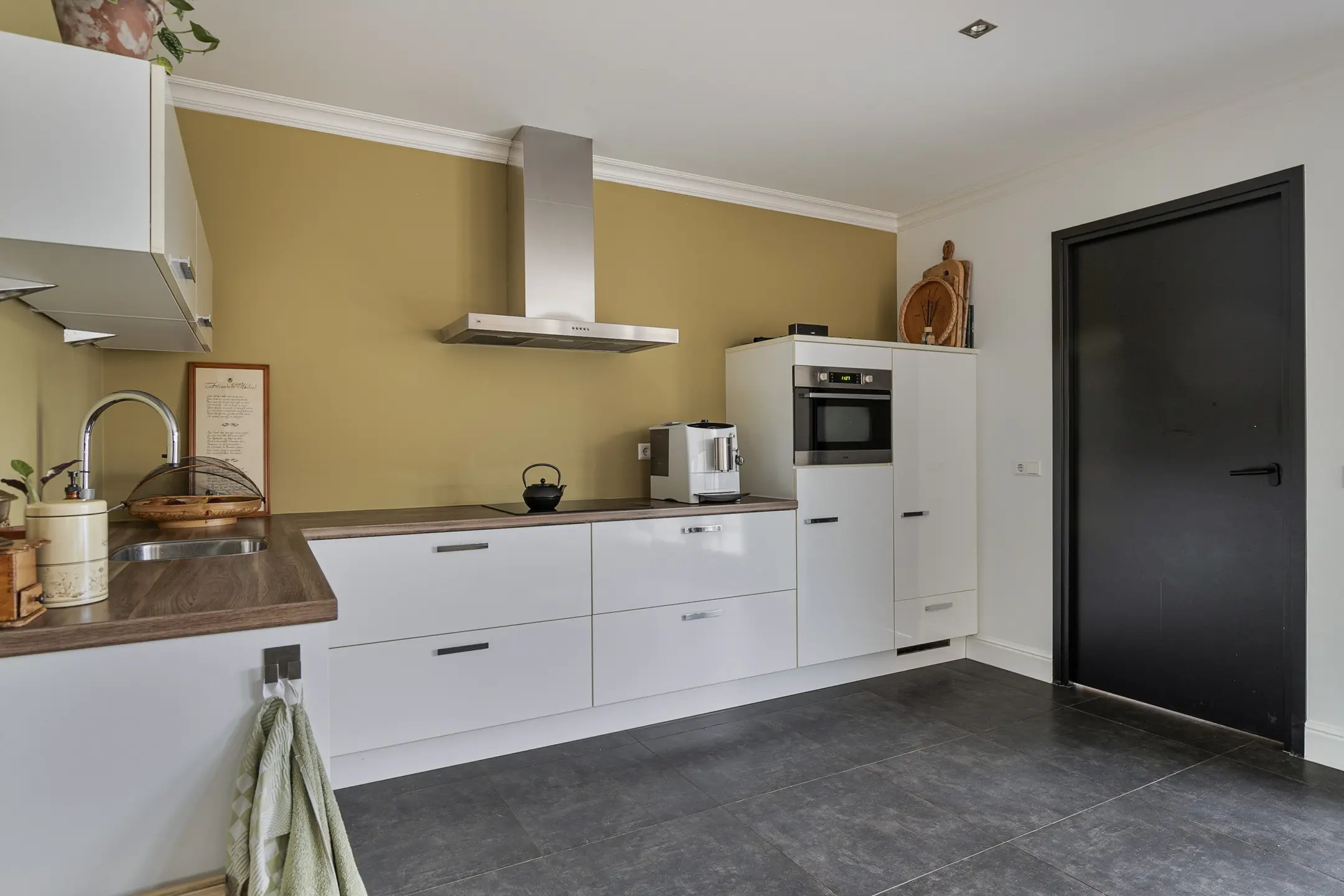 Aan de achterzijde bevindt zich de royale woonkeuken, dé plek voor gezellig samenzijn. Hier is volop ruimte voor een grote eettafel. De moderne hoekkeuken (2012) is compleet uitgerust met onder andere een koelkast, vaatwasser, combi-oven en een 4-pits inductiekookplaat met afzuigkap. Openslaande deuren verbinden de keuken met de tuin en de overkapping.