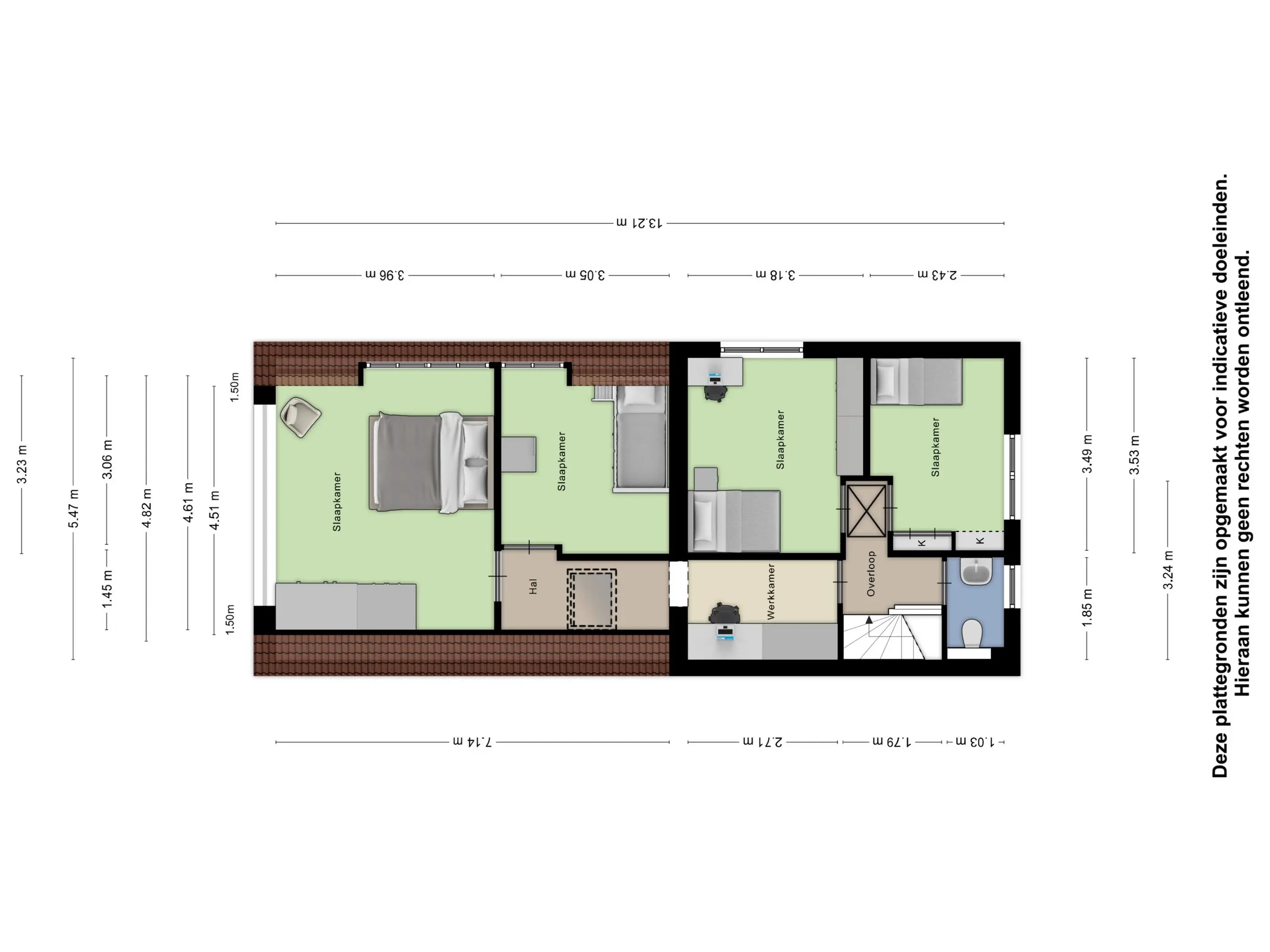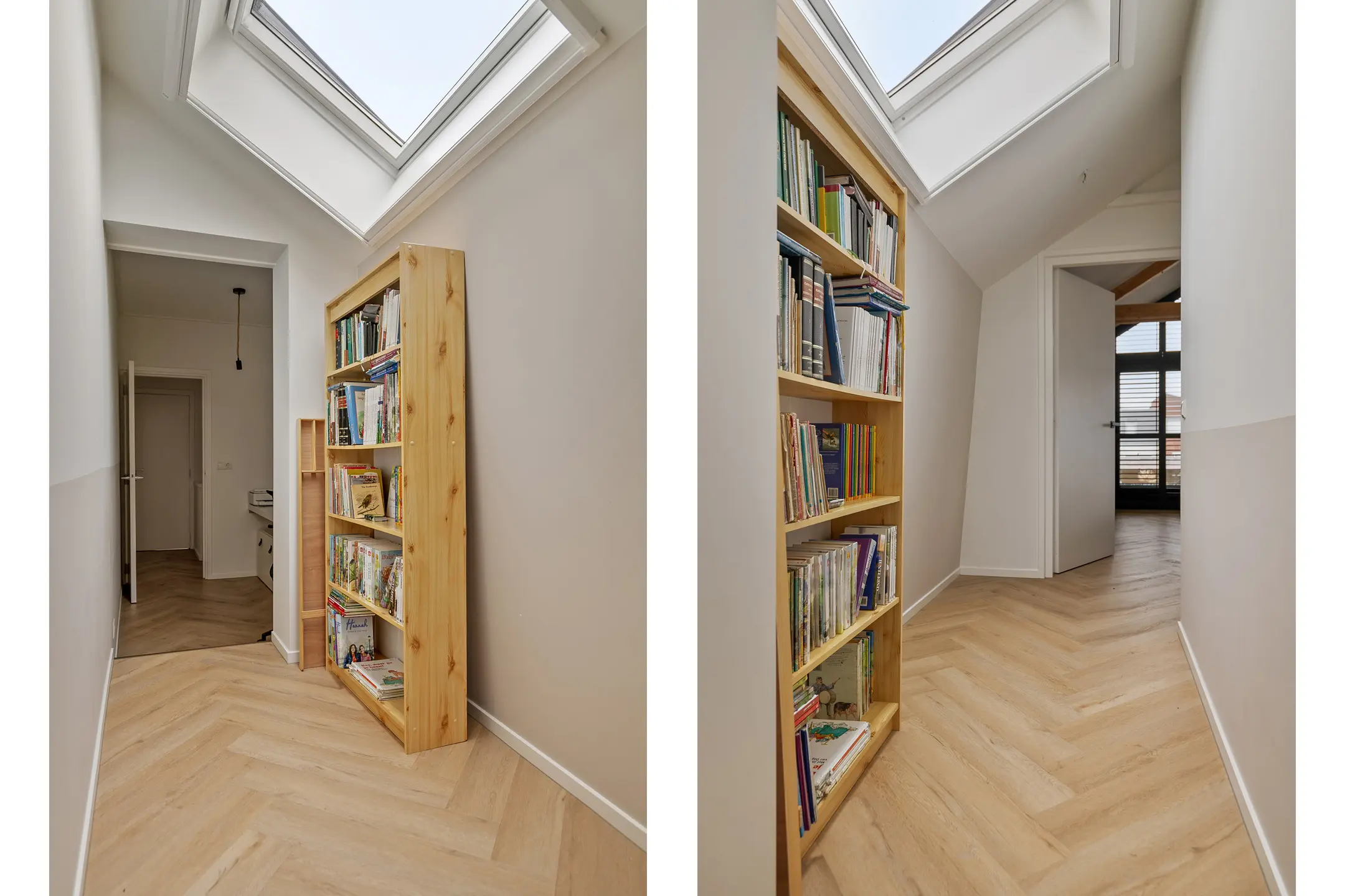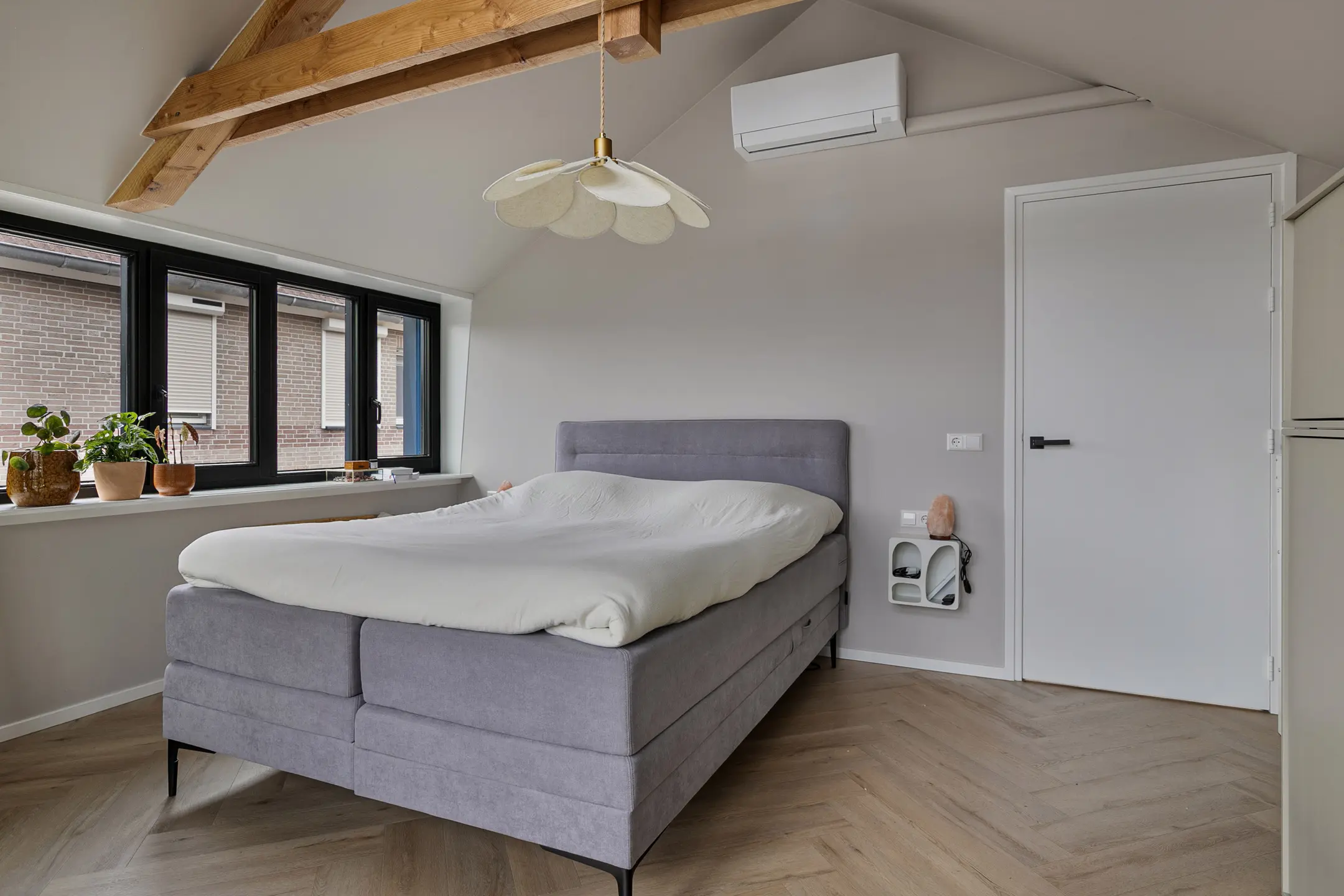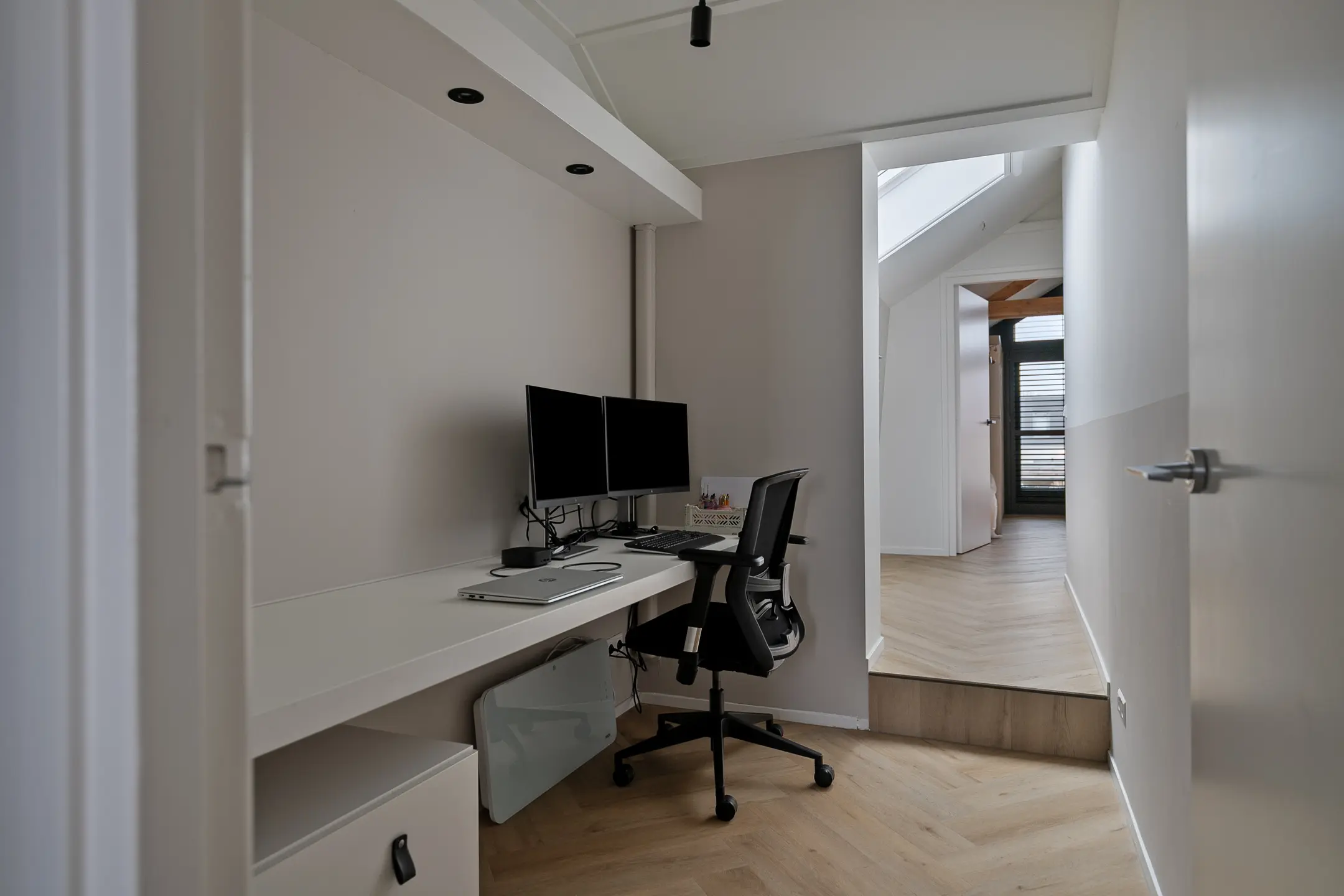 De gehele verdieping is afgewerkt met een stijlvolle pvc-vloer en strak afgewerkte wanden. Op de overloop is ruimte gecreëerd voor een werkplek en zorgt de aanwezige airconditioning voor een aangenaam binnenklimaat.
