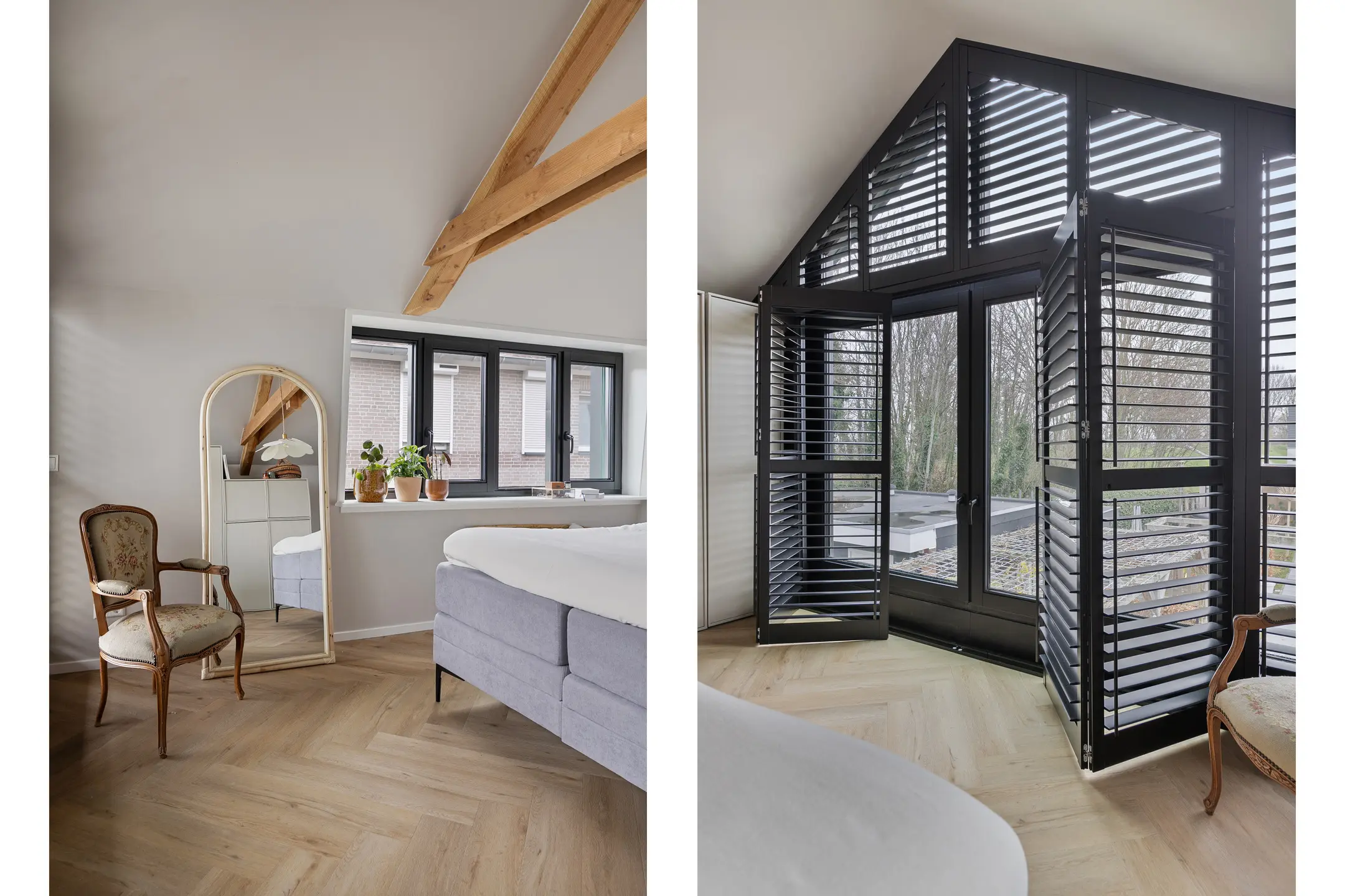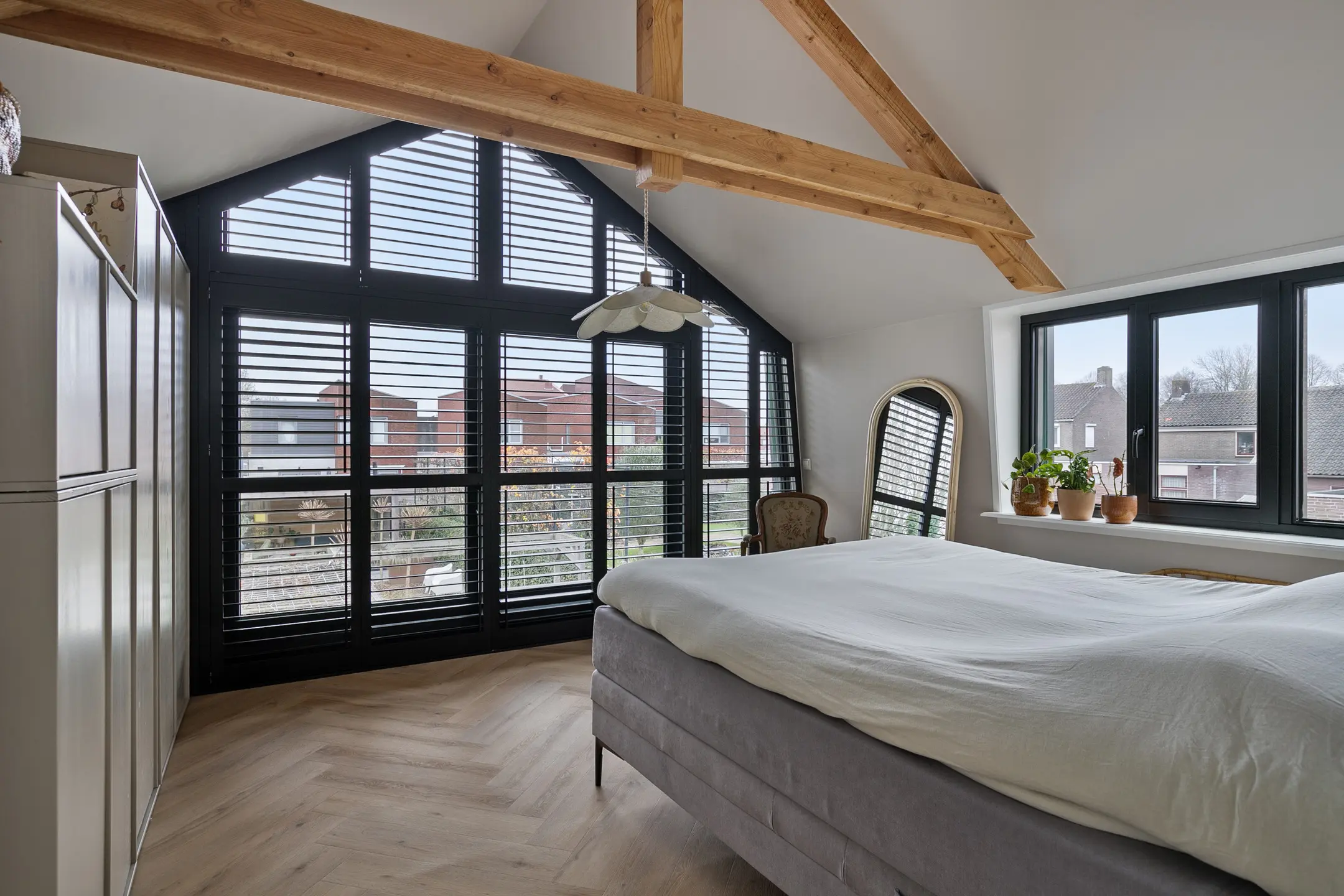 De slaapkamers aan de voorzijde zijn licht en ruim, beide voorzien van elektrisch bedienbare rolluiken, waarvan één met vaste kast. In de uitbouw bevinden zich nog twee ruime slaapkamers, eveneens voorzien van airconditioning. De hoofdslaapkamer is een echte eyecatcher dankzij de brede glazen pui met shutters en het fraaie uitzicht op de tuin.