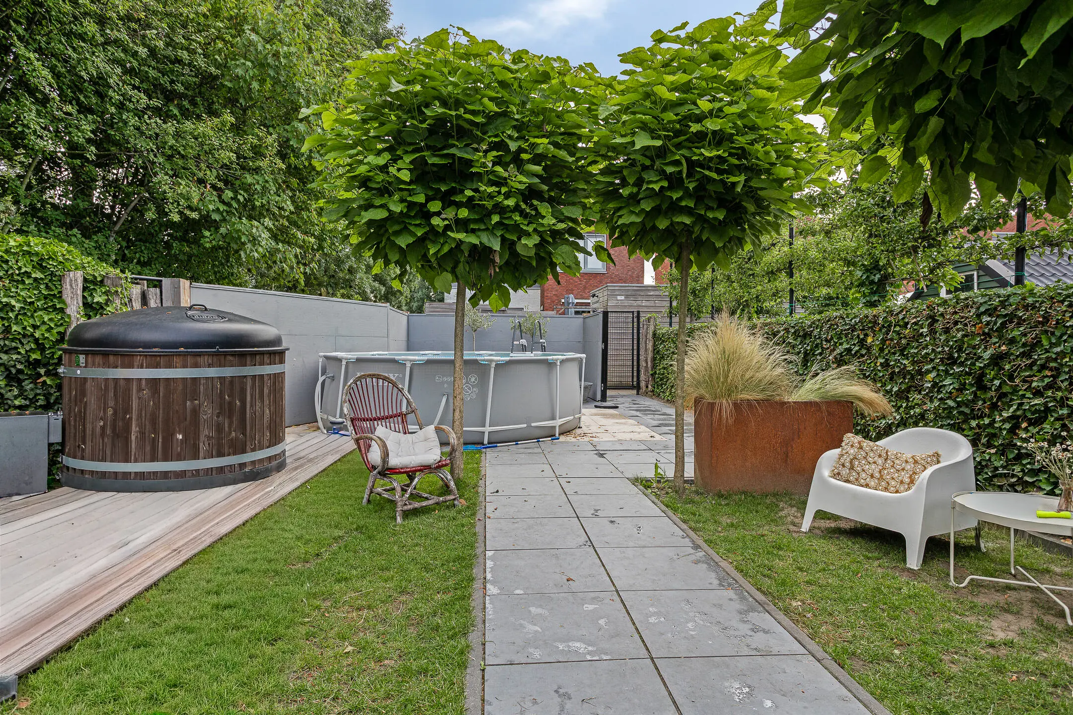 De fraai aangelegde tuin vormt een perfect verlengstuk van de woning. Met zorg ontworpen en onderhouden biedt deze tuin voor ieder wat wils. Er is ruimte voor een eethoek, een buitenkeuken, een hottub en zelfs een moestuin.