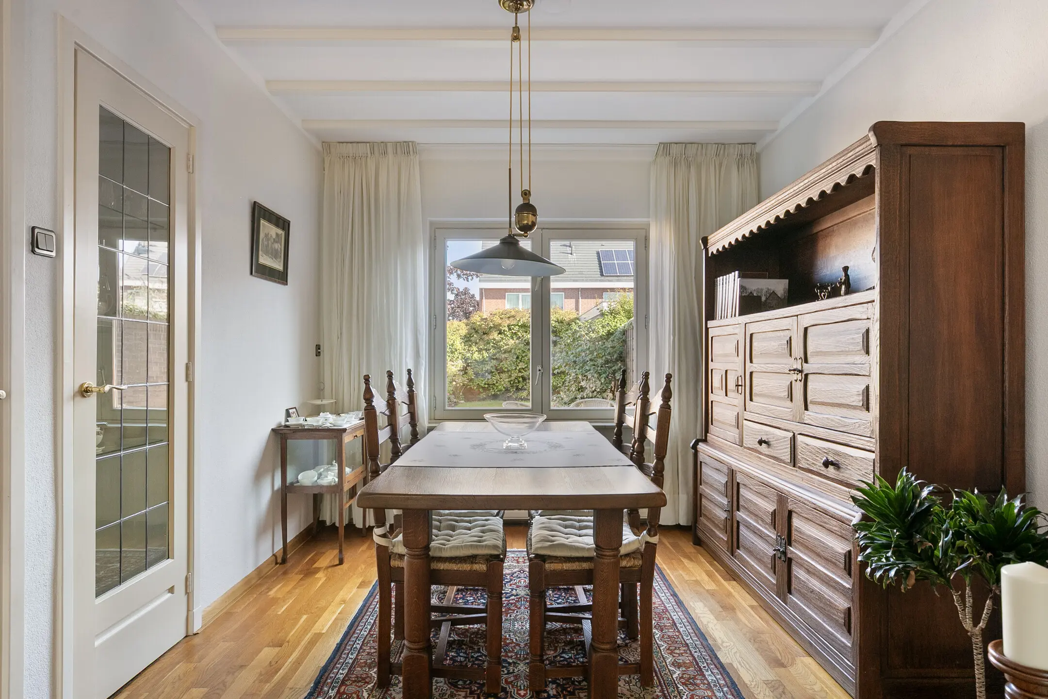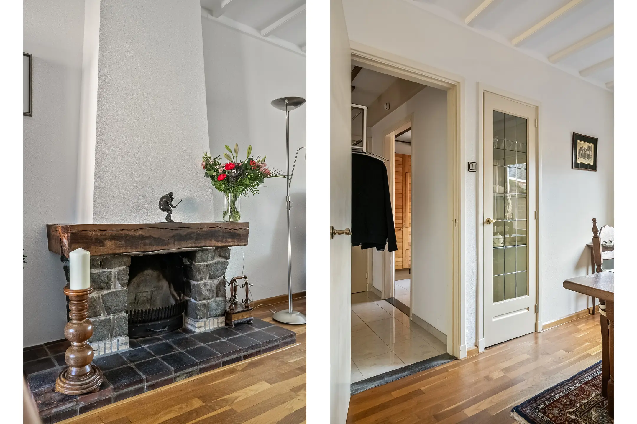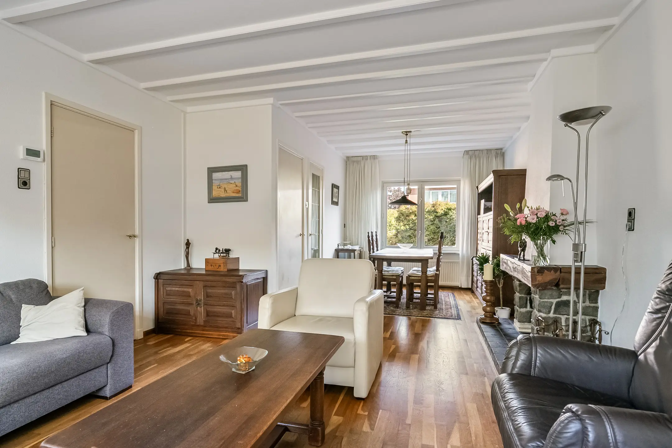 De woonkamer met massief eiken vloer is lekker licht en ruim opgezet. Aan de voorzijde bevindt zich het zitgedeelte, met een sfeervolle open haard (niet in gebruik) centraal in de ruimte. Achterin is er plek voor een royale eethoek. Extra praktisch: er is ook een vaste kast aanwezig.