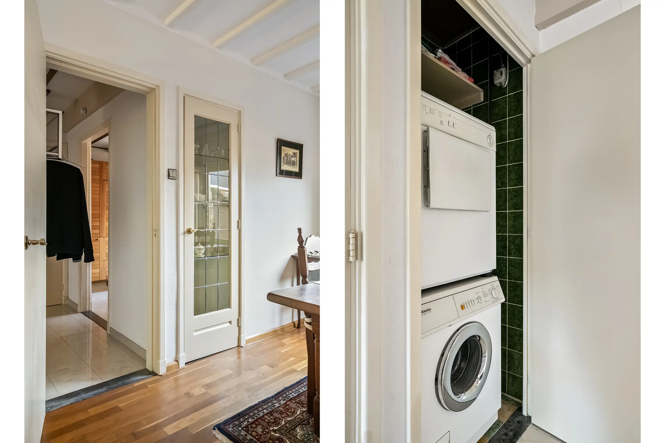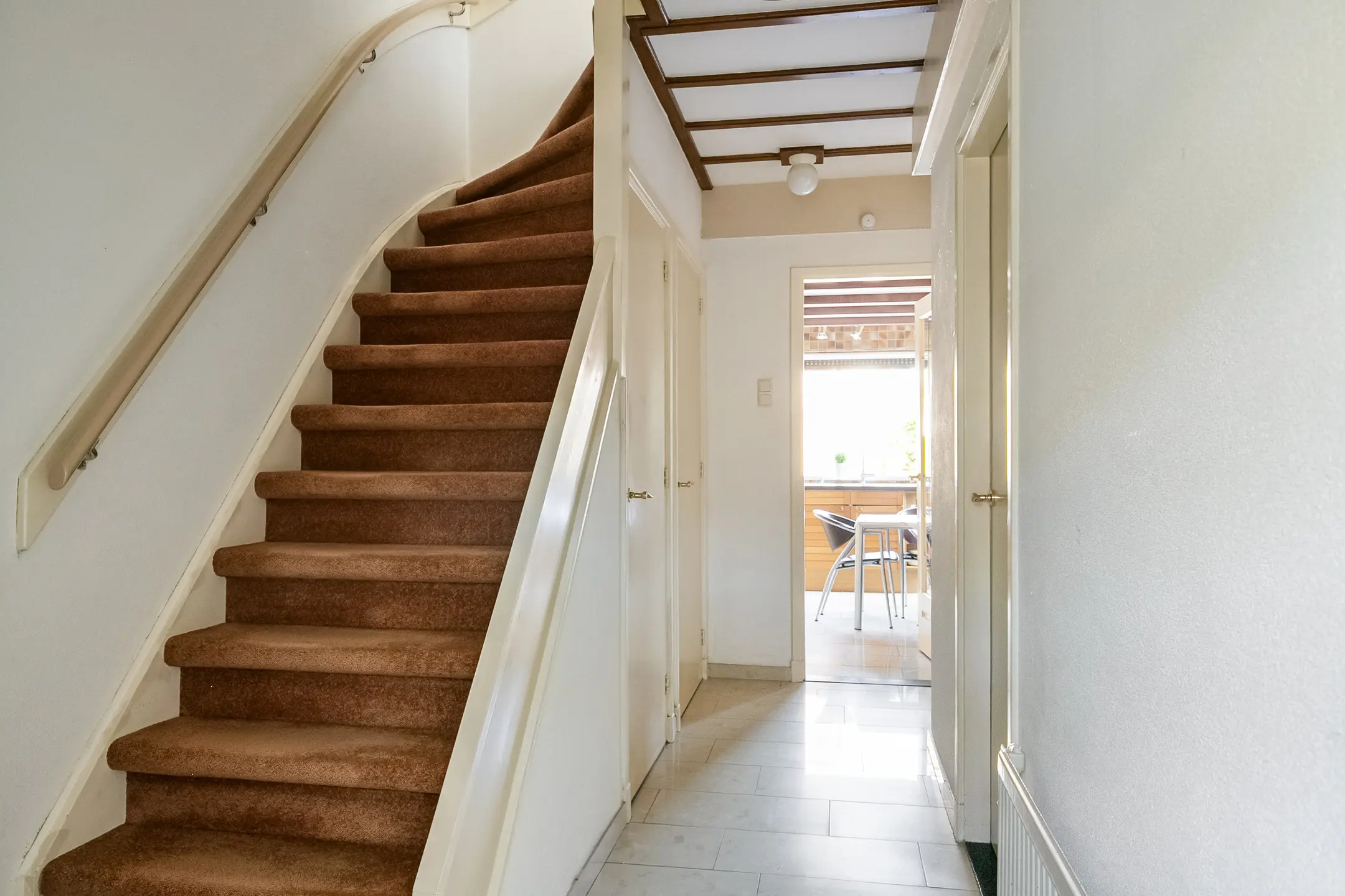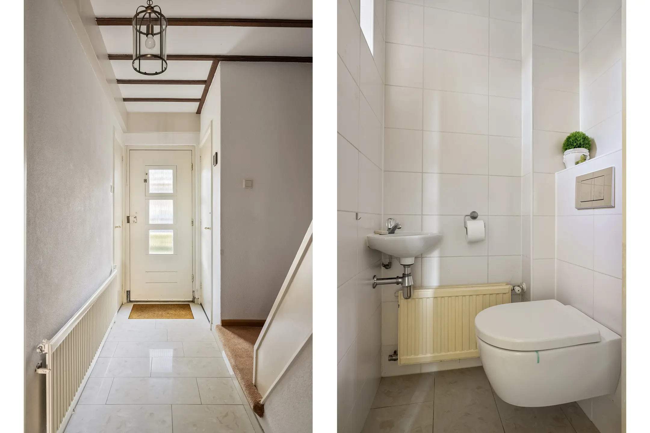 Je komt binnen in een ruime hal met een prettige indeling. Hier vind je de meterkast, het (hang)toilet met fonteintje, de trap naar boven, een kelderkast en een handige kast waar de wasmachine en droger netjes zijn weggewerkt. Daarnaast is er een nis voor de garderobe en heb je toegang tot zowel de keuken als de woonkamer.