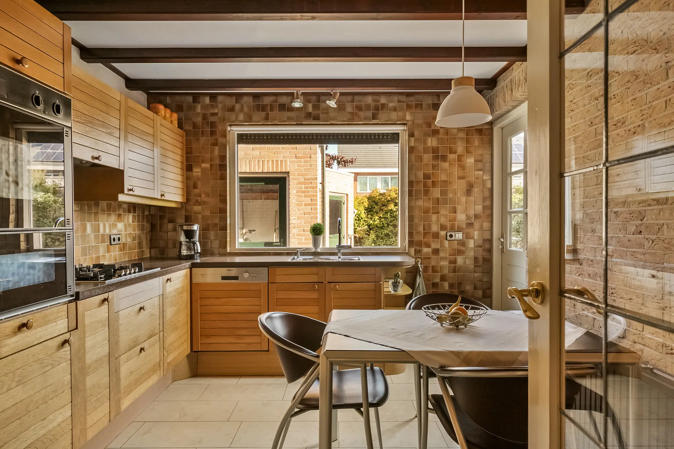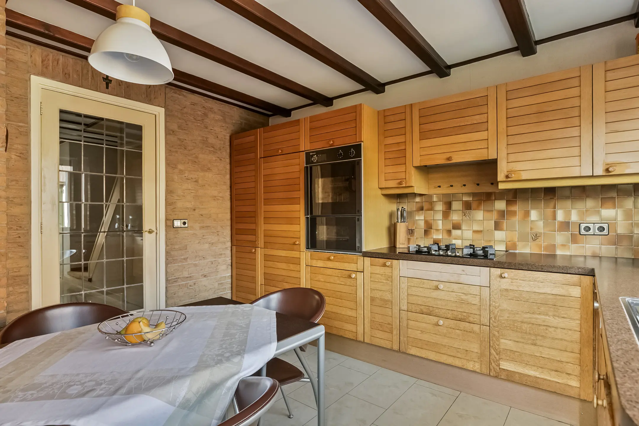 De keuken is bereikbaar via zowel de hal als de woonkamer en is geplaatst in een hoekopstelling. Je vindt hier een koelkast, vaatwasser, twee ovens, een 4-pits gasfornuis met afzuigkap én volop werkruimte. Dankzij het grote raam en de tuindeur valt hier veel daglicht naar binnen. De vloer is voorzien van plavuizen.