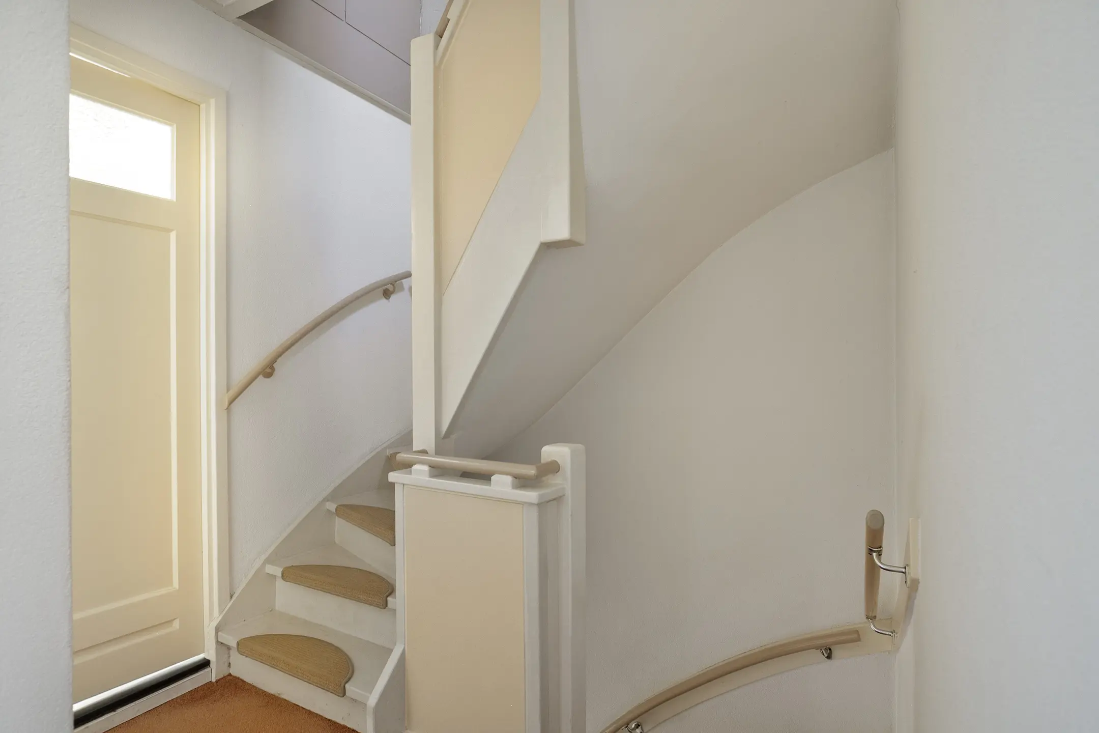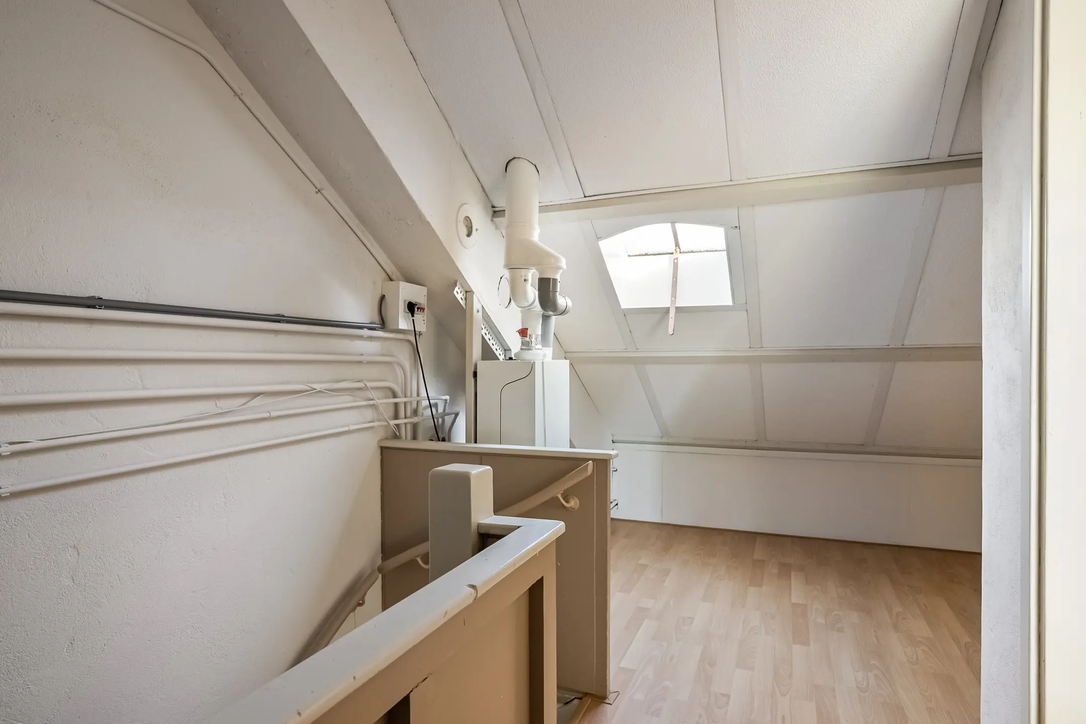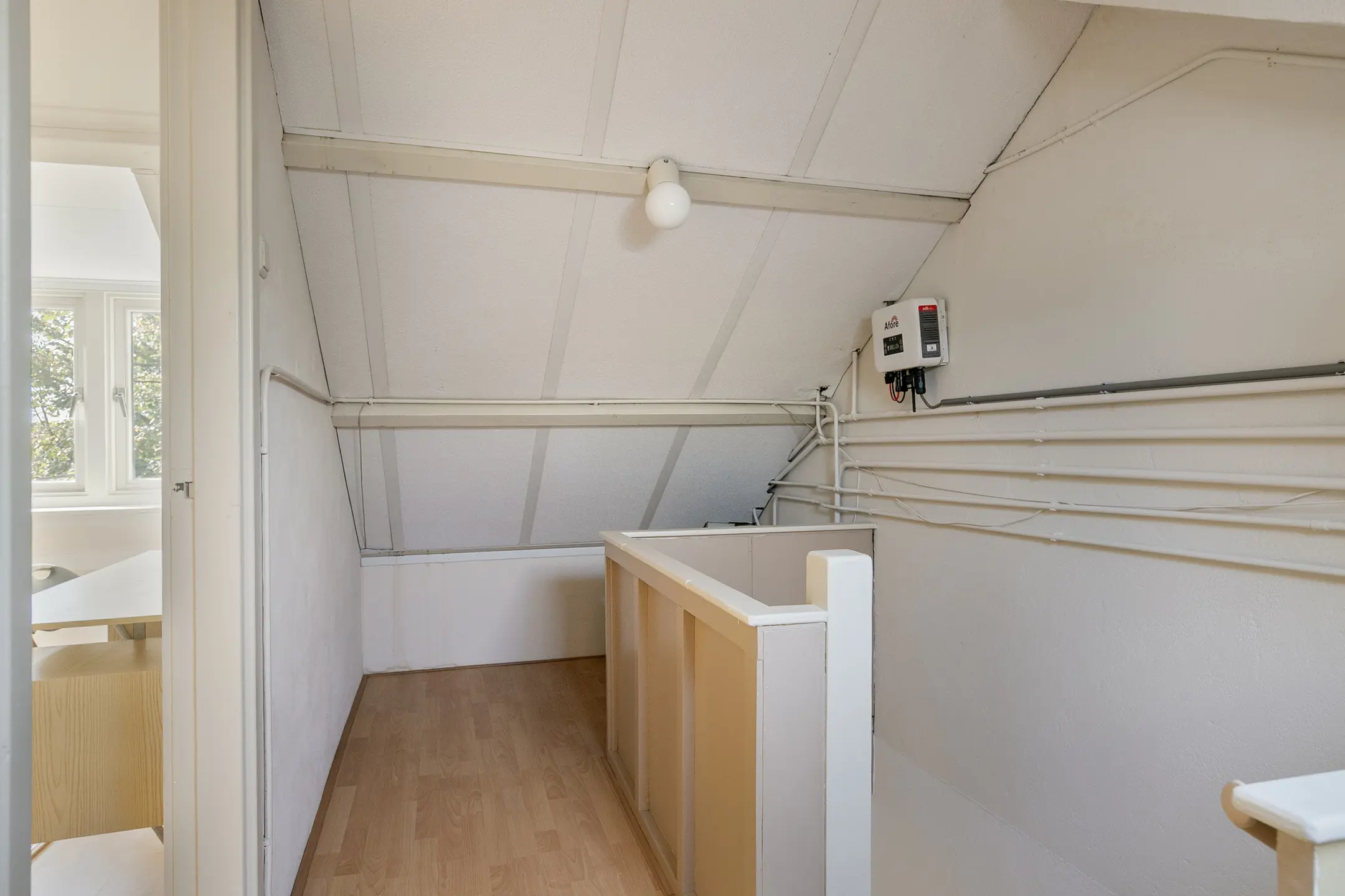 Op de tweede verdieping kom je eerst op een ruime en lichte overloop, met een dakraam dat zorgt voor prettig daglicht. Hier vind je de opstelplaats van de CV-ketel en de omvormer voor de zonnepanelen. Daarnaast is er volop ruimte — handig voor seizoensspullen, koffers of andere spullen die je niet dagelijks nodig hebt.