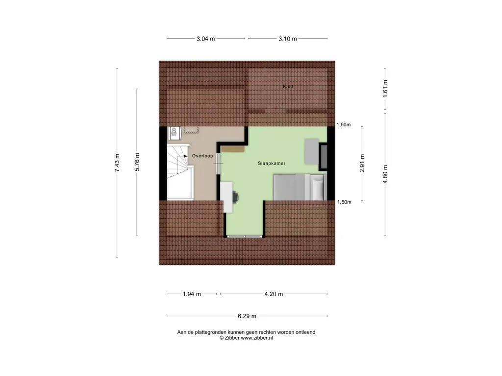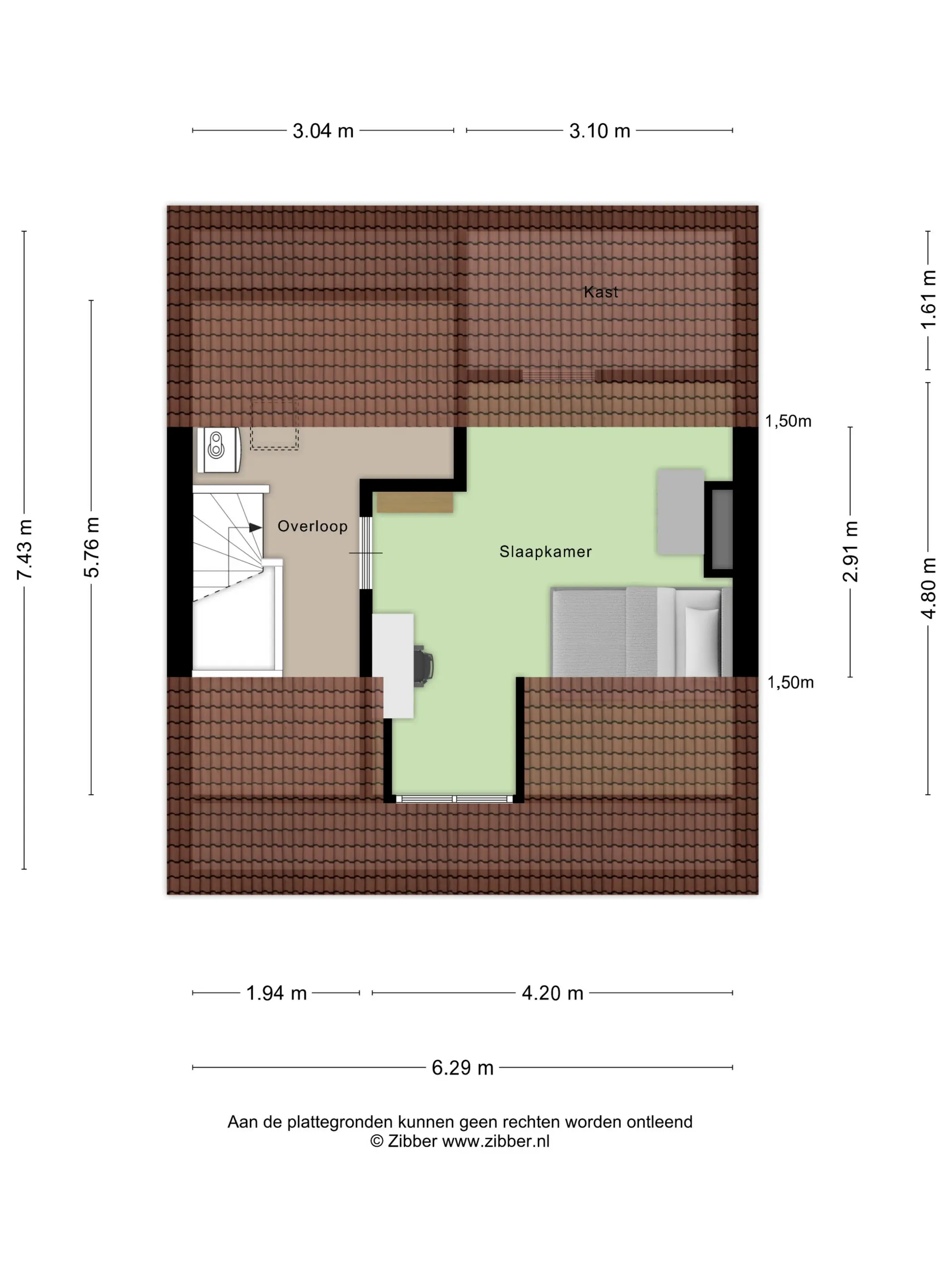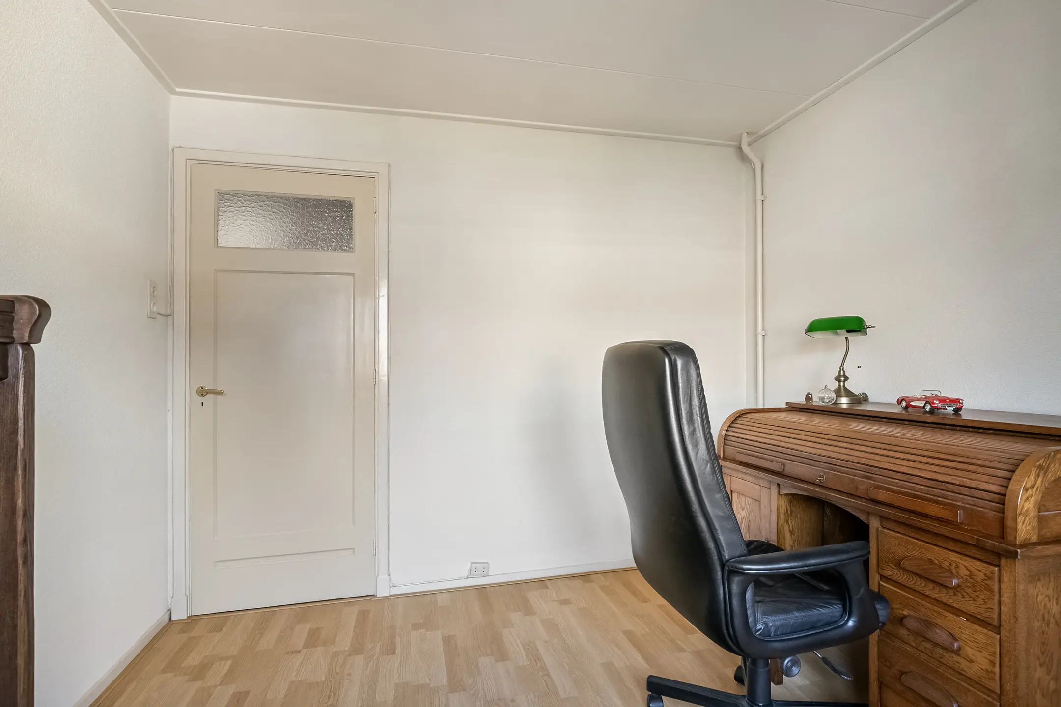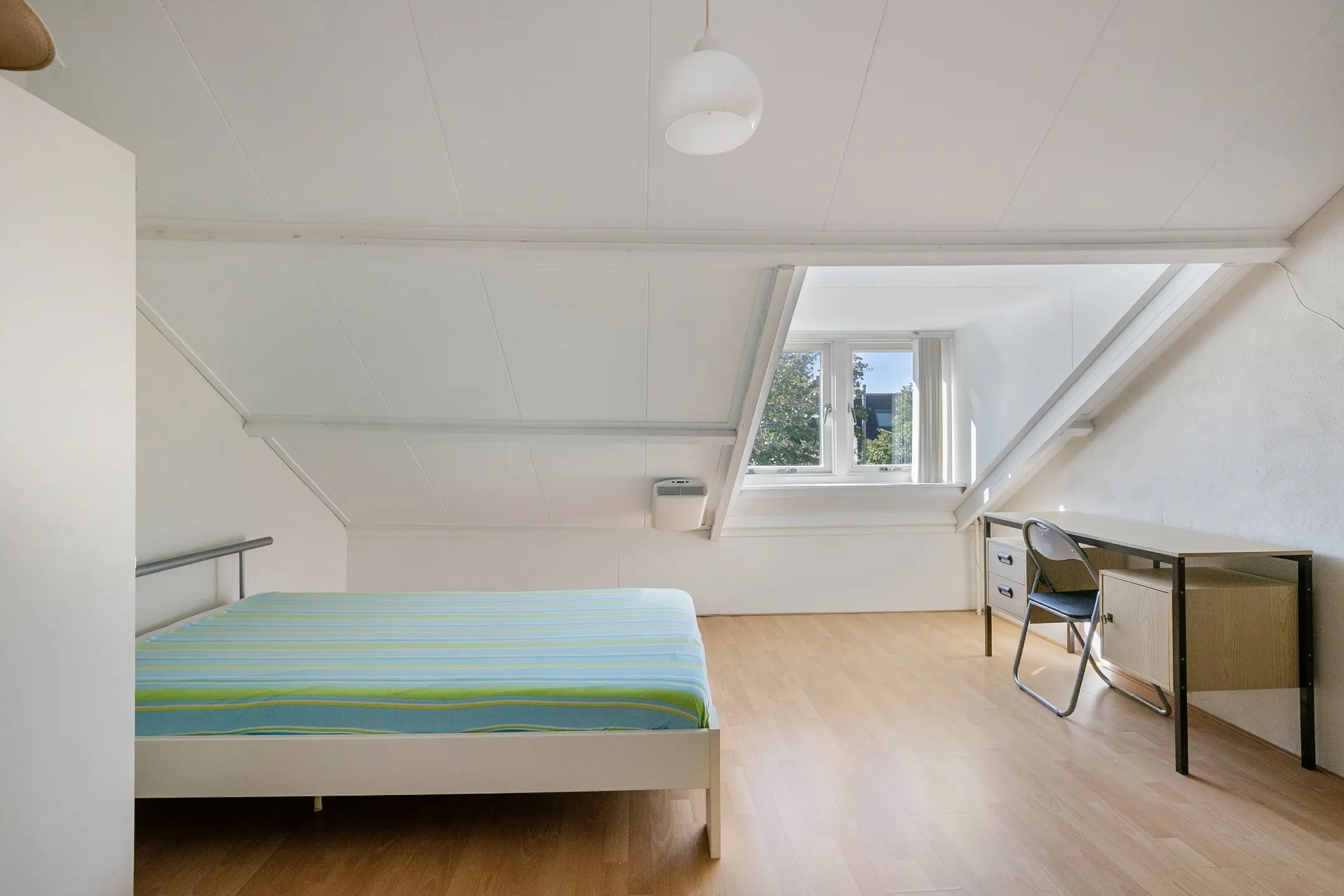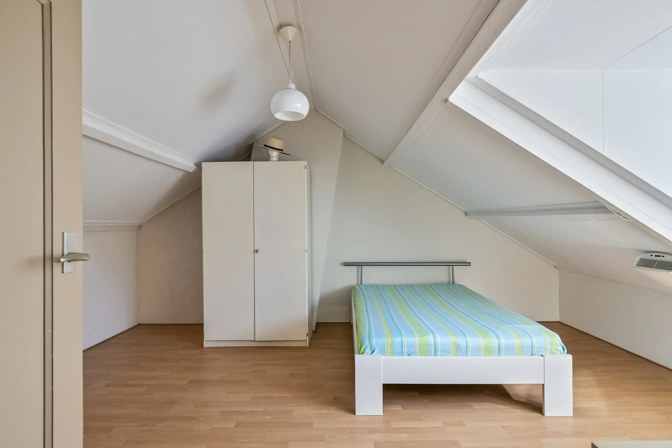 Achter de deur ligt slaapkamer nummer vier. Dankzij de dakkapel is dit een verrassend lichte en ruime kamer geworden. Hier zijn knieschotten aanwezig voor extra opbergruimte. Deze verdieping is multifunctioneel en kan helemaal naar wens worden ingericht — of je nu een extra slaapkamer, een rustige thuiswerkplek of een hobbyruimte zoekt!
