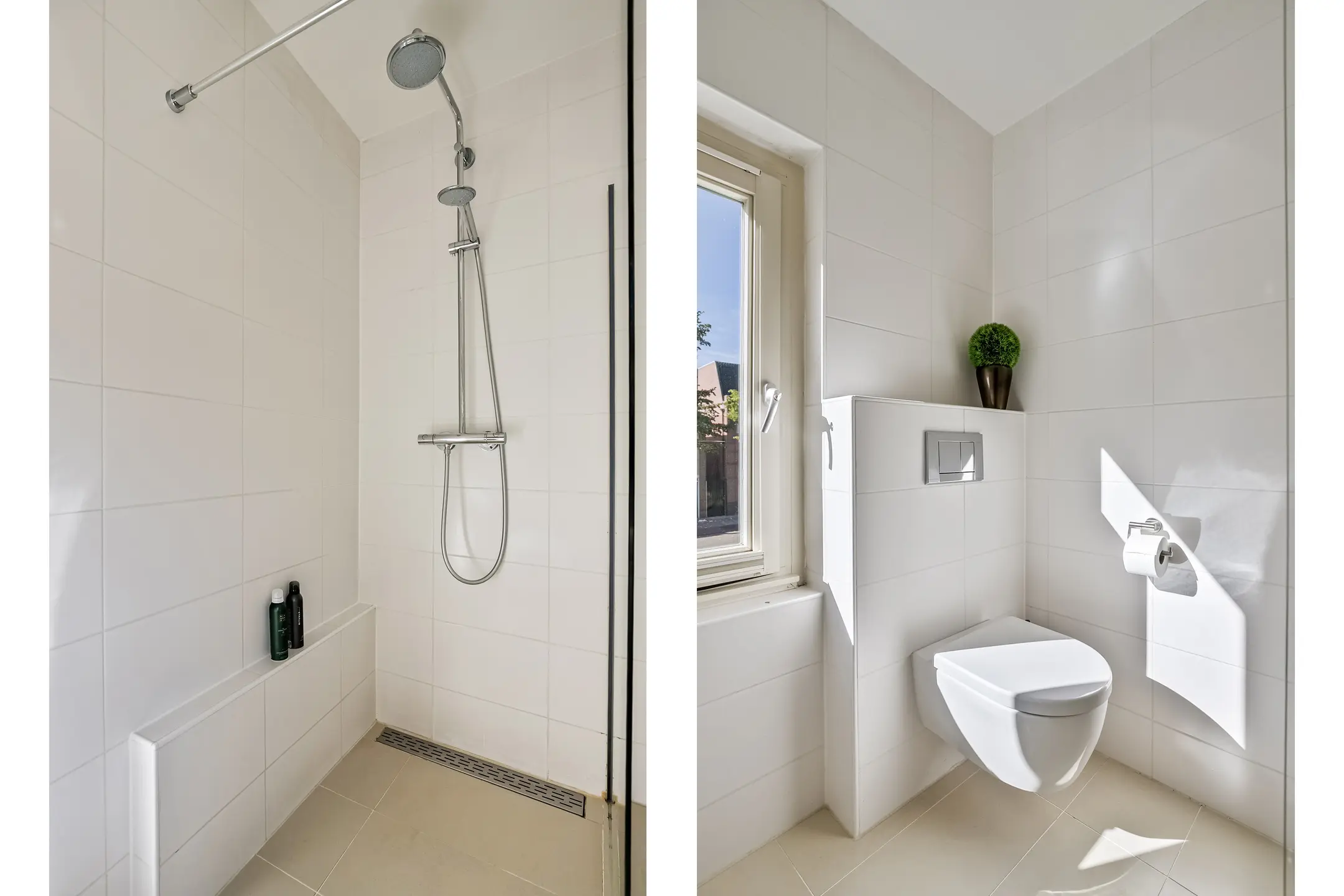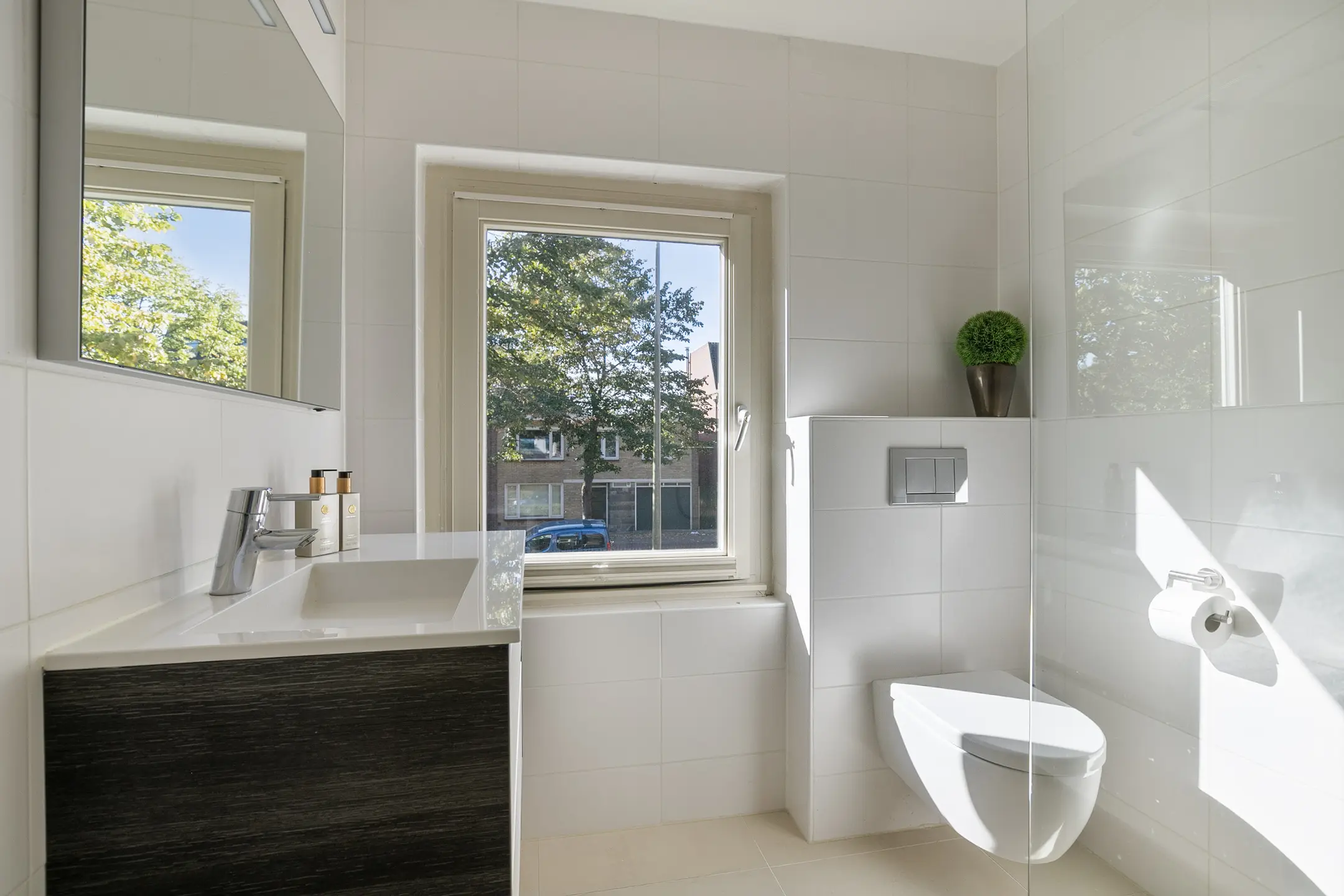 De badkamer is modern, netjes onderhouden en dankzij het grote raam heerlijk licht. Je vindt hier een inloopdouche, (hang)toilet en een wastafel met badmeubel.