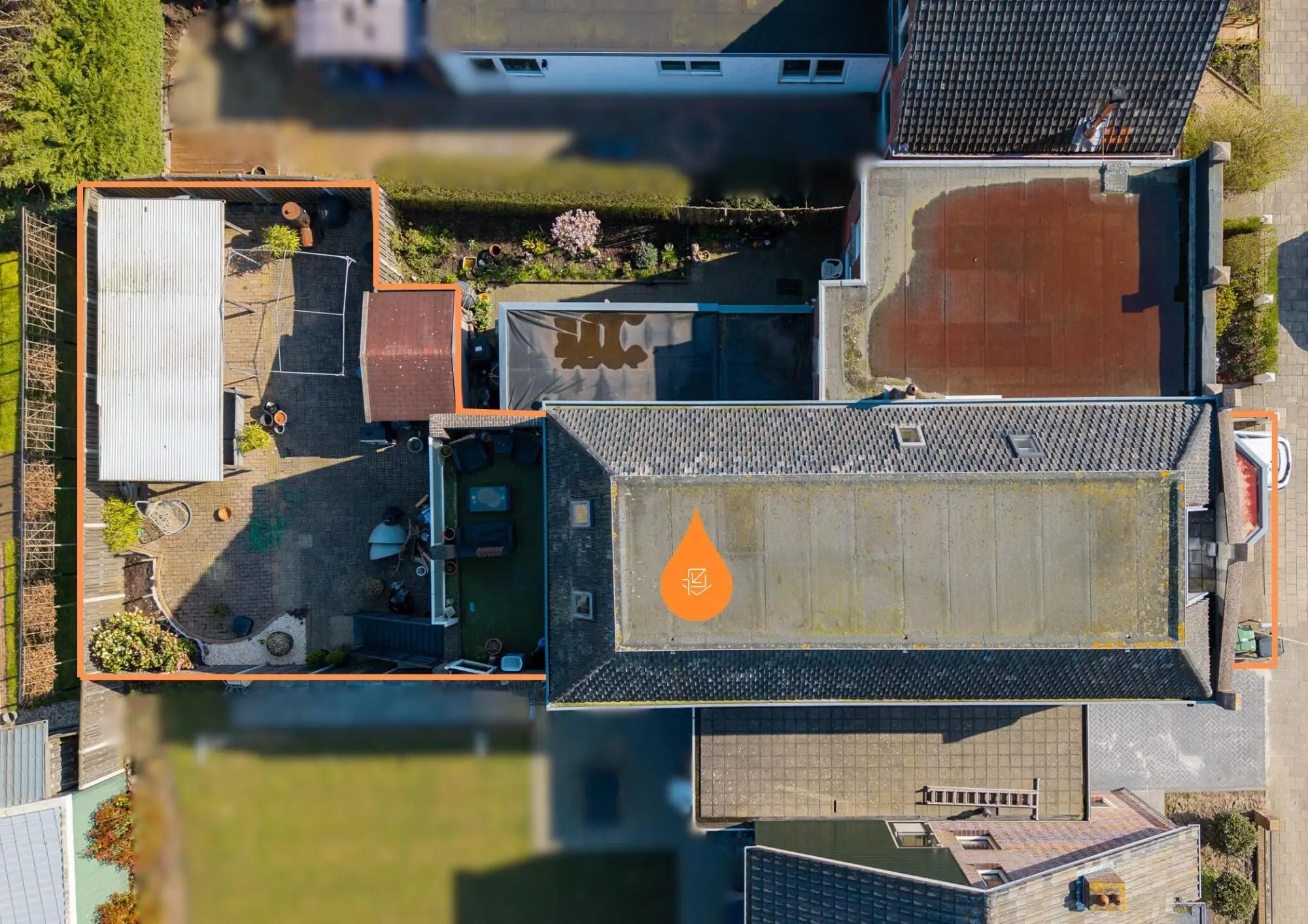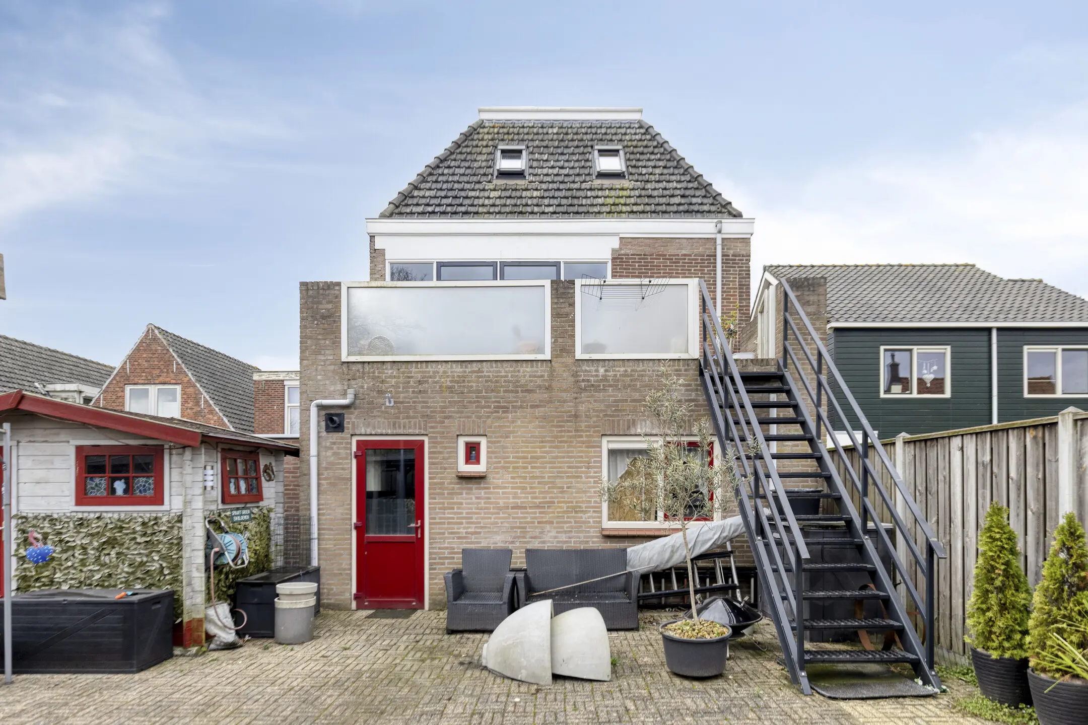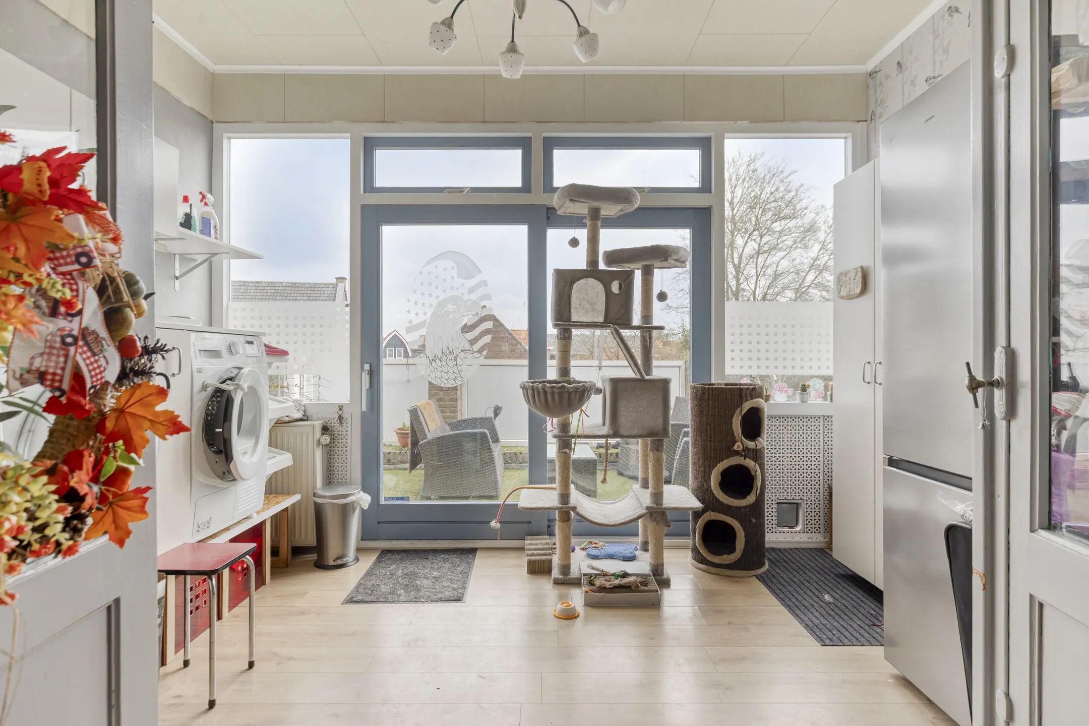 Aan de achterzijde is een grote bijkeuken gerealiseerd met toegang tot het dakterras. Vanaf het dakterras is er tevens een verbinding met de achtertuin.