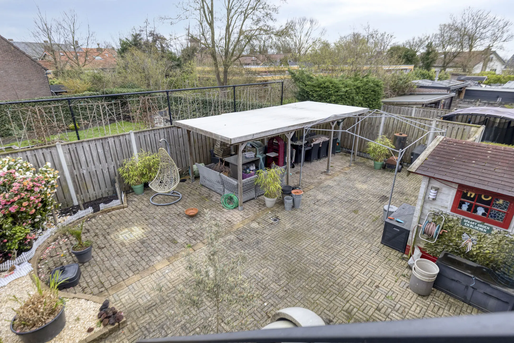 Achter de garage bevindt zich een praktische hal met de cv-opstelling en een ruime kantine of hobbyruimte. In de hal aan de achterzijde bestaat tevens de mogelijkheid om een extra toilet te realiseren. Vanuit deze ruimte is er toegang tot de achtertuin, voorzien van een overkapping en een tuinhuis. Tevens is de eerste verdieping rechtstreeks vanuit de tuin bereikbaar via een recent gepoedercoate trapopgang.