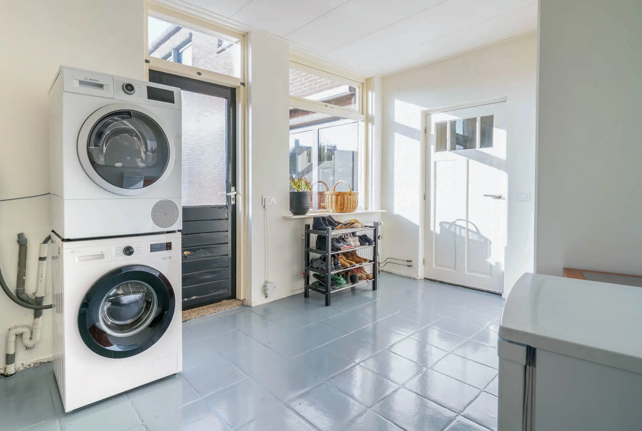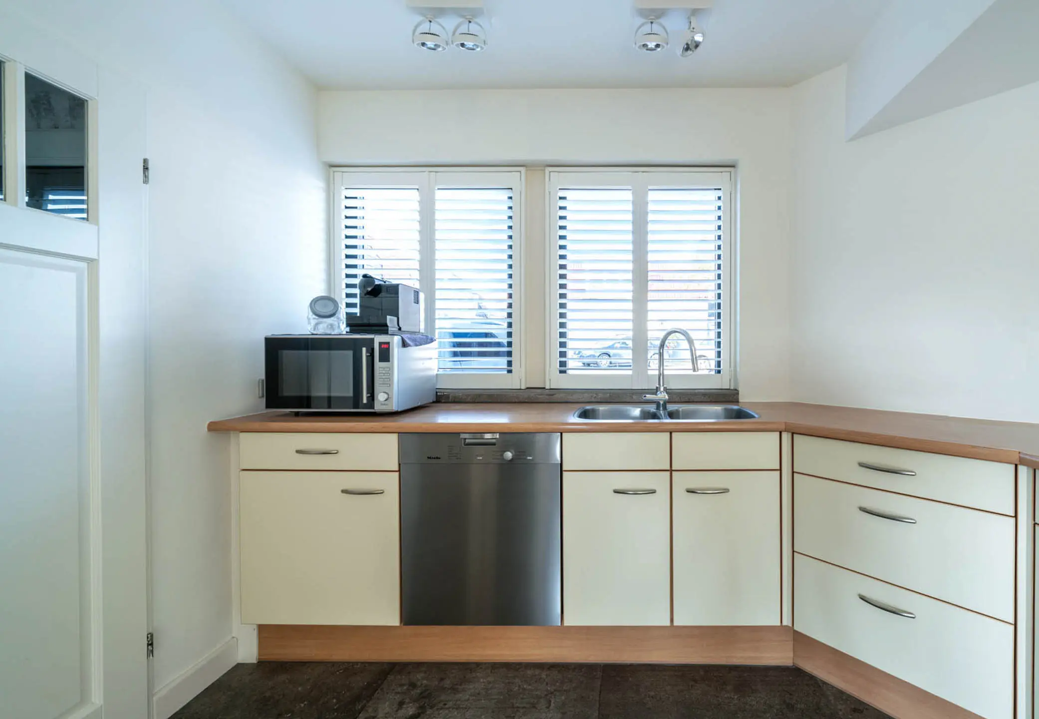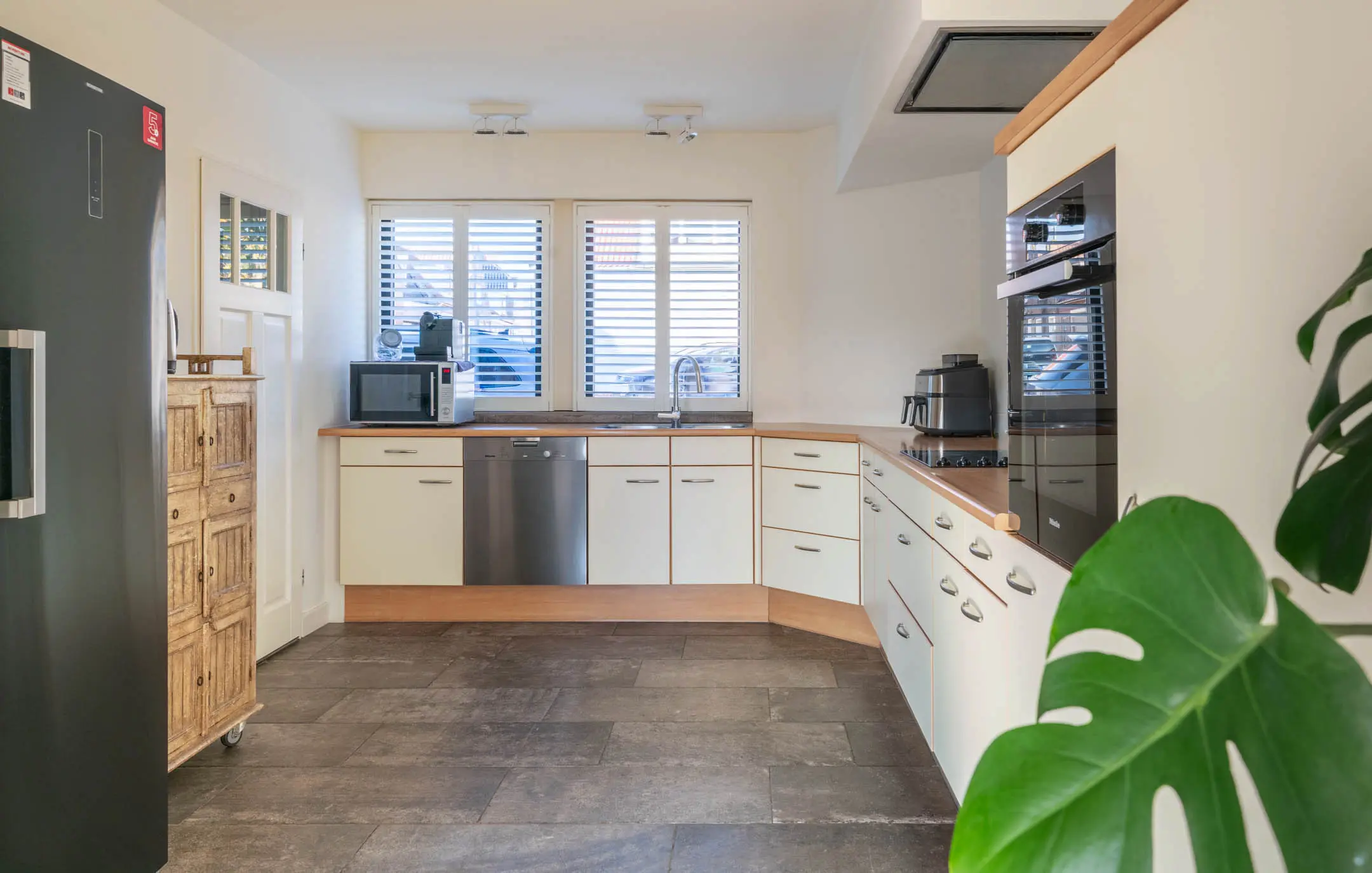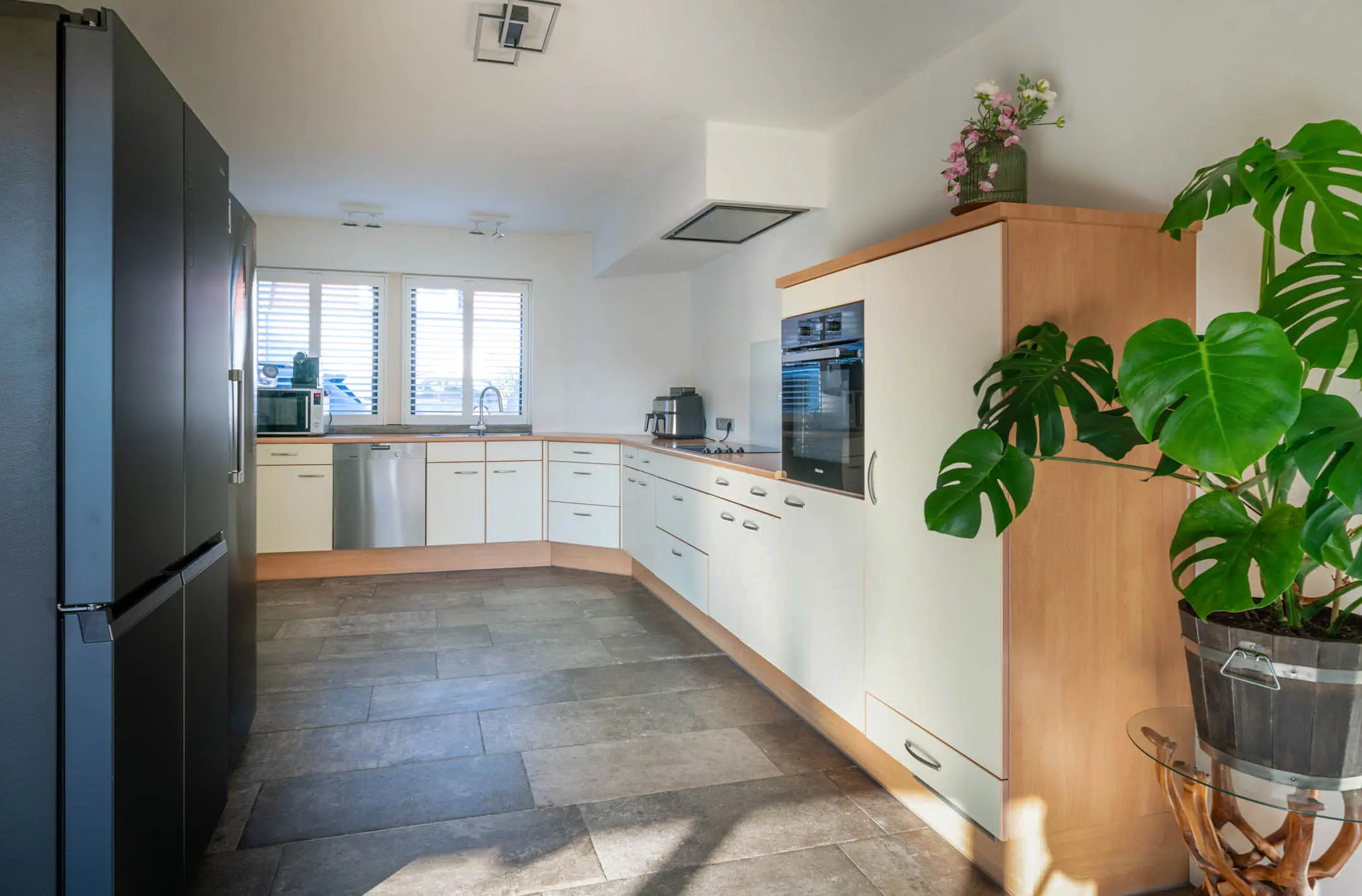 Via zowel de woonkamer als de hal loop je door naar de indrukwekkend ruime woonkeuken van 38 m², voorzien van een groot keukenblok met diverse inbouwapparatuur. Aangrenzend ligt de praktische bijkeuken met vaste kast, aanrechtblad met wasbak en aansluiting voor witgoed.
