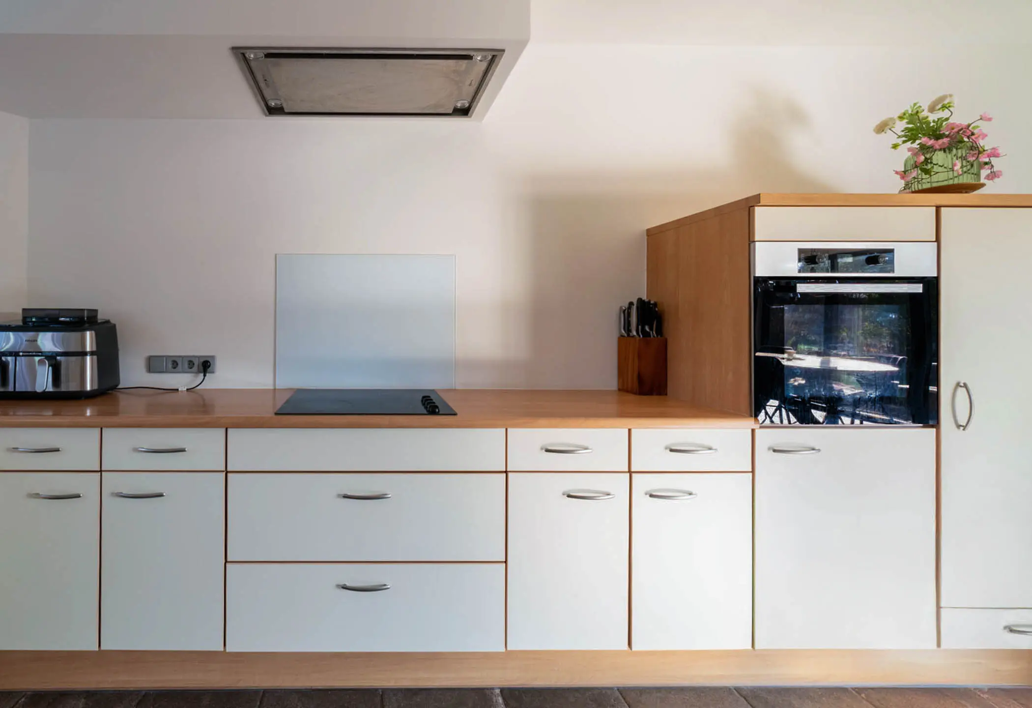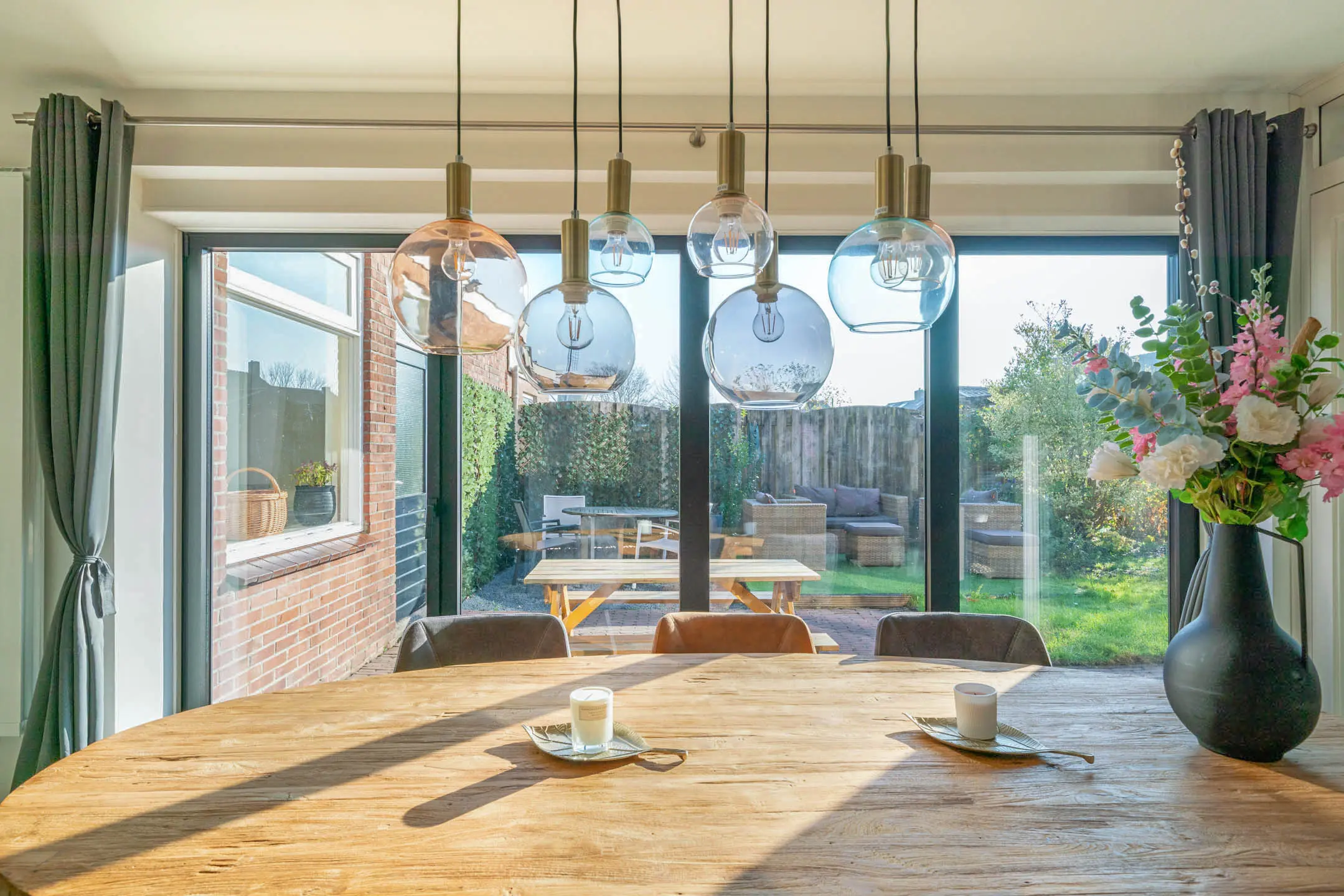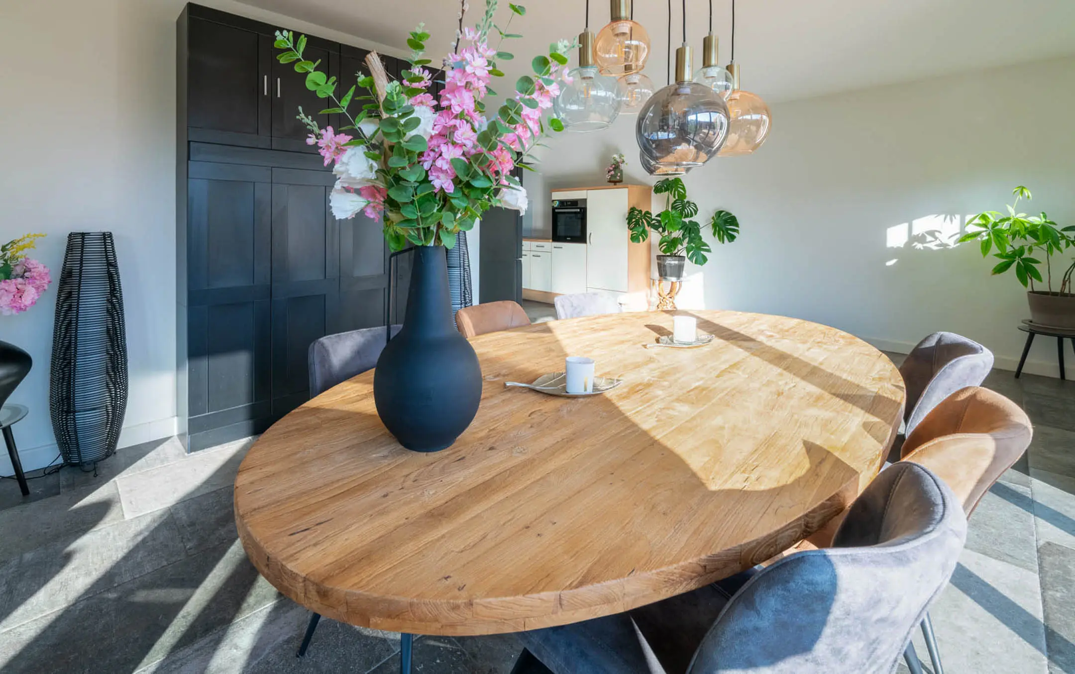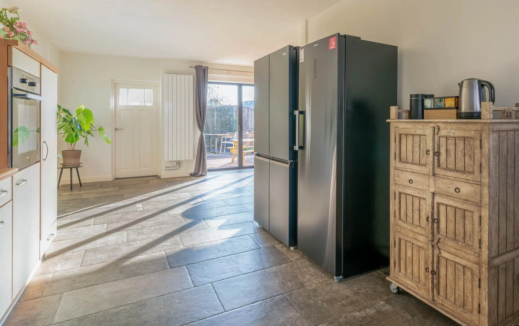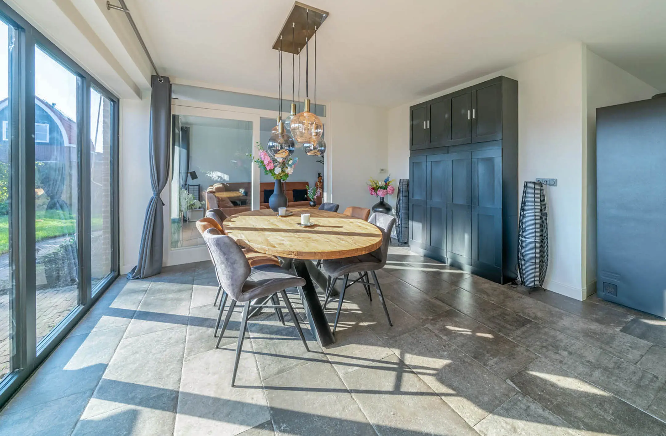 Via zowel de woonkamer als de hal loop je door naar de indrukwekkend ruime woonkeuken van 38 m², voorzien van een groot keukenblok met diverse inbouwapparatuur. Aangrenzend ligt de praktische bijkeuken met vaste kast, aanrechtblad met wasbak en aansluiting voor witgoed.