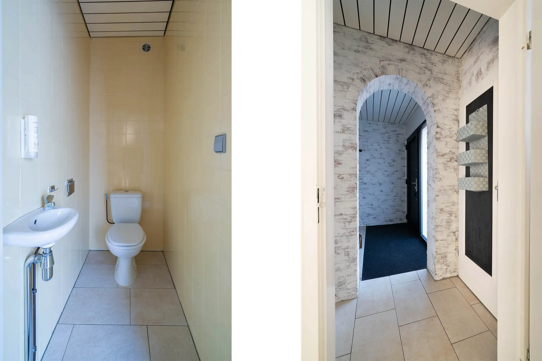 Je komt binnen in een ruime entree met meterkast en vaste kast, waar ook de trap naar de eerste verdieping bevindt. Vanuit de hal bereik je de woonkamer, het toilet en de woonkeuken. De woonkamer is ingedeeld in een sfeervolle voorkamer en een gezellige achterkamer, gescheiden door een strak afgewerkte Faber gashaard (2014).