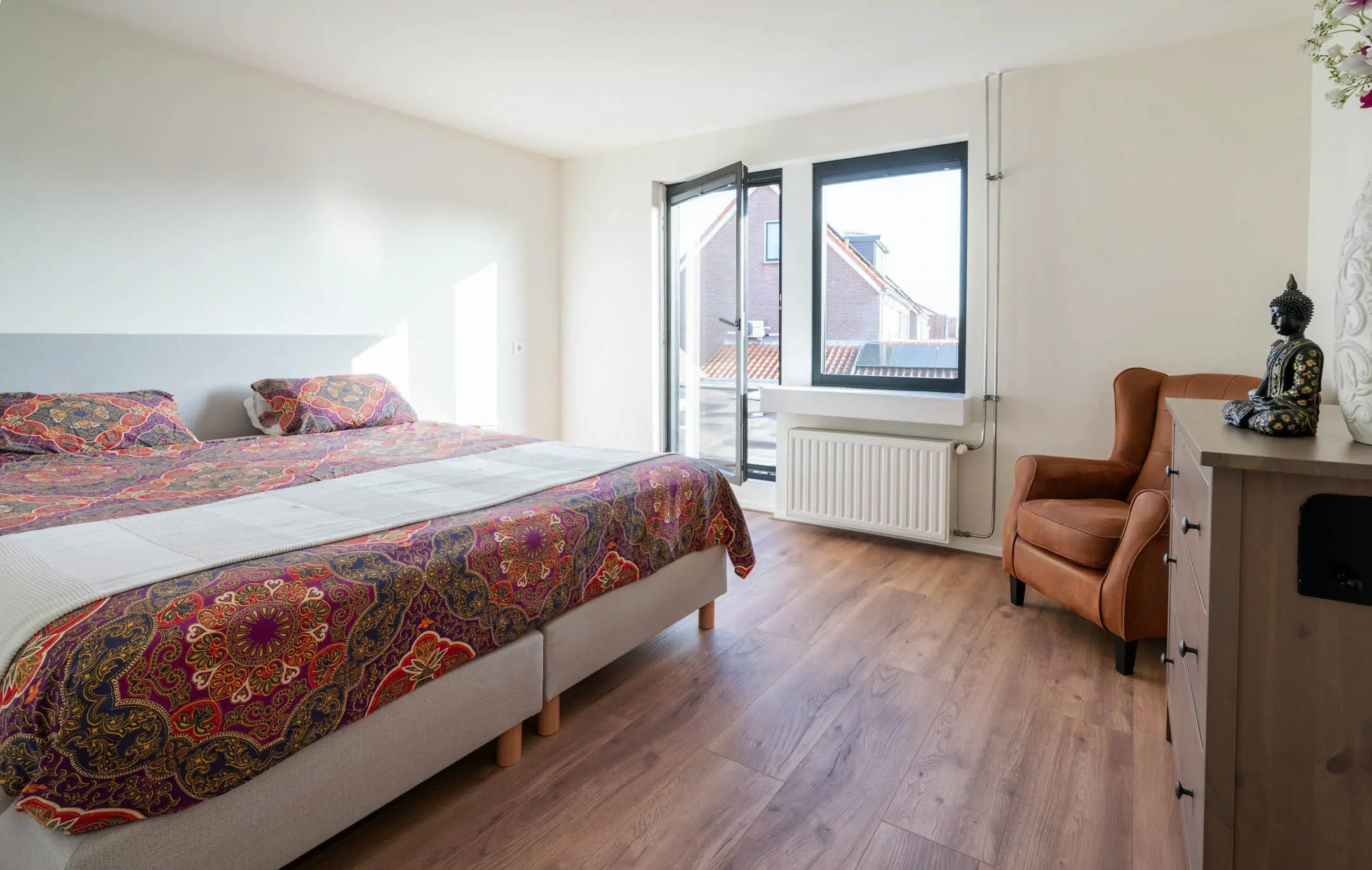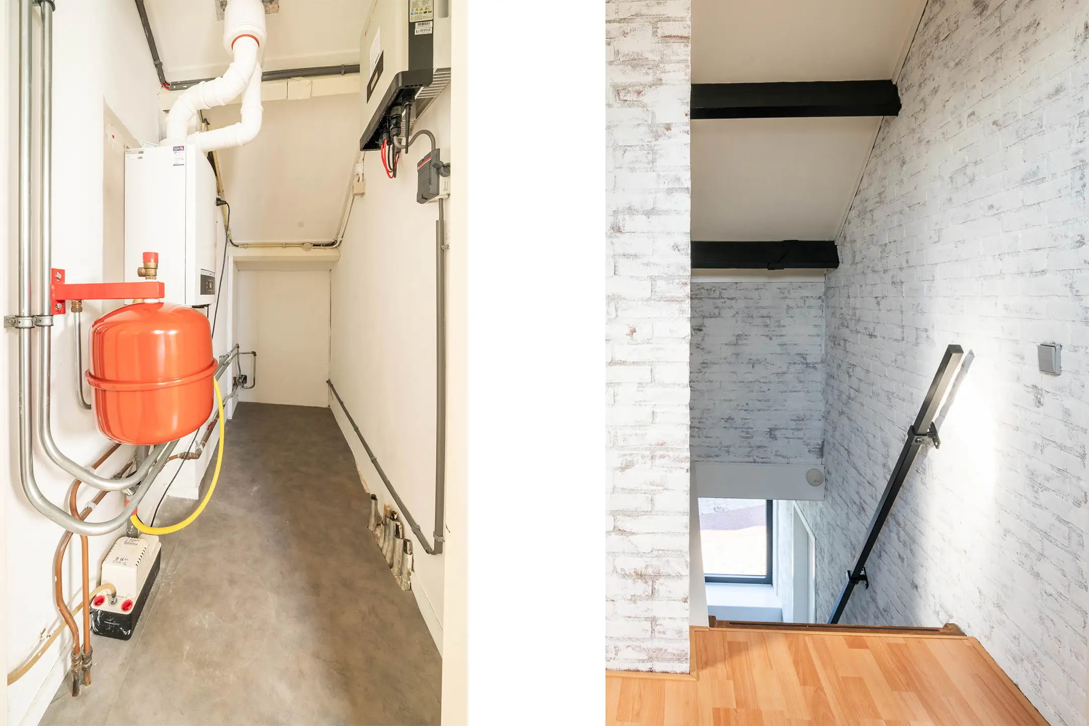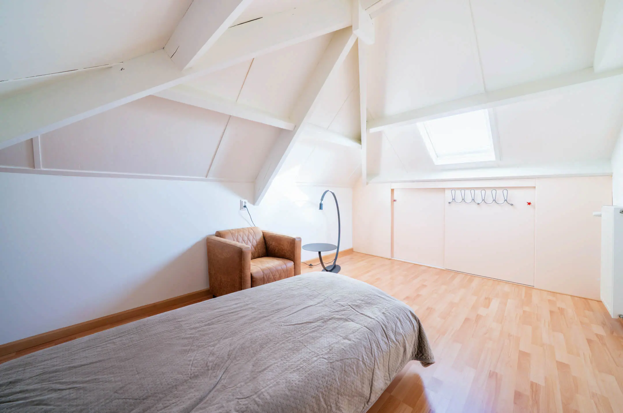Ook de tweede verdieping biedt verrassend veel ruimte. De overloop leidt naar een berging en de stookruimte, waar de CV-ketel (2024) en de omvormer van de zonnepanelen zijn geplaatst. Daarnaast zijn er nog twee royale slaapkamers, beide met dakvenster en knieschotbergingen. Alles is wederom netjes afgewerkt.