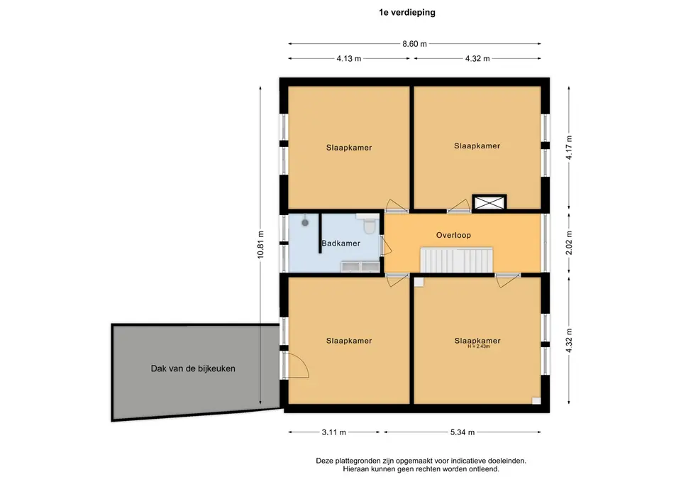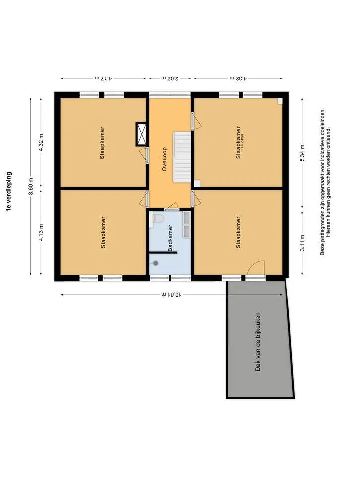 De grote overloop geeft toegang tot maar liefst vier zeer ruime slaapkamers, allemaal netjes afgewerkt. De moderne badkamer is voorzien van een douche, wastafelmeubel en toilet. Vanuit de overloop is een vaste trap naar de tweede verdieping aanwezig. Een extra pluspunt: de slaapkamer linksachter beschikt over een deur naar het platte dak.